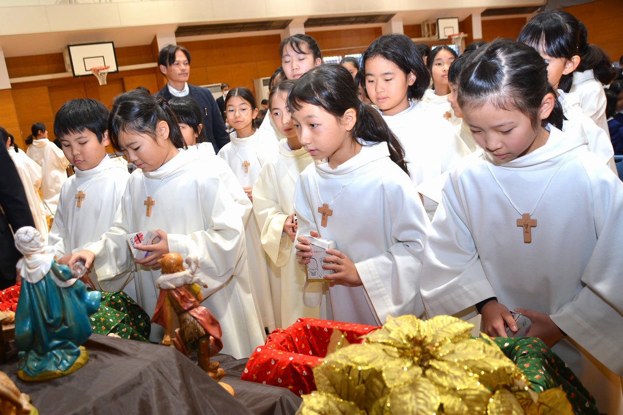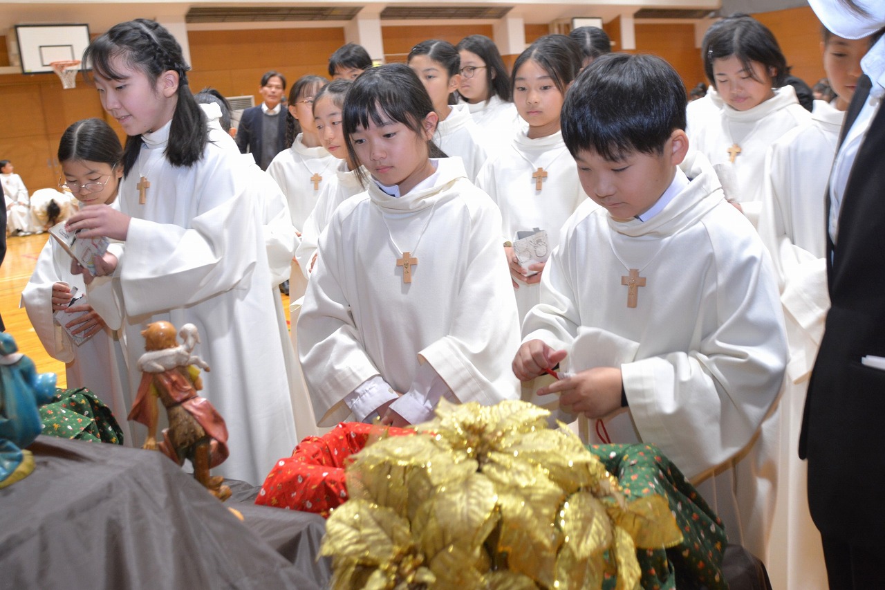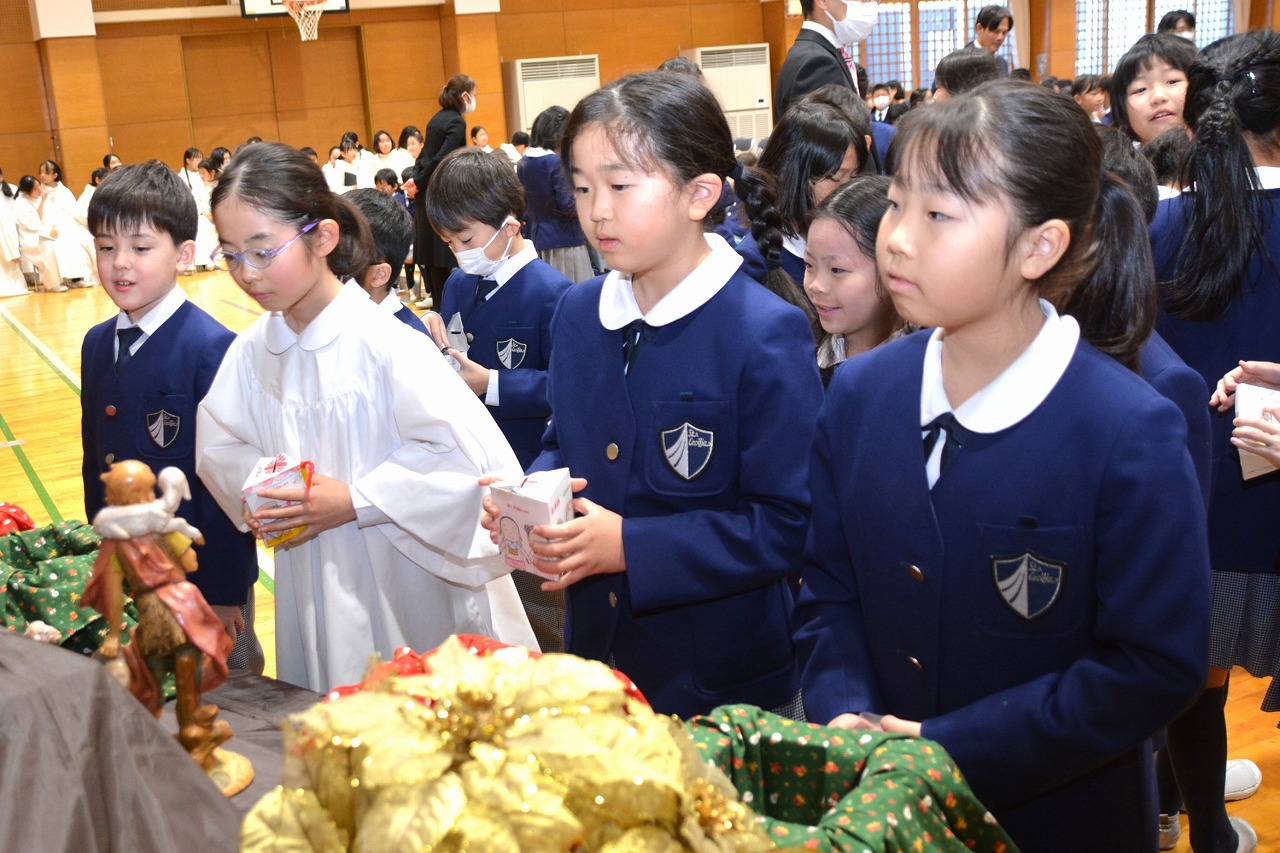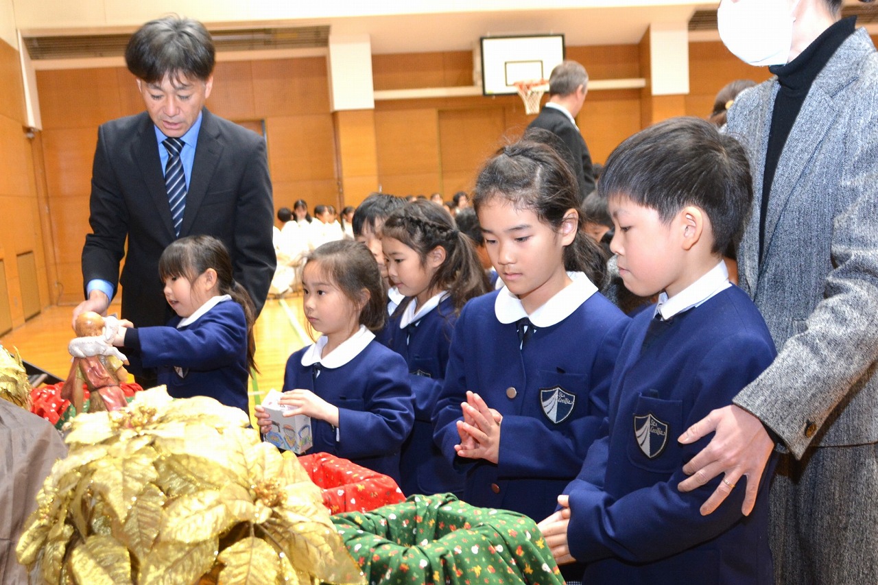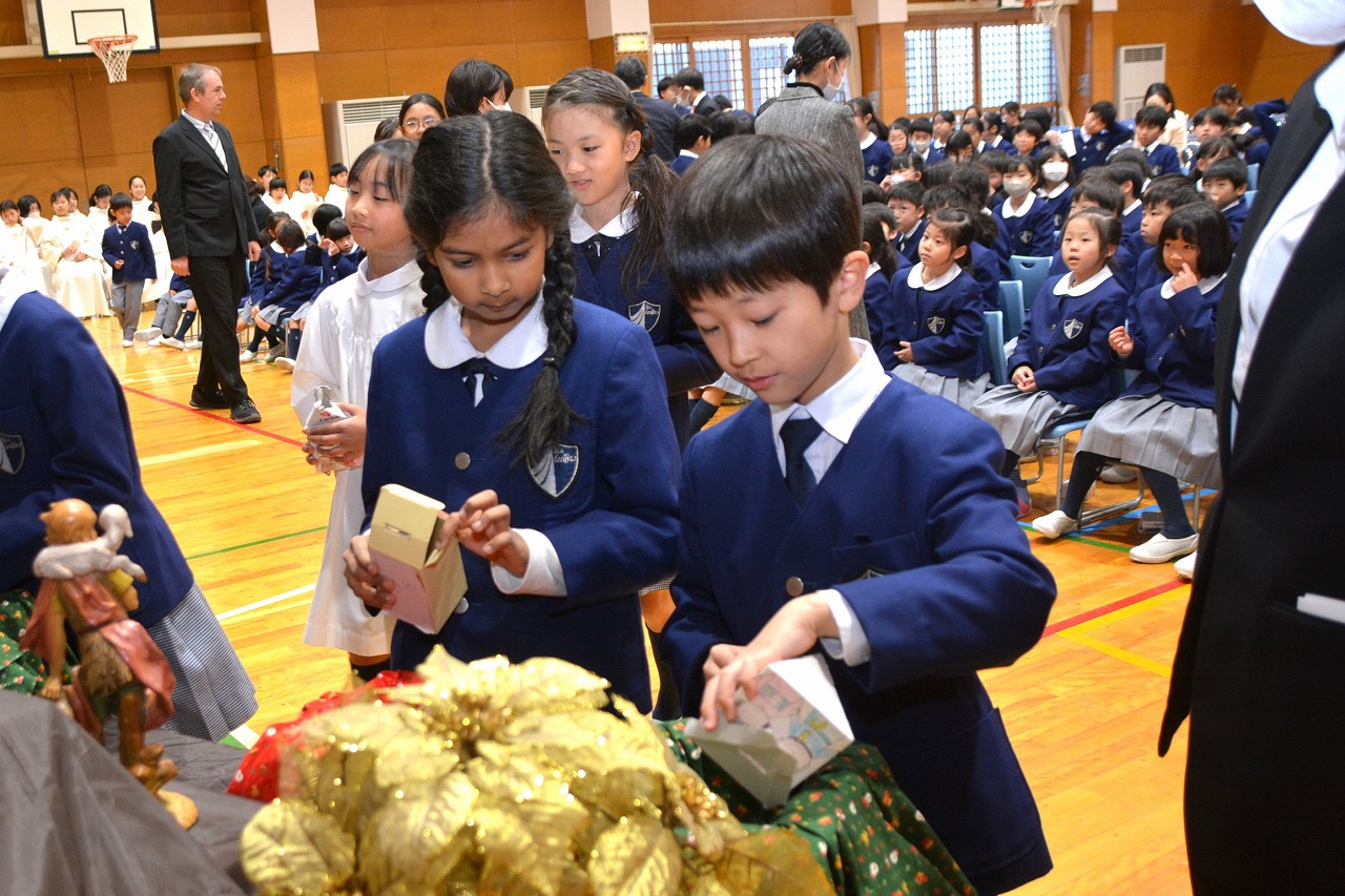 全校児童が一堂に会し、クリスマスミサに与りました。待降節の間、お手伝いをするなどして少しずつ貯めてきたおこづかいを気持ちを込めて献金しました。また、思いやりの心を大切にし、毎日の自分の行いを振り返りながら記してきた待降節カードも捧げました。ミサを通して、イエス・キリストの誕生を喜び祝うとともに、よいクリスマスを迎えられるようにお祈りしました。