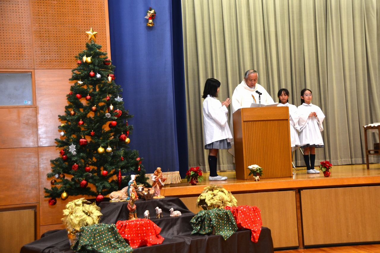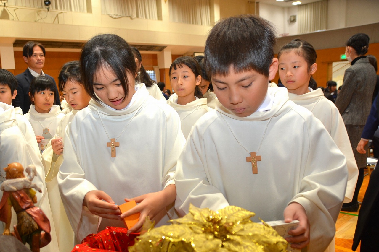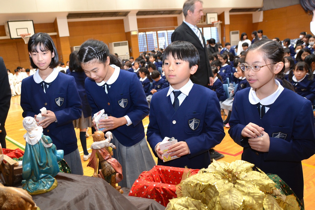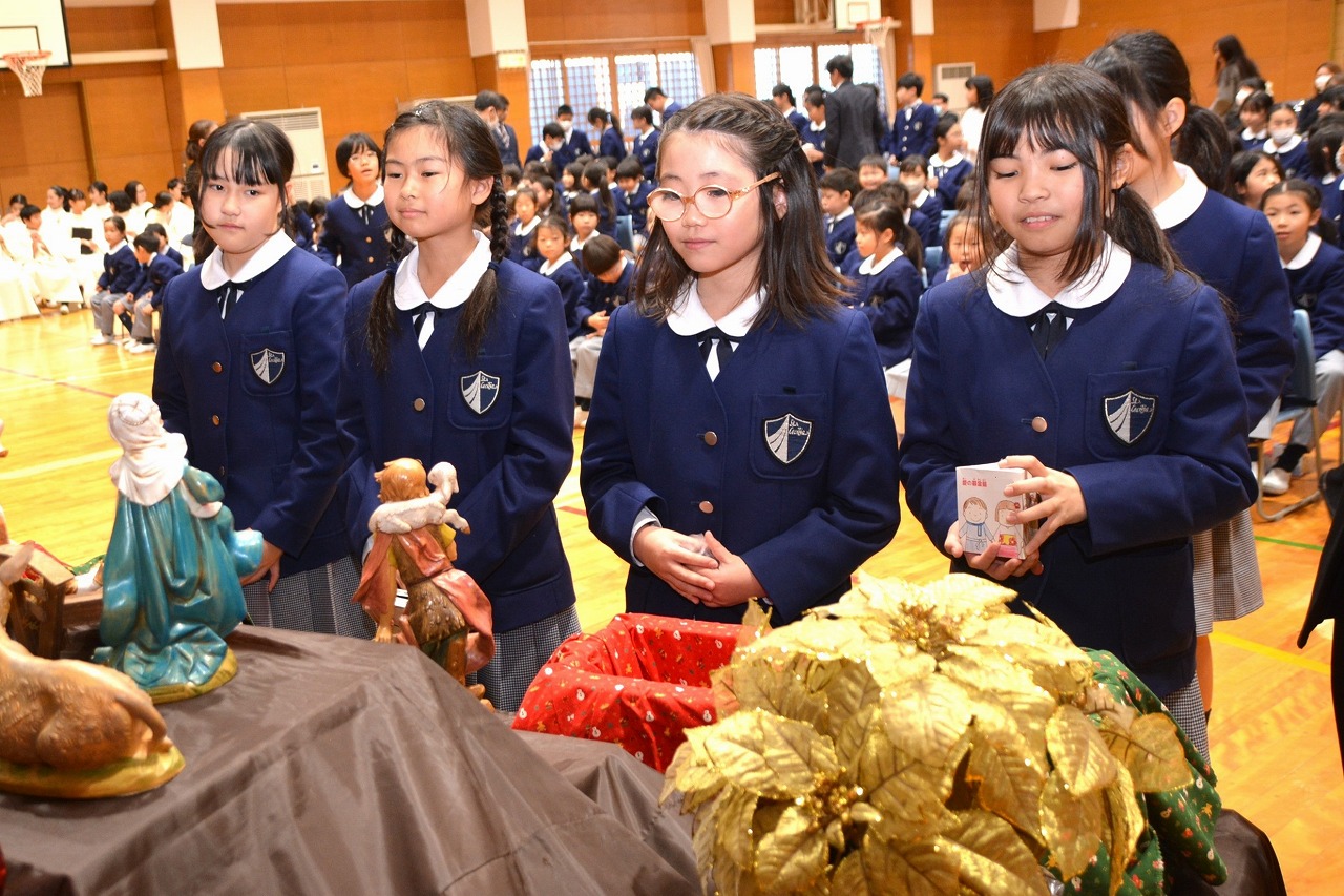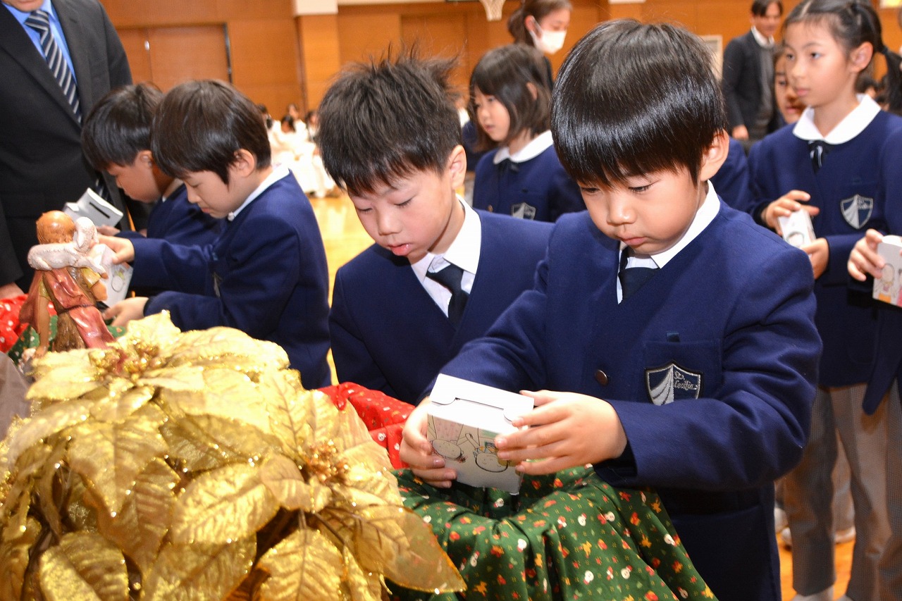 全校児童が一堂に会し、クリスマスミサに与りました。待降節の間、お手伝いをするなどして少しずつ貯めてきたおこづかいを気持ちを込めて献金しました。また、思いやりの心を大切にし、毎日の自分の行いを振り返りながら記してきた待降節カードも捧げました。ミサを通して、イエス・キリストの誕生を喜び祝うとともに、よいクリスマスを迎えられるようにお祈りしました。