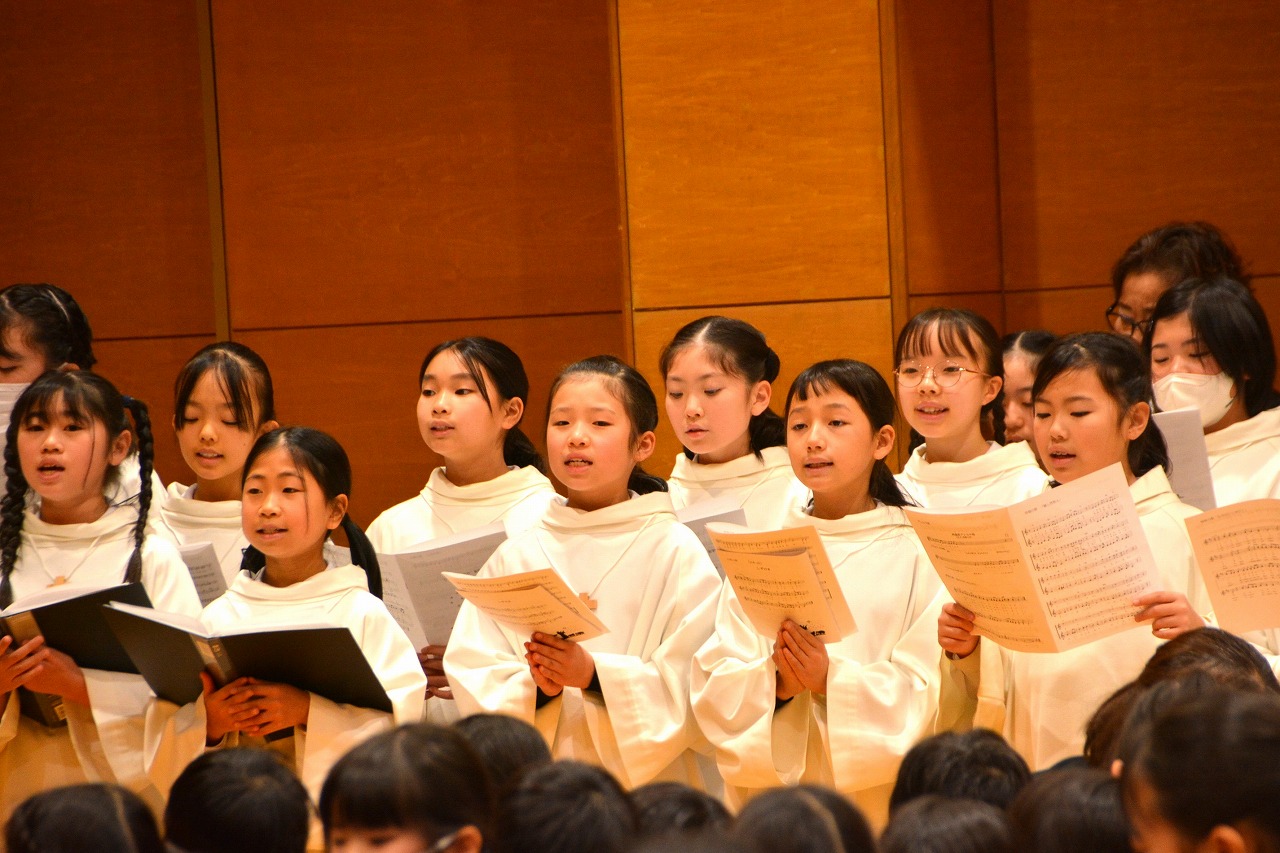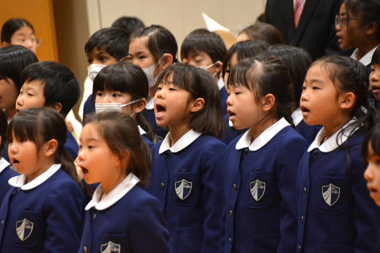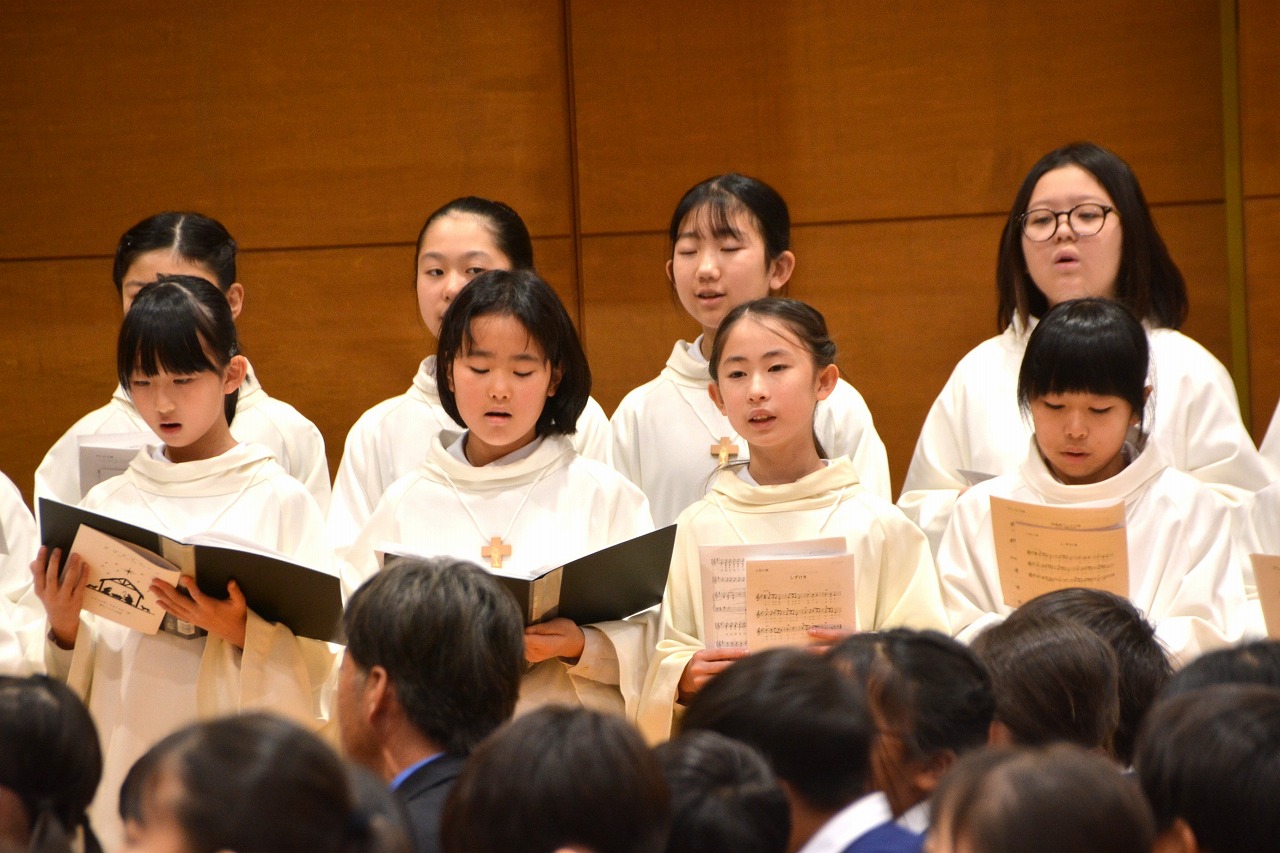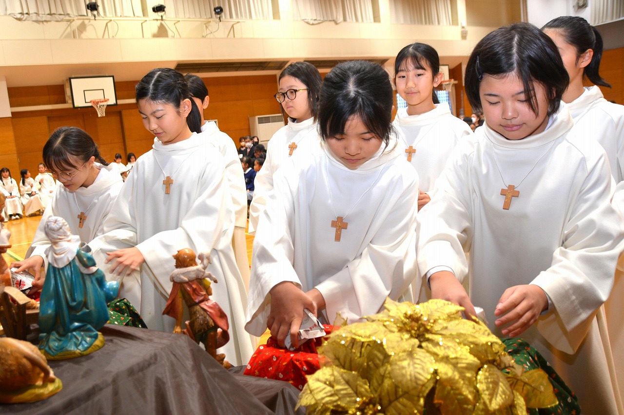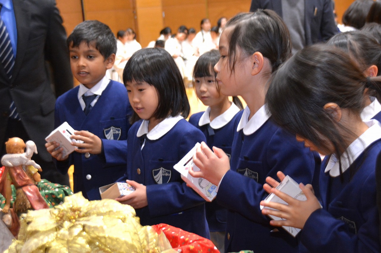 全校児童が一堂に会し、クリスマスミサに与りました。待降節の間、お手伝いをするなどして少しずつ貯めてきたおこづかいを気持ちを込めて献金しました。また、思いやりの心を大切にし、毎日の自分の行いを振り返りながら記してきた待降節カードも捧げました。ミサを通して、イエス・キリストの誕生を喜び祝うとともに、よいクリスマスを迎えられるようにお祈りしました。