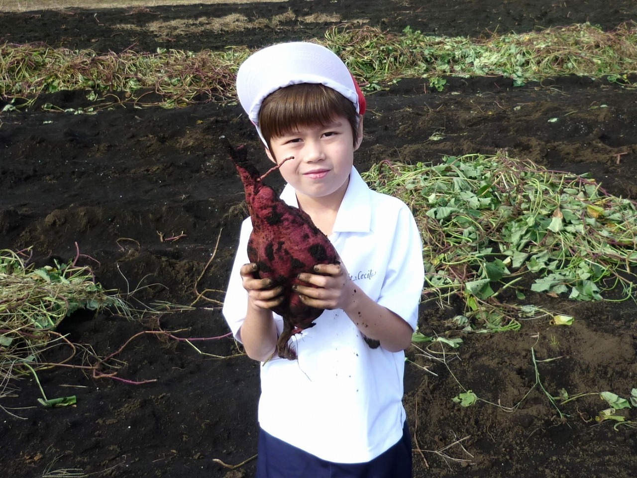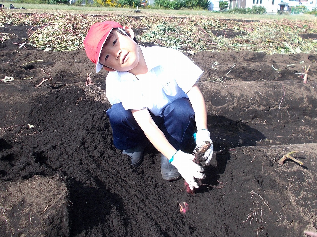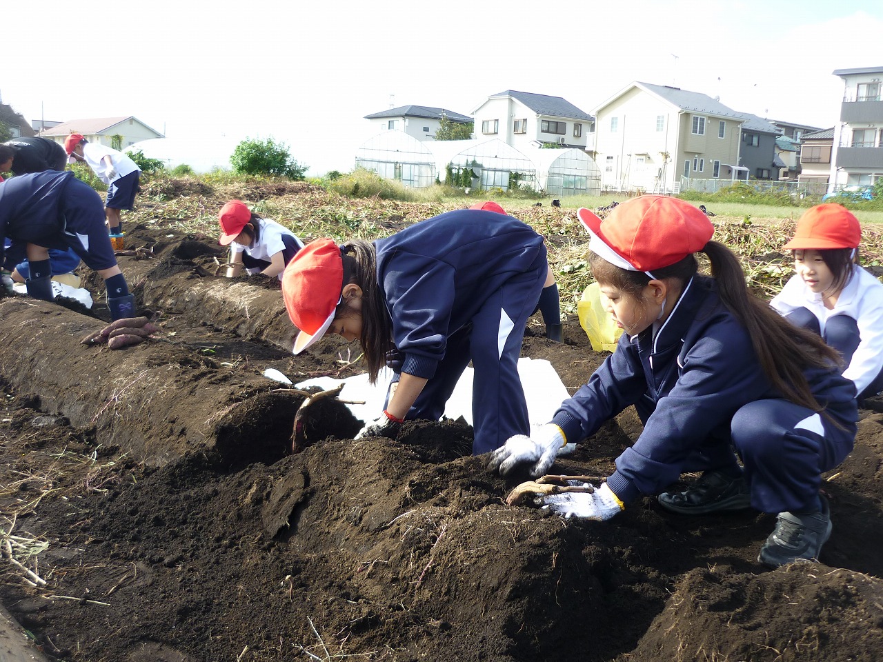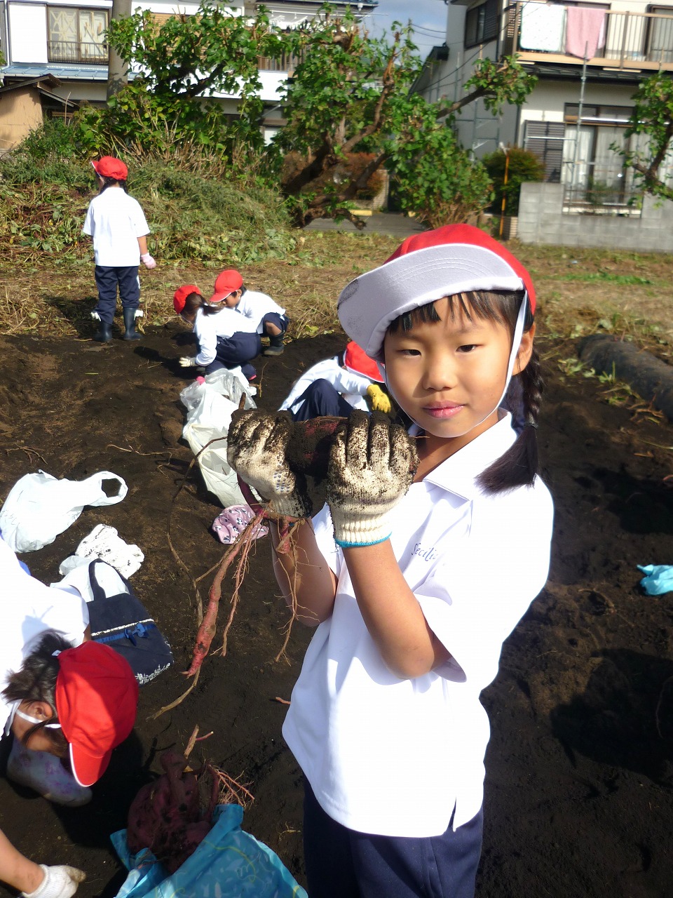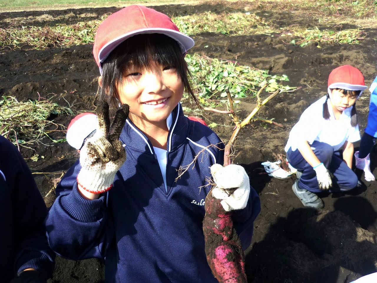 1年生は生活科の学習で「おいもほり」に行きました。農家の方から、さつまいも作りについてのお話をうかがった後、実際に自分の手でおいもを掘り起こしました。今年は、びっくりするほど大きなおいもが出てきたり、目を見開くほど小さなおいもが出てきたりと、おいもの大きさにも個性があふれていました。「わあ、大きい~」「かわいい~」など、掘り出すたびに、子どもたちの驚きの声があがっていました。収穫の喜びを味わえる体験となりました。