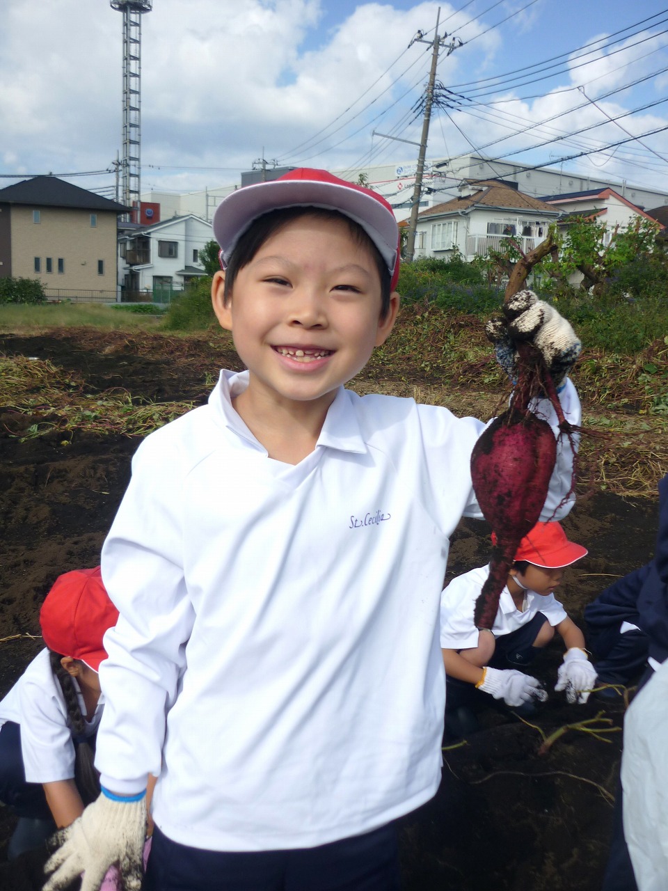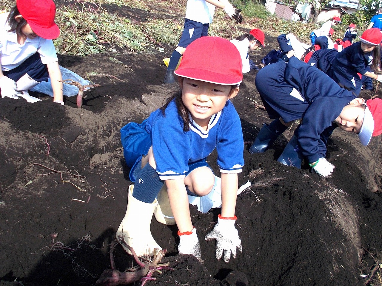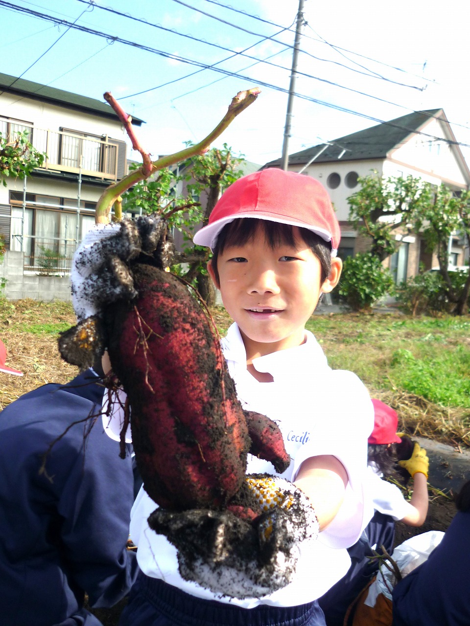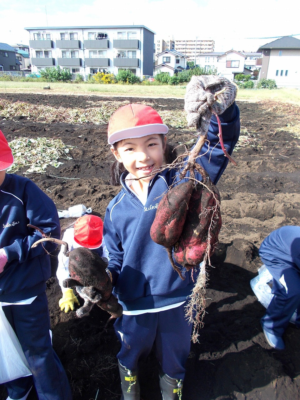 1年生は生活科の学習で「おいもほり」に行きました。農家の方から、さつまいも作りについてのお話をうかがった後、実際に自分の手でおいもを掘り起こしました。今年は、びっくりするほど大きなおいもが出てきたり、目を見開くほど小さなおいもが出てきたりと、おいもの大きさにも個性があふれていました。「わあ、大きい~」「かわいい~」など、掘り出すたびに、子どもたちの驚きの声があがっていました。収穫の喜びを味わえる体験となりました。
