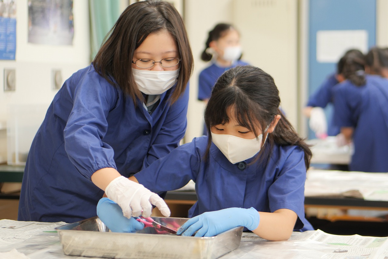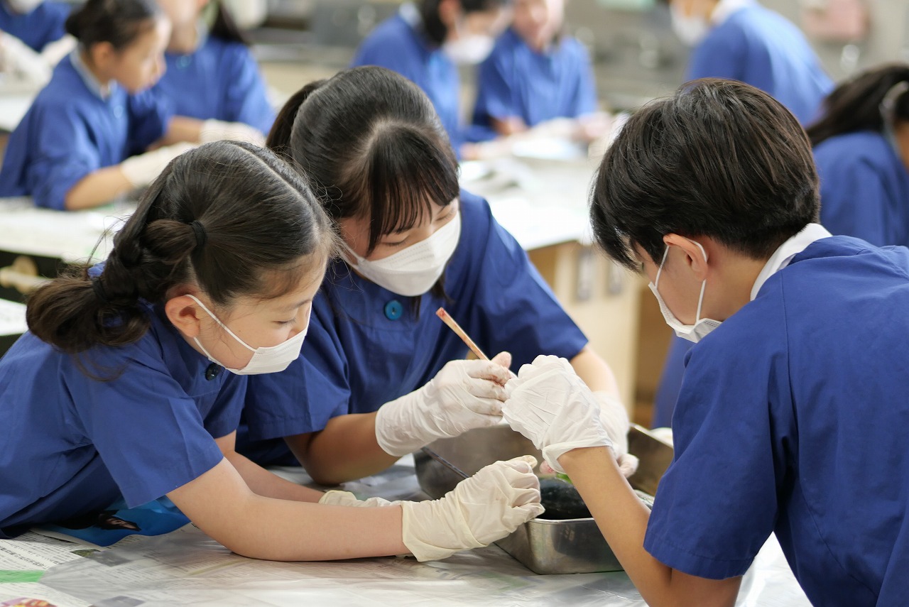 最初はおそるおそる魚を触っていた子どもたちでしたが、すぐに魚の扱いにも慣れ、積極的に活動することができました。実際に魚の口の中に手を入れて歯を触り、人の歯と役割が違うことを確認したり、人と同じような場所に心臓があることなどを確認したりしました。また、胃の中からは消化された小魚が出てきて、子どもたちはびっくり。消化と吸収の仕組みも確認することもできました。その他、肝臓やエラの様子、目のつくりなども観察し、本物に触れているからこそできる学びを体験することができました。
