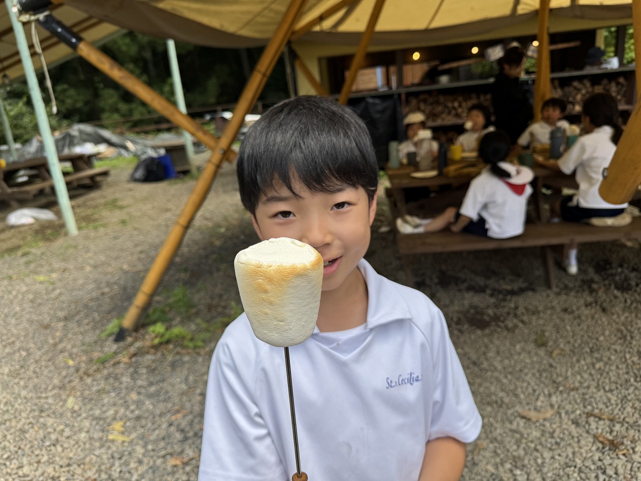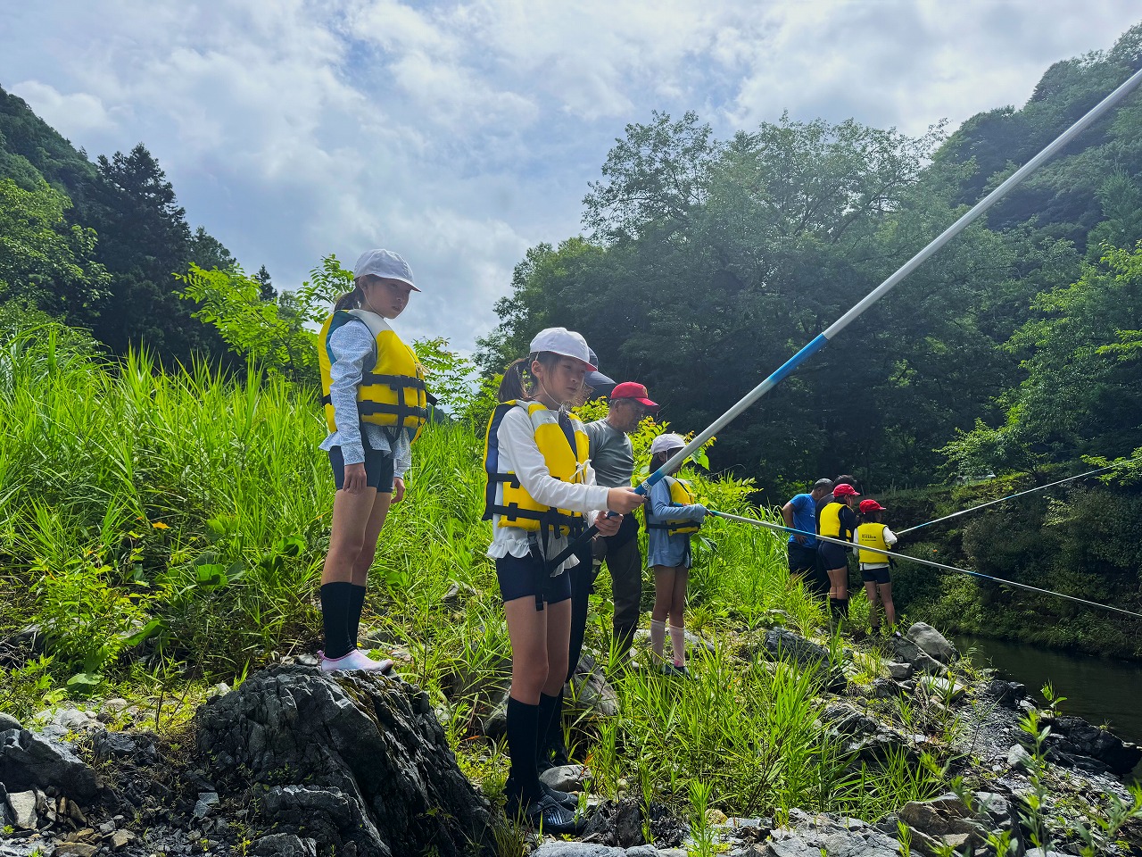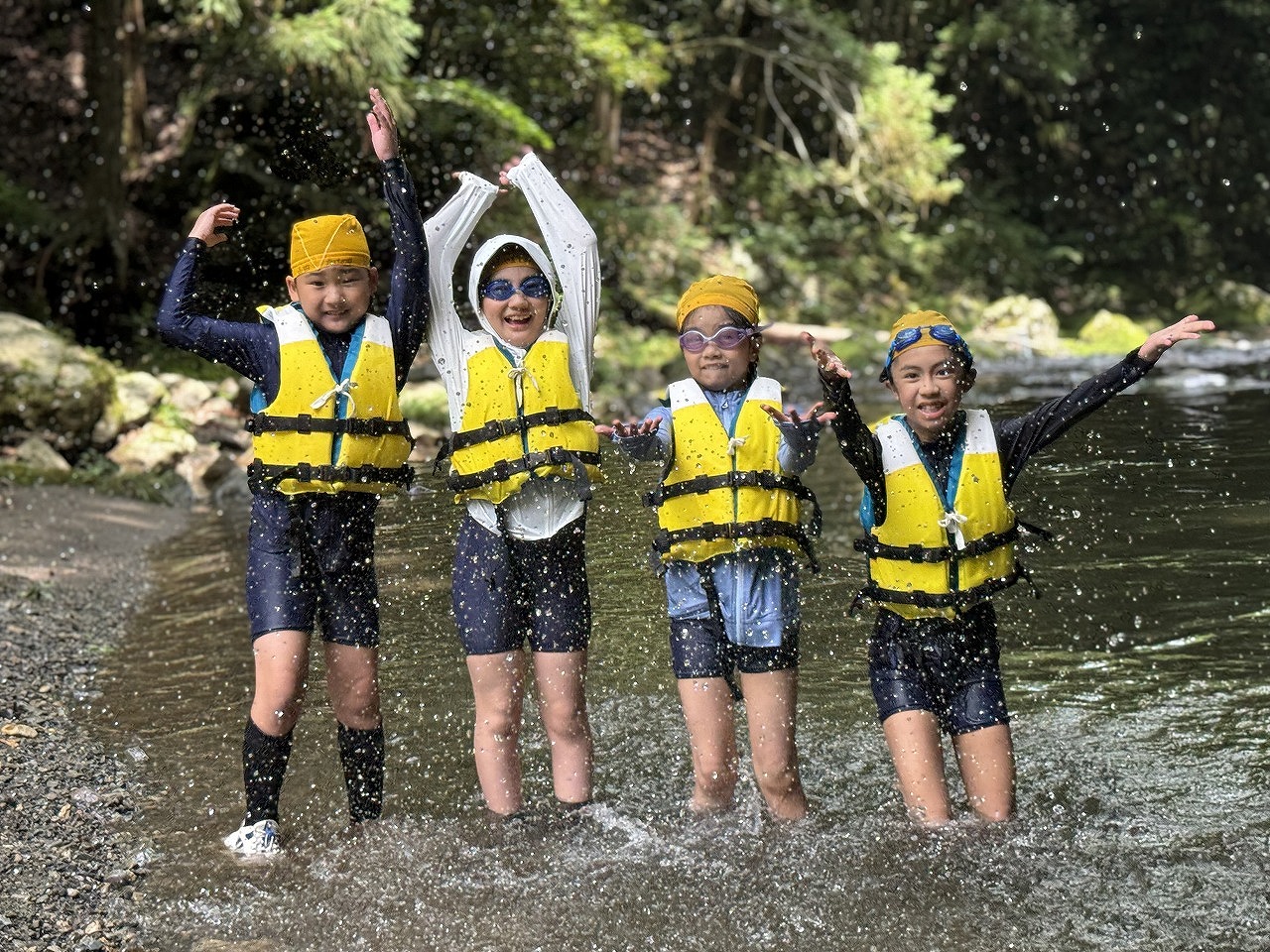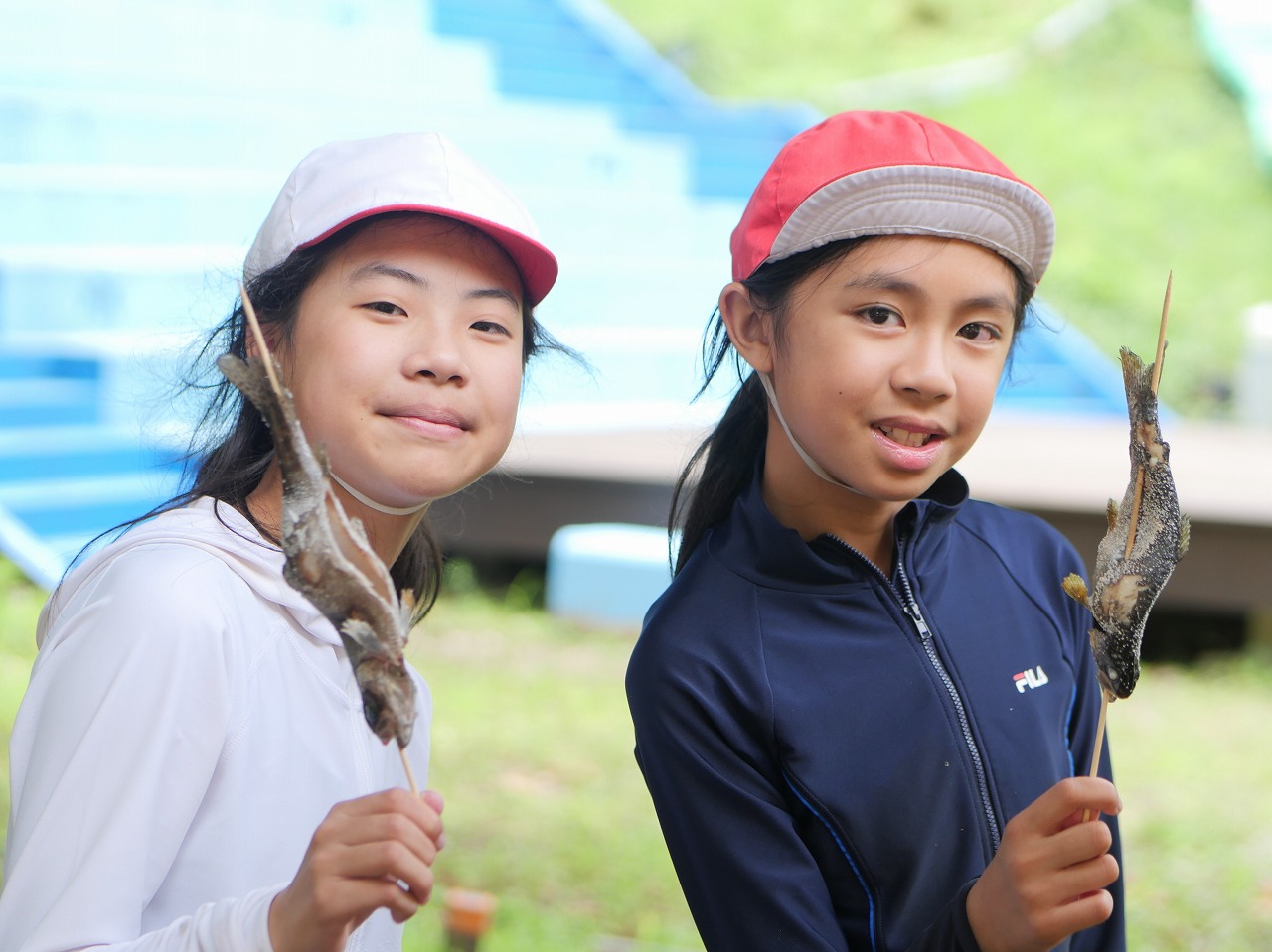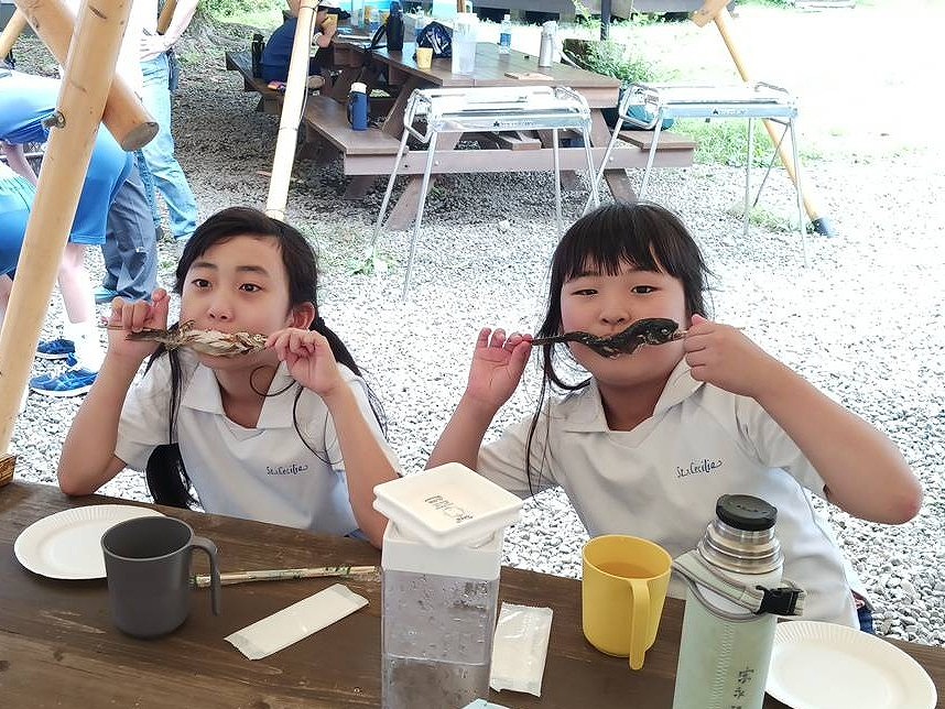 3年生はOutdoor School、4年生はNature Campをそれぞれ2泊3日で実施しました。川では、水遊びはもちろんのこと、天然のウォータースライダーや沢登りにもチャレンジしました。また、オタマジャクシやヤゴ、川虫などの生き物探しをしたり、ヤマメやアユ、ハヤなどを釣ったりと、清流ならではの貴重な体験も楽しみました。自分の手で捕まえたニジマスを自分の手でさばき、マッチを使って、火をおこし、塩焼きにしておいしくいただいたり、夕食のバーベキューやカレーライス、朝食のホットサンドやベーコンエッグマフィンなども、自分たちの手で作ったりするなどの体験も行いました。その他、昆虫採集や暗闇体験、スイカ割り、キャンプファイアー、花火など、子どもたちの五感をフルに刺激する3日間でした。