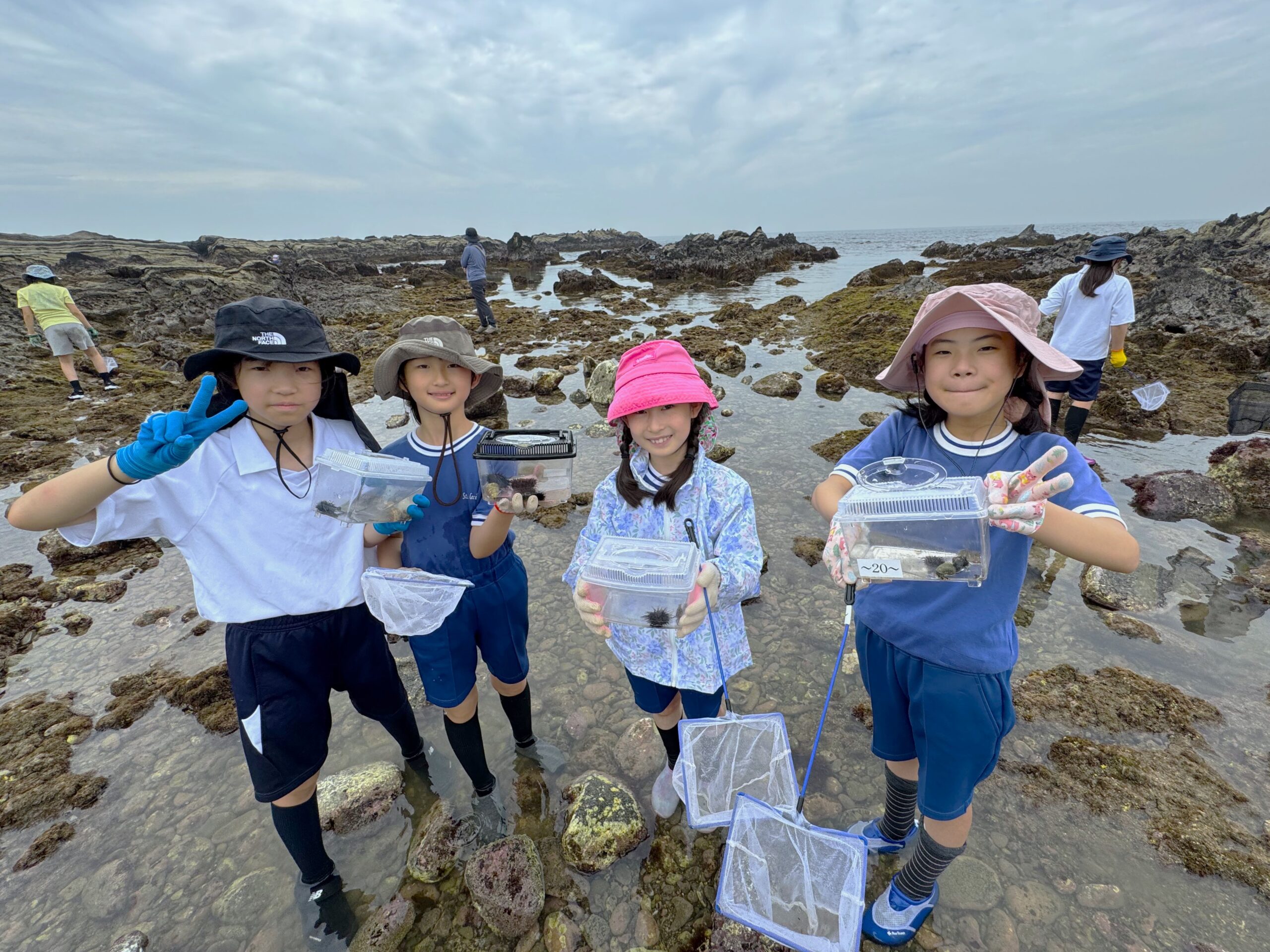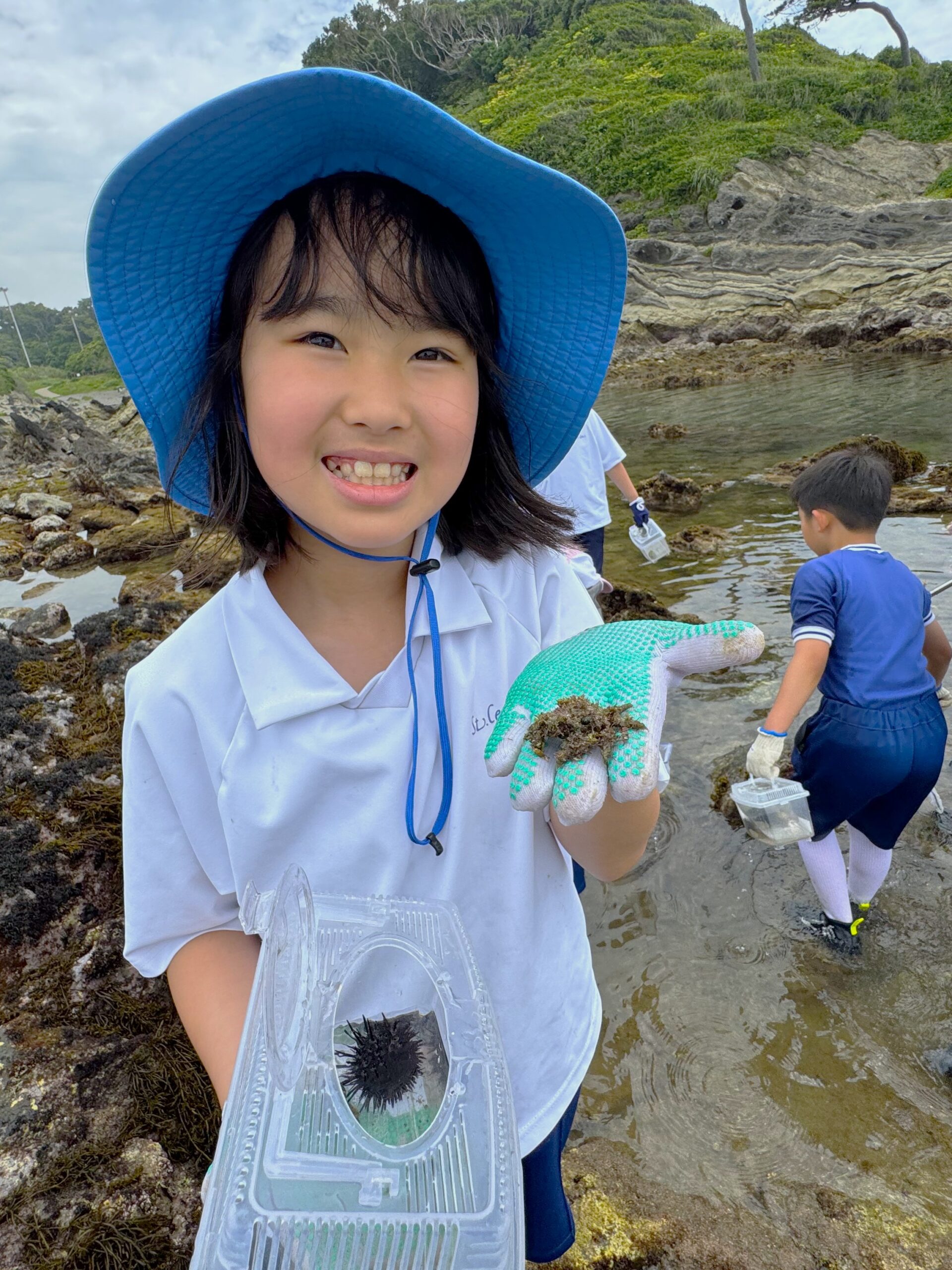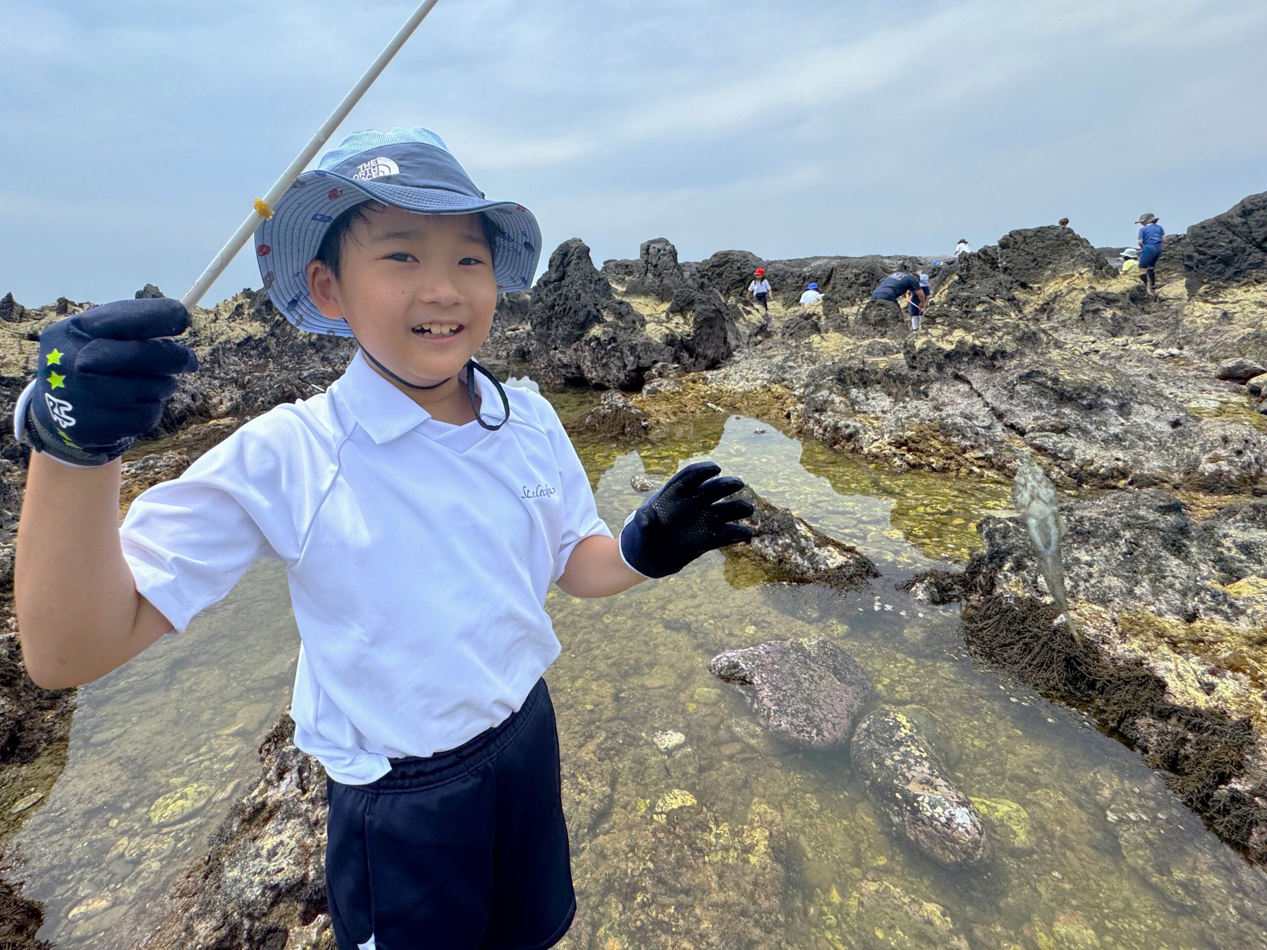 さて、皆さんは「タイドプール」という言葉をご存じですか。磯などで海水が引いたときにできる「潮だまり」(大きな水たまり)のことをタイドプールといいますが、先日、理科の体験学習の一環で、このタイドプールにいる生物を観察する「磯の観察会」を行いました。タイドプールは、一見、何の生物もいないように見えますが、よく観察すると石の裏や海藻の中などにたくさんの生き物を見つけることができます。カニやヤドカリ、エビ、イソギンチャク、ウニ、ヒトデ、ナマコ、アメフラシなど、子どもたちにとって、生まれて初めて見る生きた海の生物は、驚きの連続だったようで、「キャー」「ワァー」「ウォー」という歓声があちこちから聞こえてきました。普段見ている陸上の生物では見られないような変わった形や色をしているもの、変な動きをするものなど、子どもたちにとってタイドプールは「異次元空間」のように感じられたことでしょう。