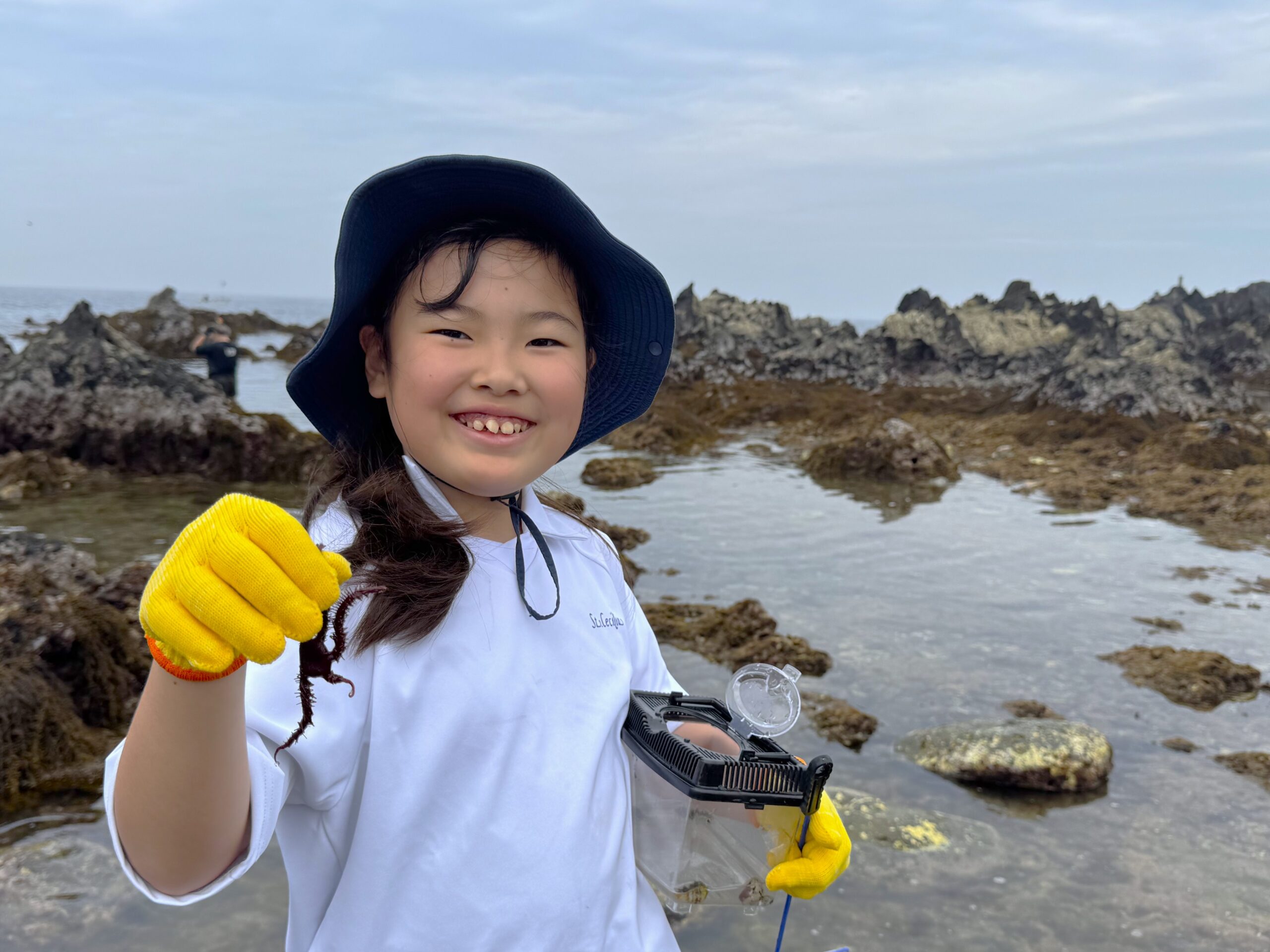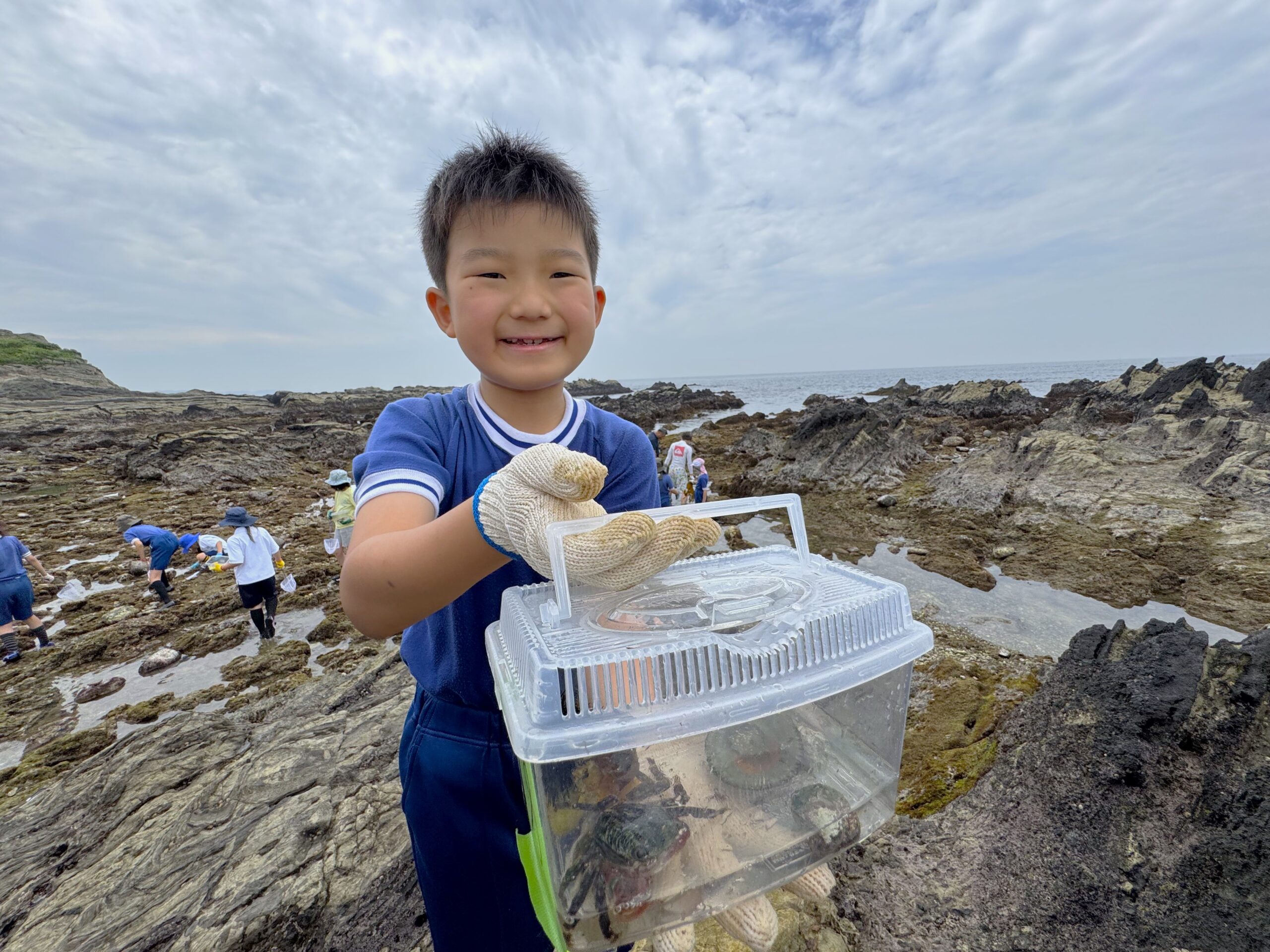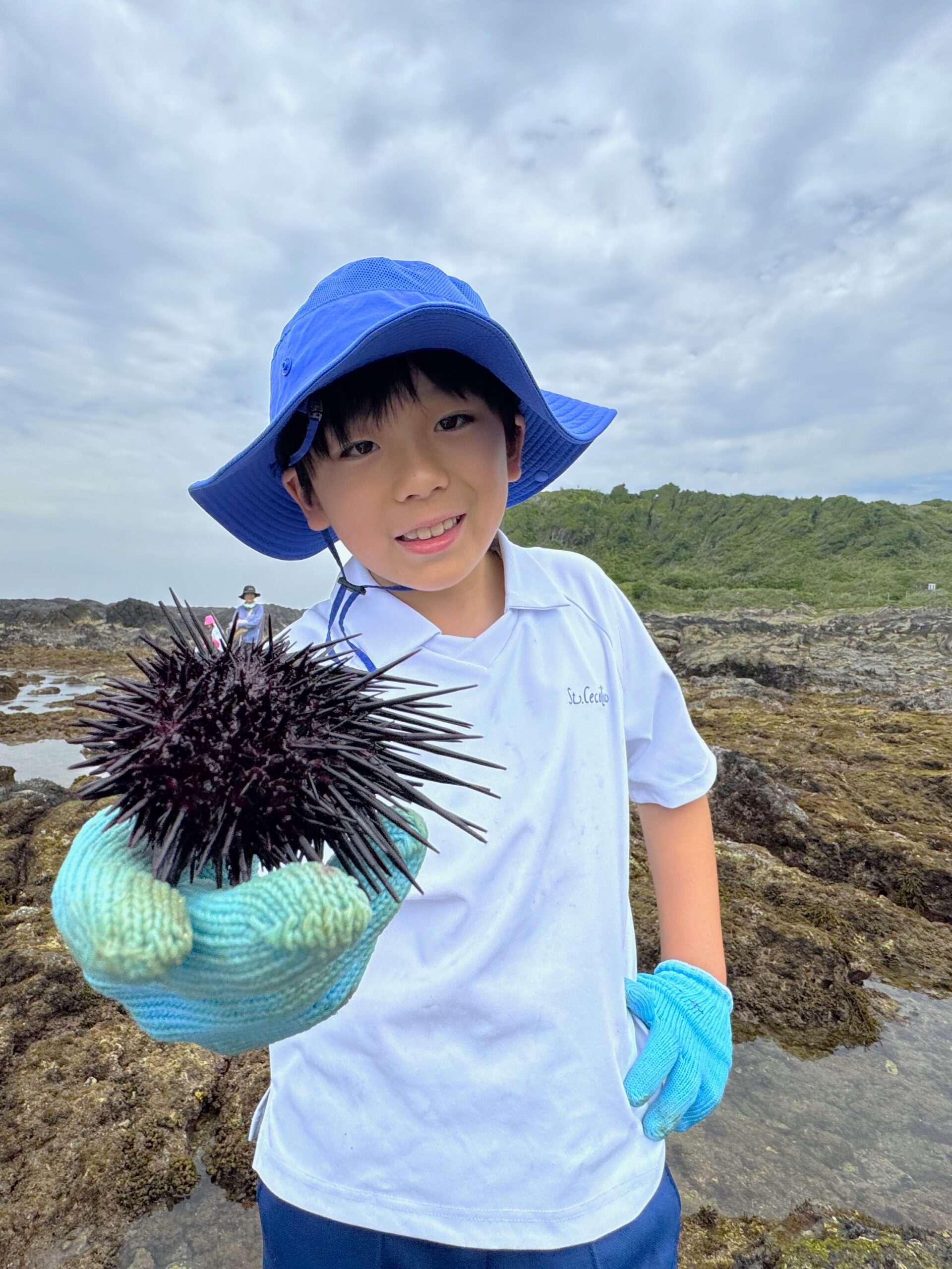 さて、皆さんは「タイドプール」という言葉をご存じですか。磯などで海水が引いたときにできる「潮だまり」(大きな水たまり)のことをタイドプールといいますが、先日、理科の体験学習の一環で、このタイドプールにいる生物を観察する「磯の観察会」を行いました。タイドプールは、一見、何の生物もいないように見えますが、よく観察すると石の裏や海藻の中などにたくさんの生き物を見つけることができます。カニやヤドカリ、エビ、イソギンチャク、ウニ、ヒトデ、ナマコ、アメフラシなど、子どもたちにとって、生まれて初めて見る生きた海の生物は、驚きの連続だったようで、「キャー」「ワァー」「ウォー」という歓声があちこちから聞こえてきました。普段見ている陸上の生物では見られないような変わった形や色をしているもの、変な動きをするものなど、子どもたちにとってタイドプールは「異次元空間」のように感じられたことでしょう。