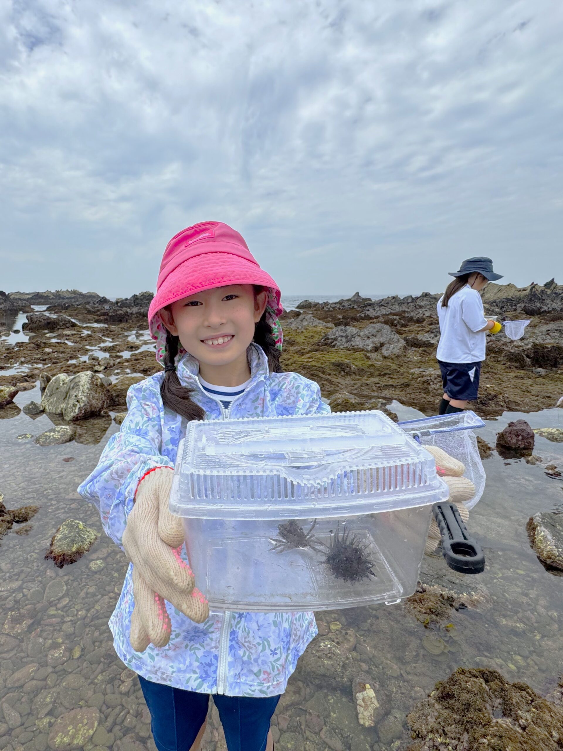 「紫色の液を見たかったら、勇気を出して触ってごらん。怖くないから」というと、しばらく黙っていましたが、意を決したようで、おそるおそる人差し指をタツナミガイに近づけて…ちょんと触ることができました。触れたということが嬉しかったのか、さっきまでの不安そうな顔が、一気に笑顔に変わりました。でも、紫の液体は出ません。