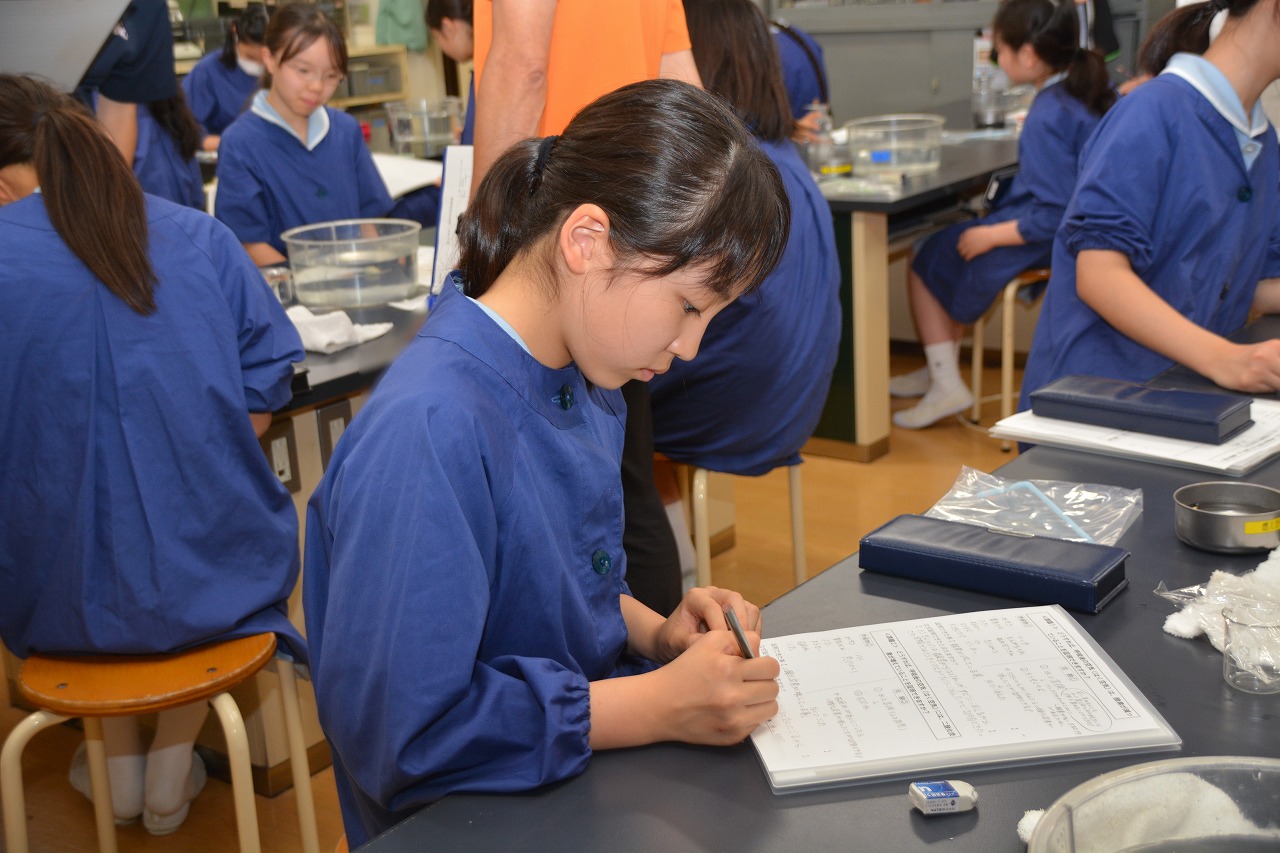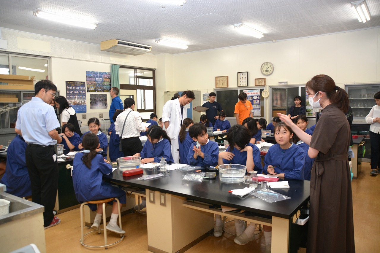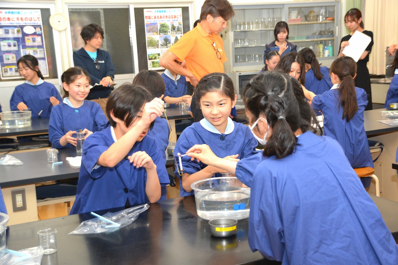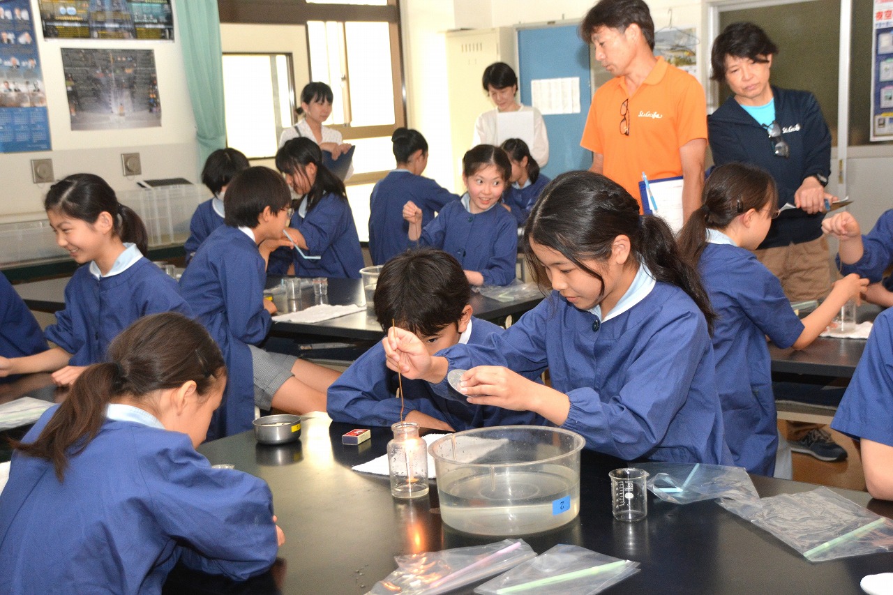 全教職員が参加して、6年生理科の研究授業を行いました。授業では「吐く息は、吸う空気に比べ、酸素が減っていて、二酸化炭素が増えていること」をどのようにしたら証明できるかを考え、それを示すための実験を行いました。子どもたちは見られることにも慣れていて、多くの教員に囲まれてもいつも通り楽しそう実験を進めていました。
