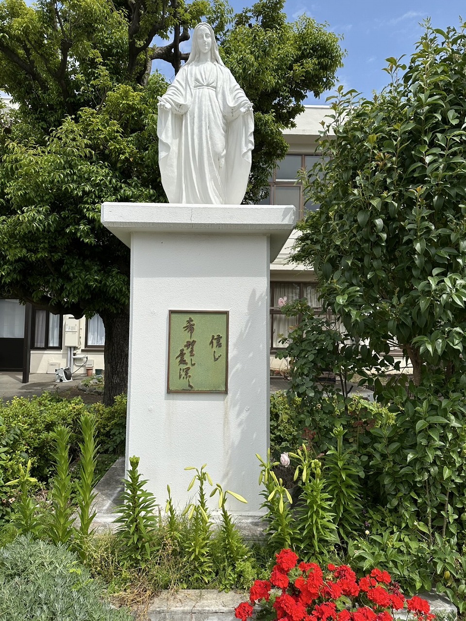 校庭のマリア様のそばに、「St. Cecilia(聖セシリア)」という品種のバラが咲いています。このバラは、イングリッシュローズの一種で、1987年にイギリスのデビッド・オースチンが作った品種です。聖女セシリアの名を由来として名づけられたこのバラは、淡いピンク色をしています。聖セシリアの名にふさわしい気高さを備えた美しいバラの花は、マリア様の下で静かに輝いています。