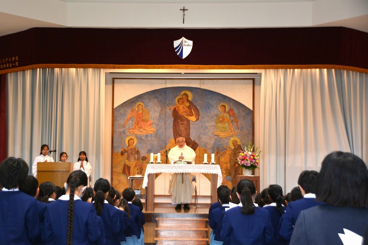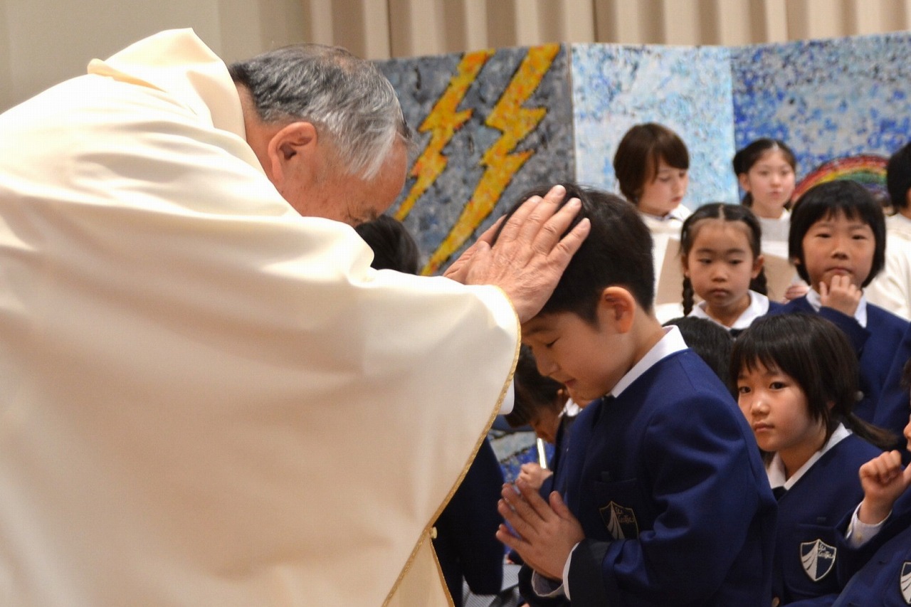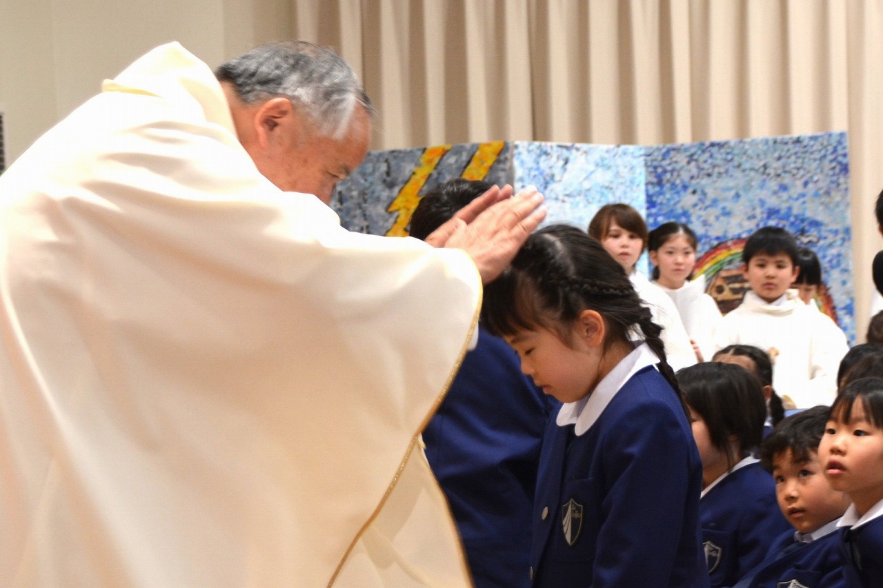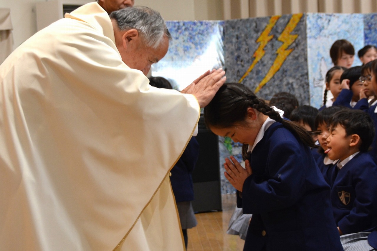 新1年生の入学をお祝いする入学感謝ミサに与りました。新入生を迎え、新しい友達がたくさんできたことに感謝しました。また、新1年生と保護者の方々は、神父様からひとり一人ご祝福もいただきました。