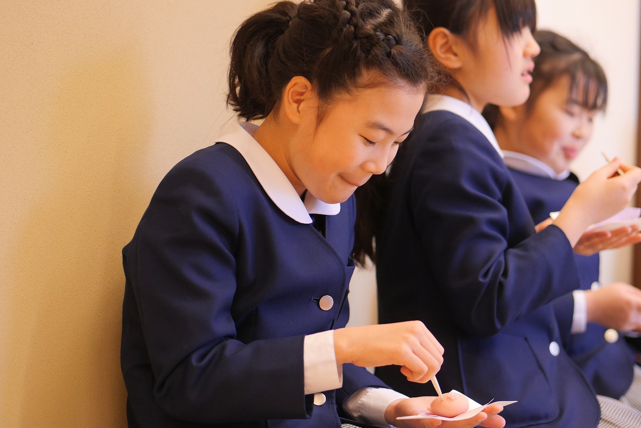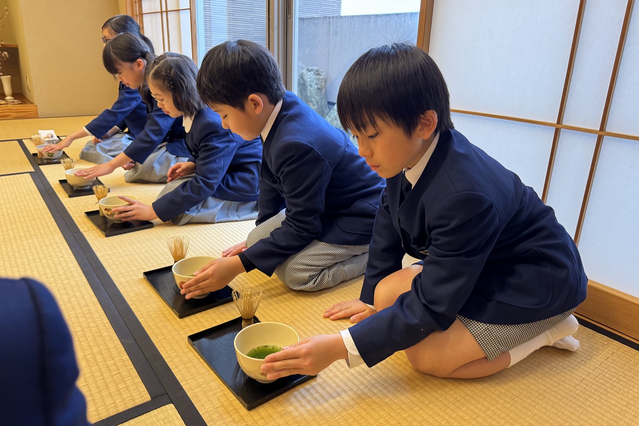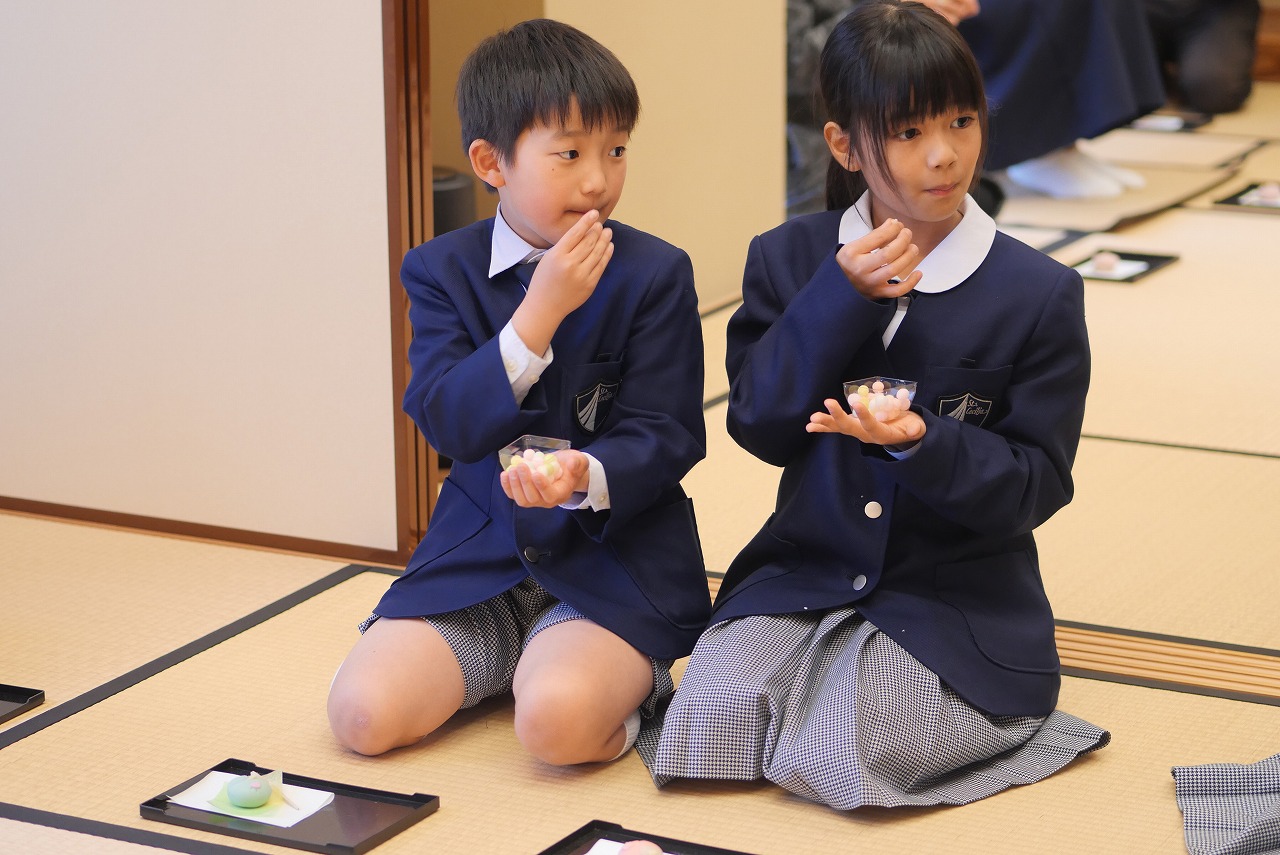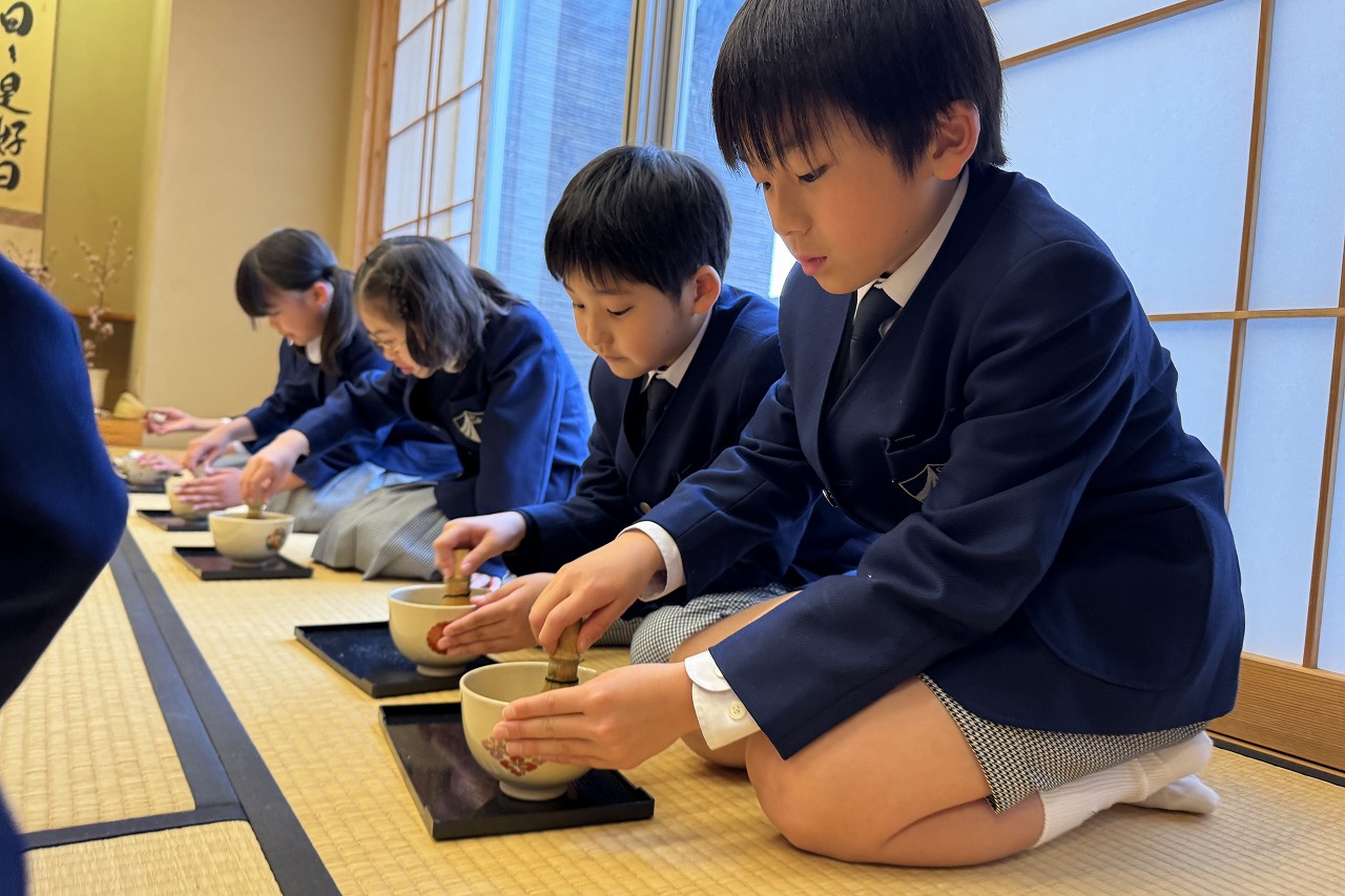 3年生の「マナー講座」を実施しました。講師の先生は本校の卒業生です。今回の講座では、前回教えていただいた和室への入り方、畳の歩き方、床の間の拝見のしかたなどを実践した後に「お茶の点て方」を学びました。「子どもにこそ本物を」という講師の先生の想いから、京都の高級な抹茶とお雛様の季節に合わせて特別につくっていただいた和菓子を用意していただきました。子どもたちは、お茶の苦さに驚きながらも、最後までしっかりとお茶を飲み切っていました。