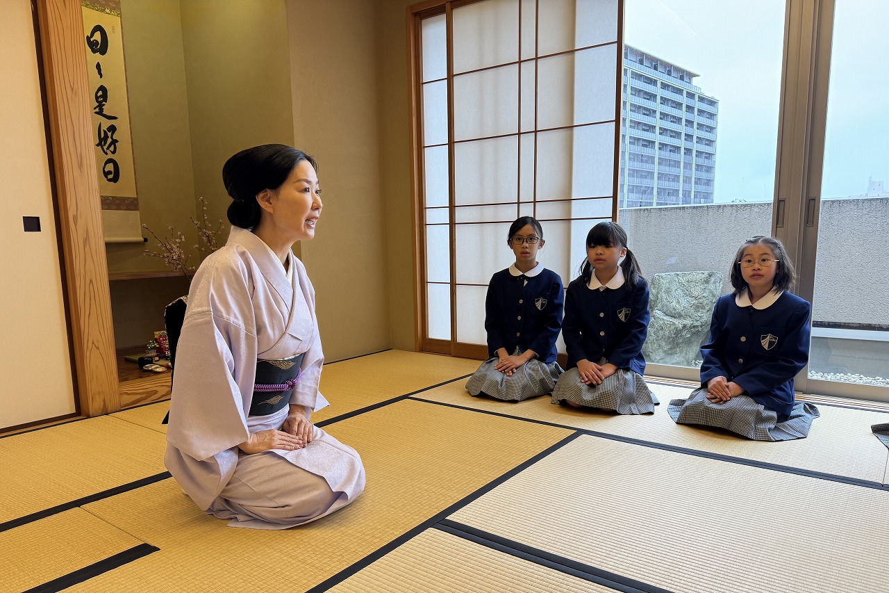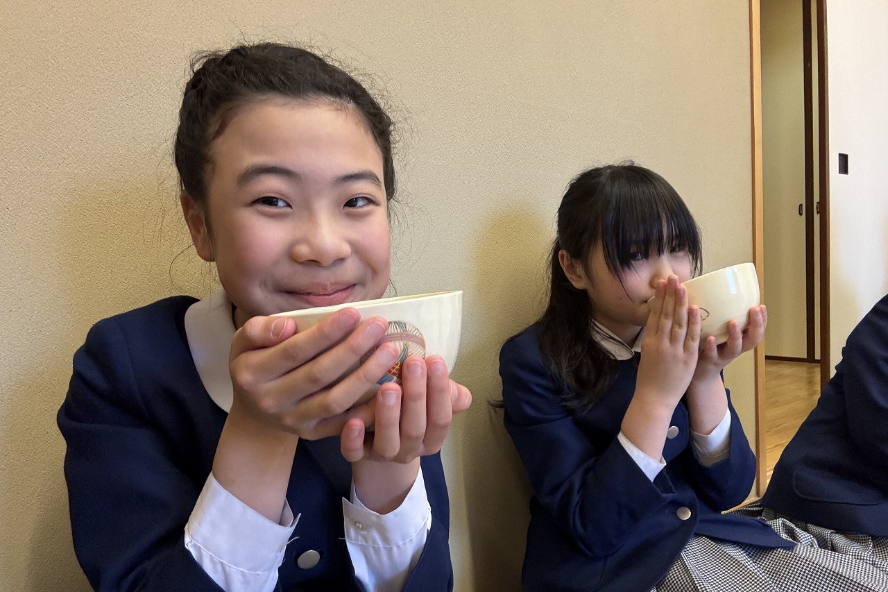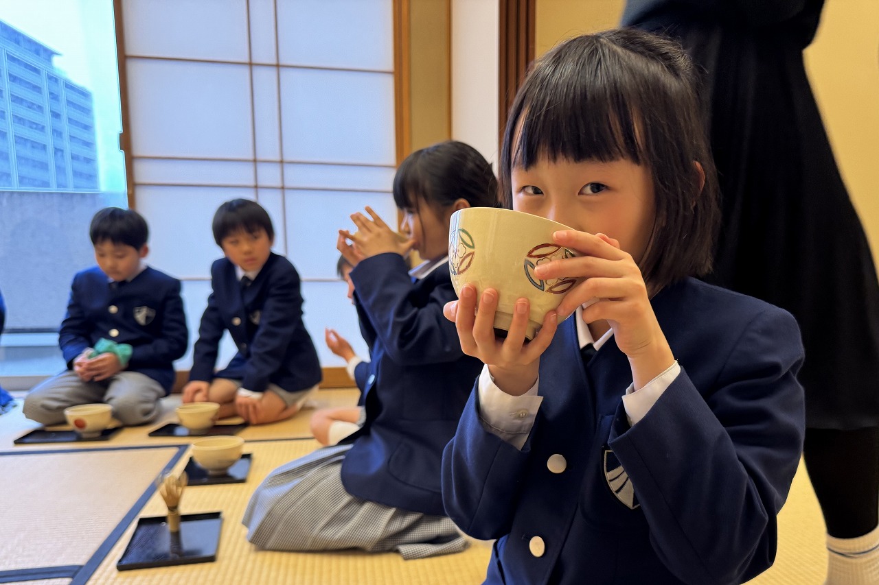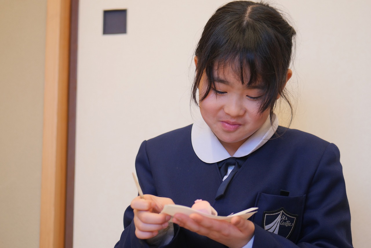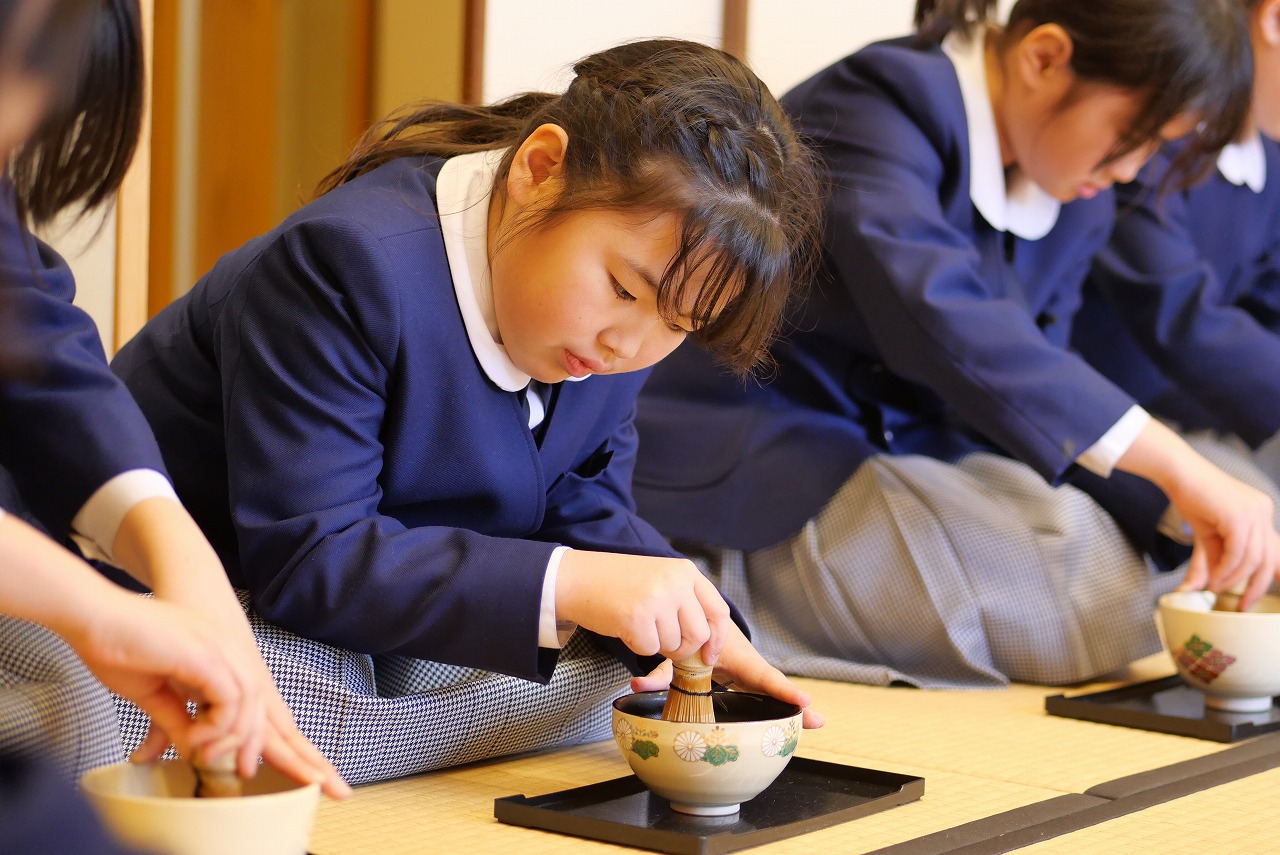 3年生の「マナー講座」を実施しました。講師の先生は本校の卒業生です。今回の講座では、前回教えていただいた和室への入り方、畳の歩き方、床の間の拝見のしかたなどを実践した後に「お茶の点て方」を学びました。「子どもにこそ本物を」という講師の先生の想いから、京都の高級な抹茶とお雛様の季節に合わせて特別につくっていただいた和菓子を用意していただきました。子どもたちは、お茶の苦さに驚きながらも、最後までしっかりとお茶を飲み切っていました。
