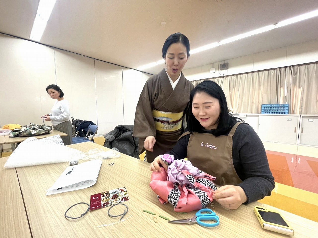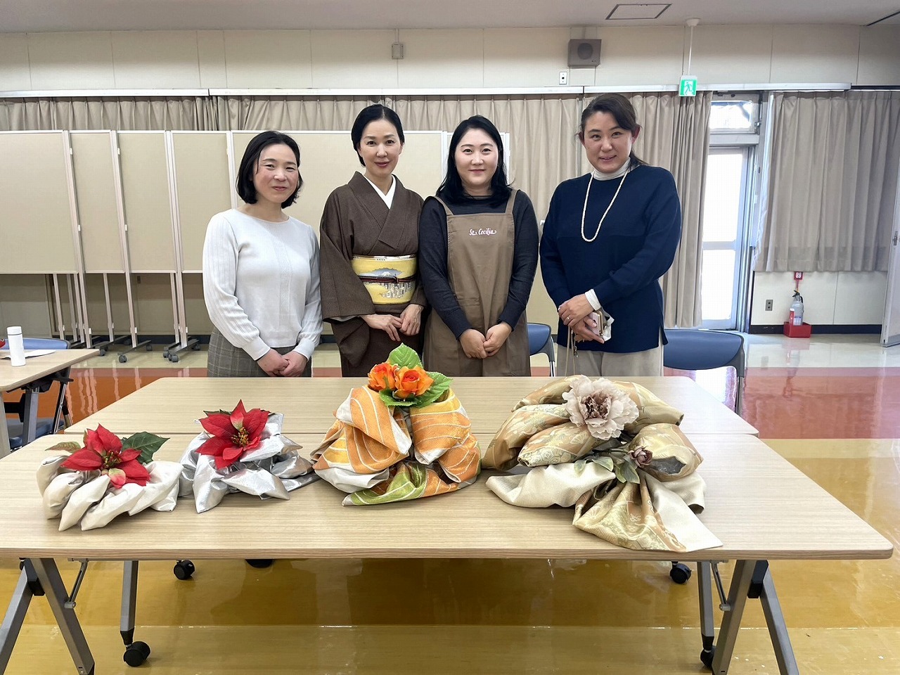 保護者の方が集まり、帯フラワーを作りました。講師は、1級着付け技能士の資格をお持ちで、3年生のマナー講座の授業でも和室のマナーについて教えてくださっている先生です。家庭で眠っている帯を使って、1人2つずつ、美しい作品を作りました。日本の伝統美の新たな表現となりました。
