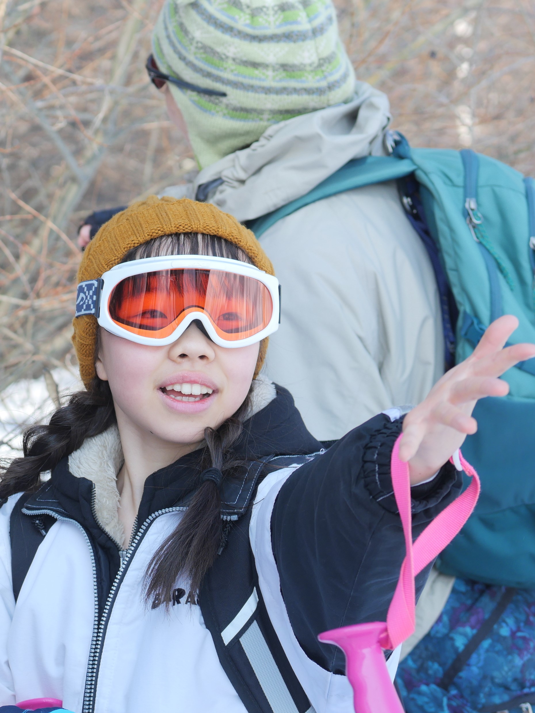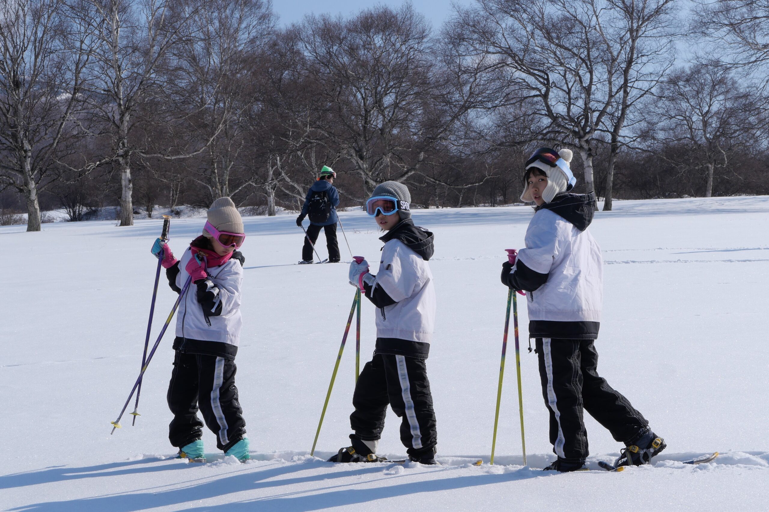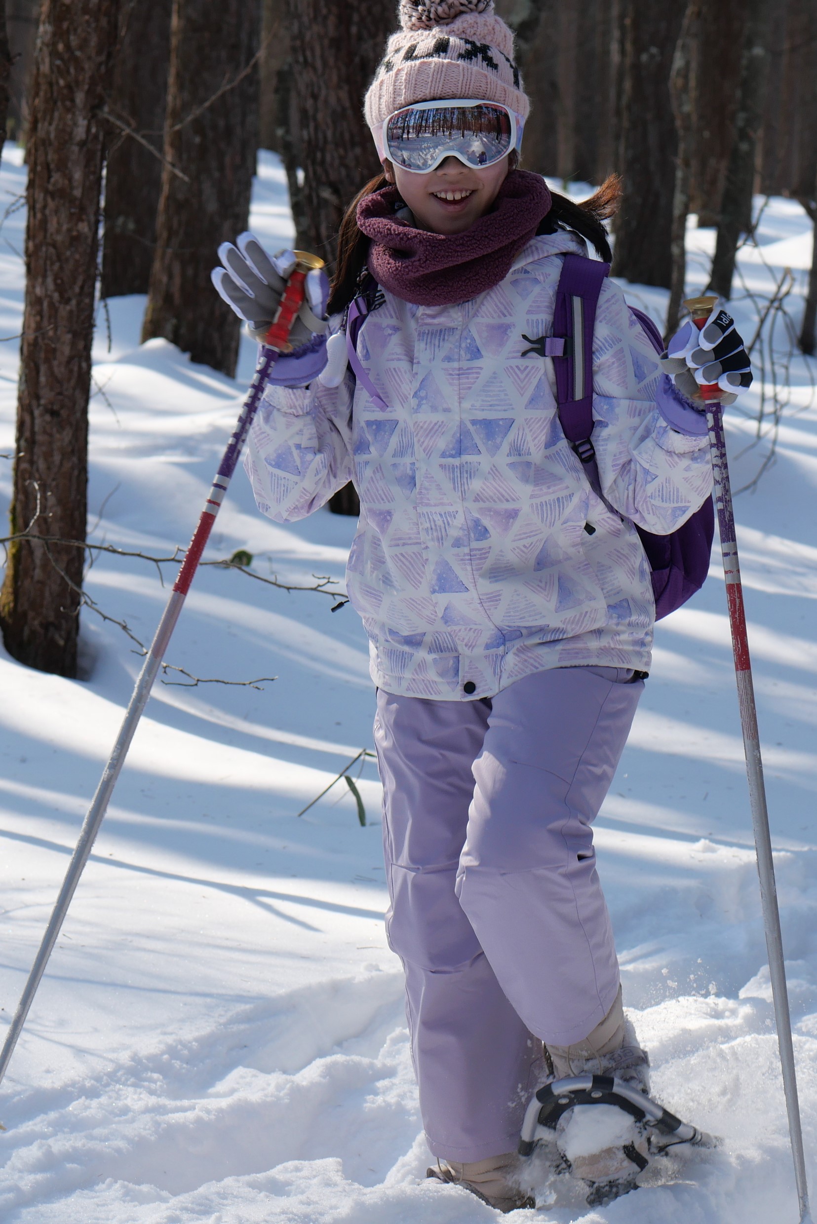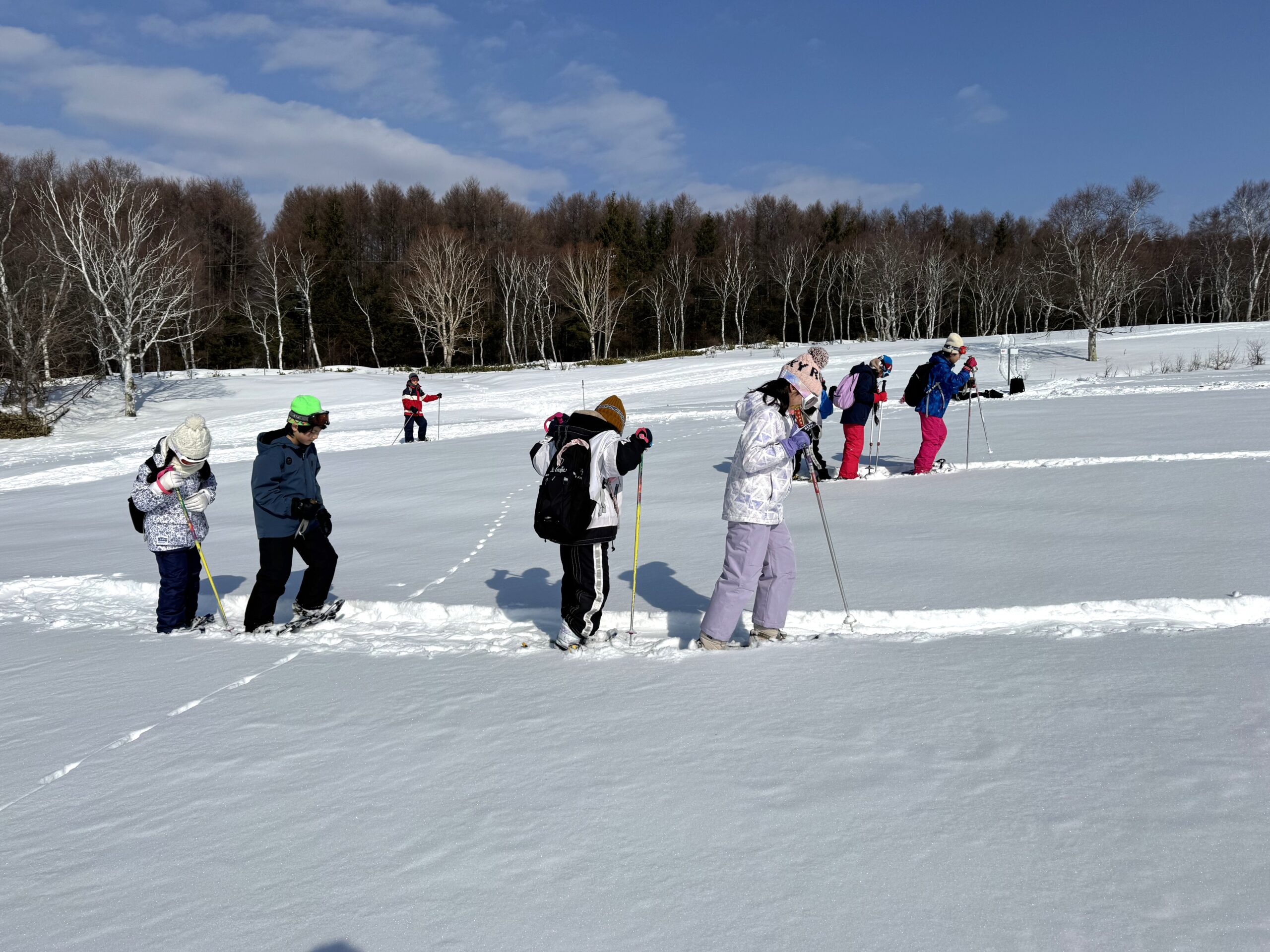 スノーシューを履いて、「雪山トレッキング」をしました。トレッキング途中には、キツネやネズミの足跡の他に、キツネのマーキングなども見ることができました。また、野鳥のかわいい鳴き声や様々な植物の冬越しの仕方なども観察することができました。まさに大自然。子どもたちも大興奮です。