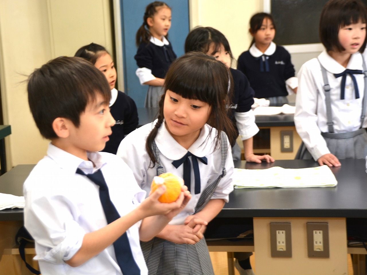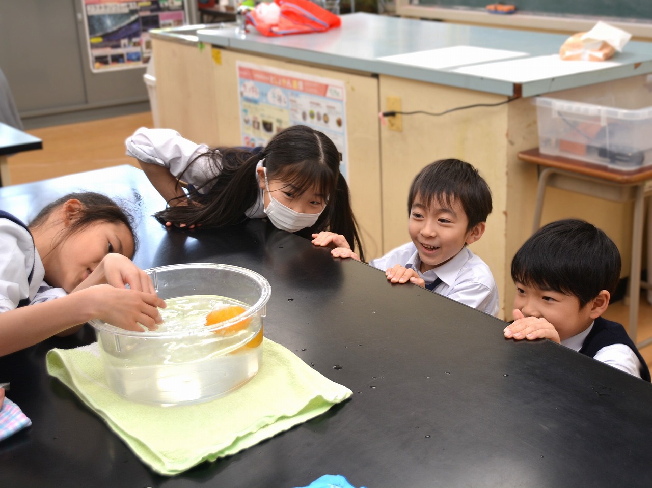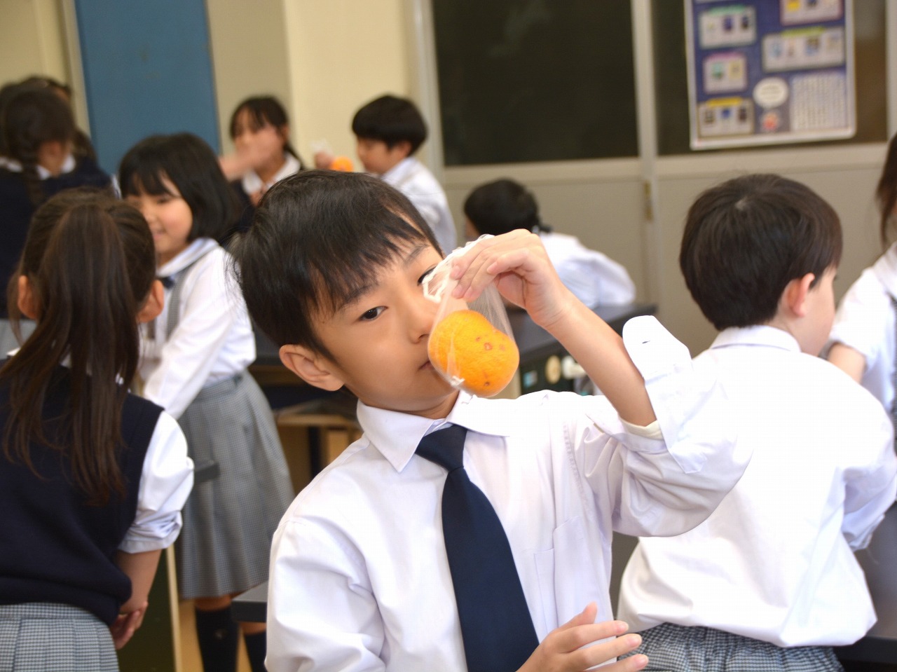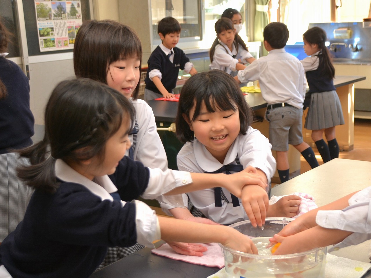 2年生は生活科で「昔の暮らし」について学習しています。その学習の一環で、冬至に行う「柚子湯」を体験しました。柚子の手触りや香りを確かめた後、柚子をお湯の中に入れました。柚子の爽やかな香りが広がると、自然と歓声があがりました。そして、柚子湯に手を入れると、「あったかーい」「きもちいいー」という声とともに、みんな幸せそうな笑顔になります。日本に昔から伝わる寒い冬を乗り越えるための知恵や工夫を楽しみながら体験することができました。