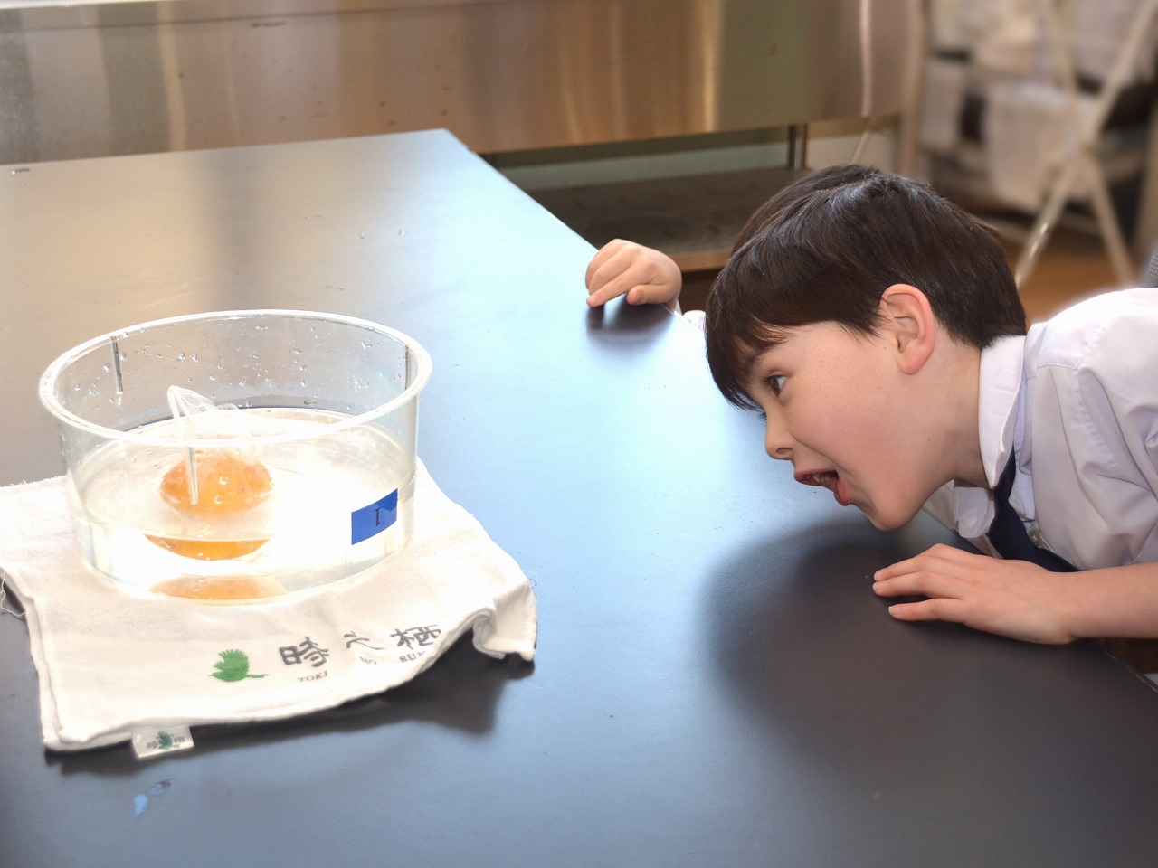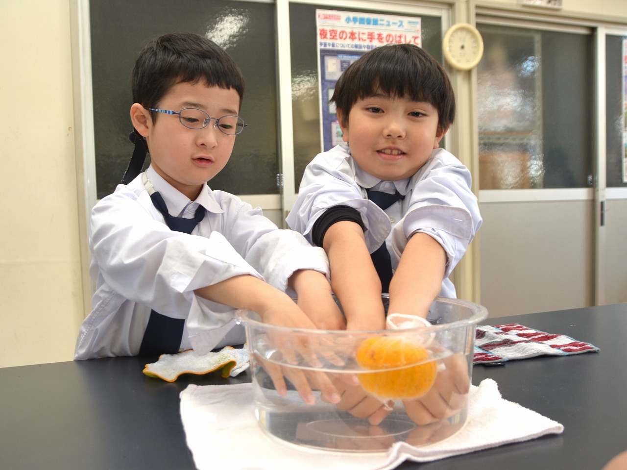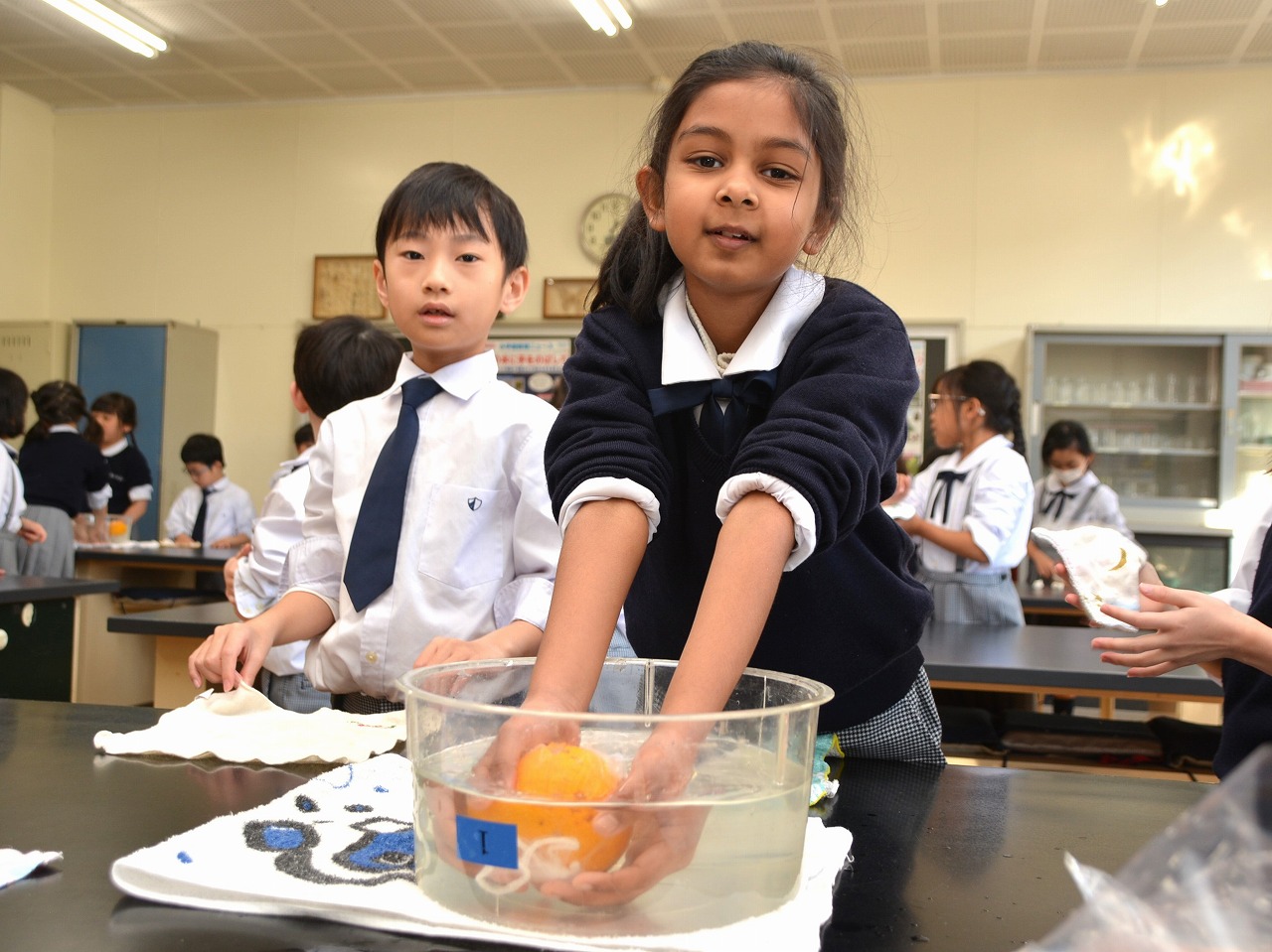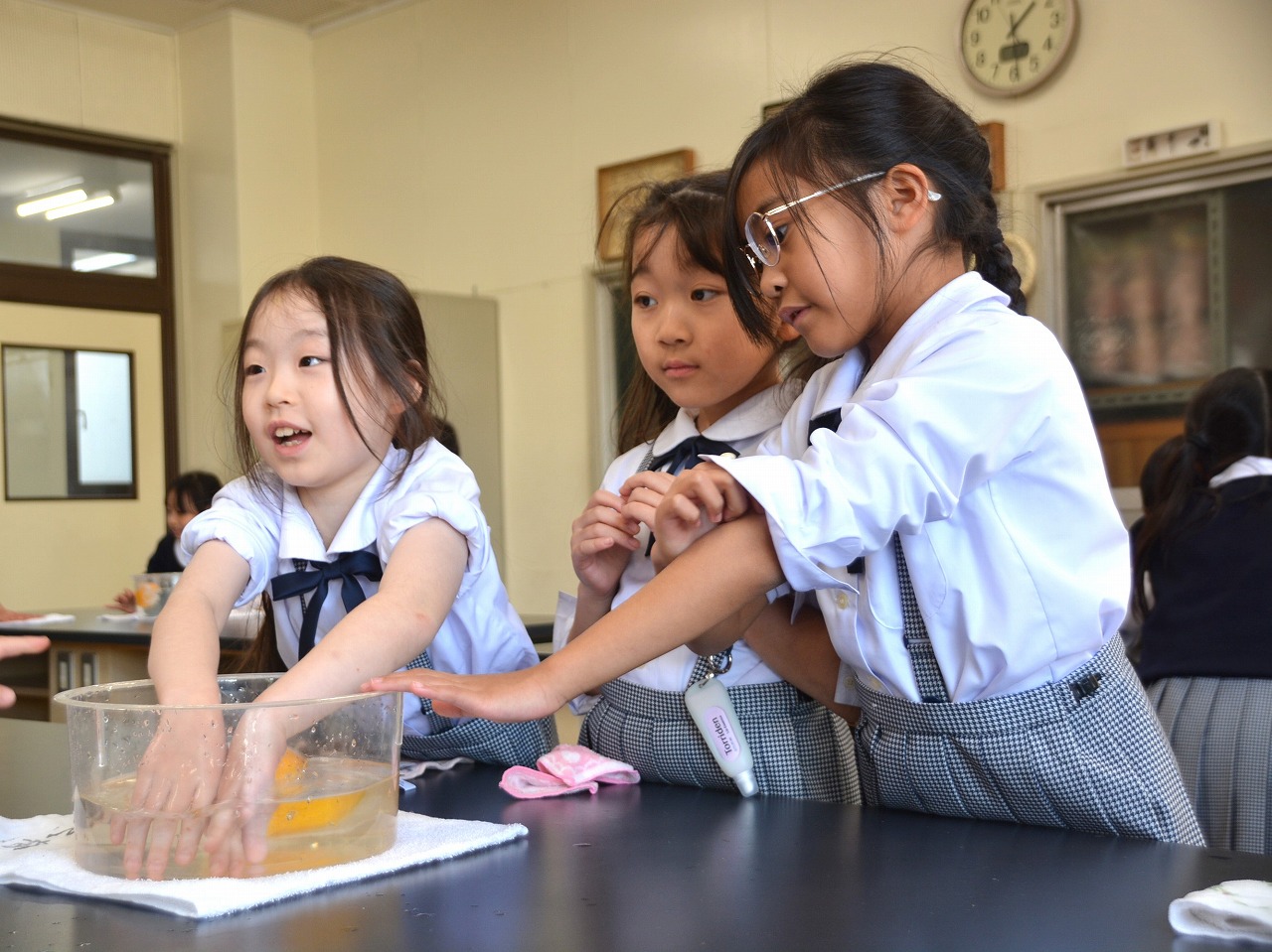 2年生は生活科で「昔の暮らし」について学習しています。その学習の一環で、冬至に行う「柚子湯」を体験しました。柚子の手触りや香りを確かめた後、柚子をお湯の中に入れました。柚子の爽やかな香りが広がると、自然と歓声があがりました。そして、柚子湯に手を入れると、「あったかーい」「きもちいいー」という声とともに、みんな幸せそうな笑顔になります。日本に昔から伝わる寒い冬を乗り越えるための知恵や工夫を楽しみながら体験することができました。