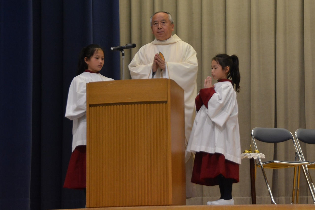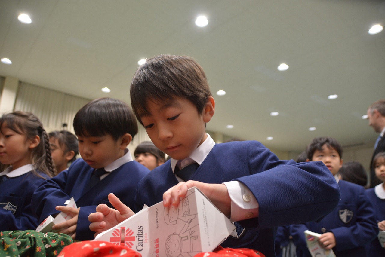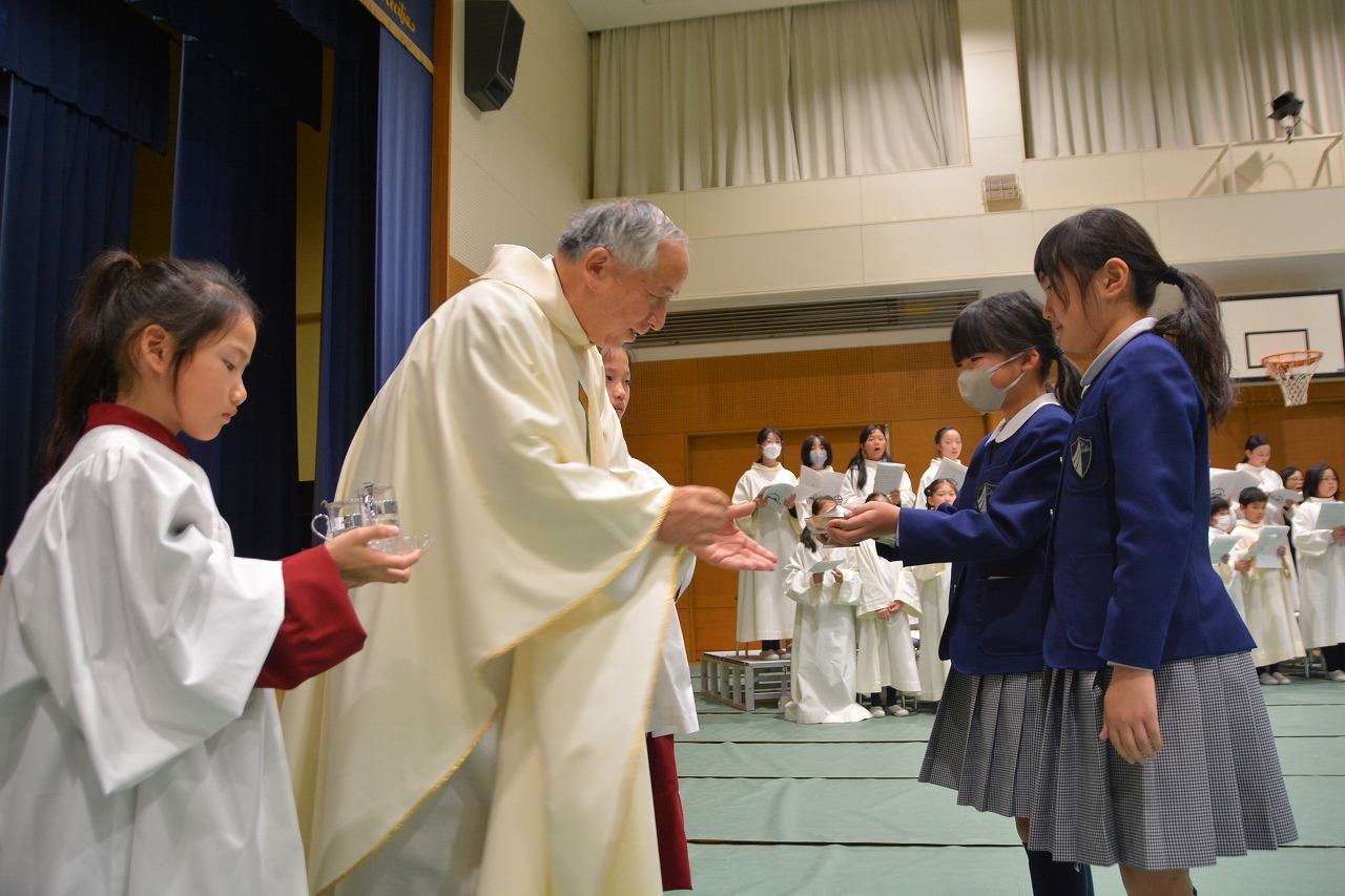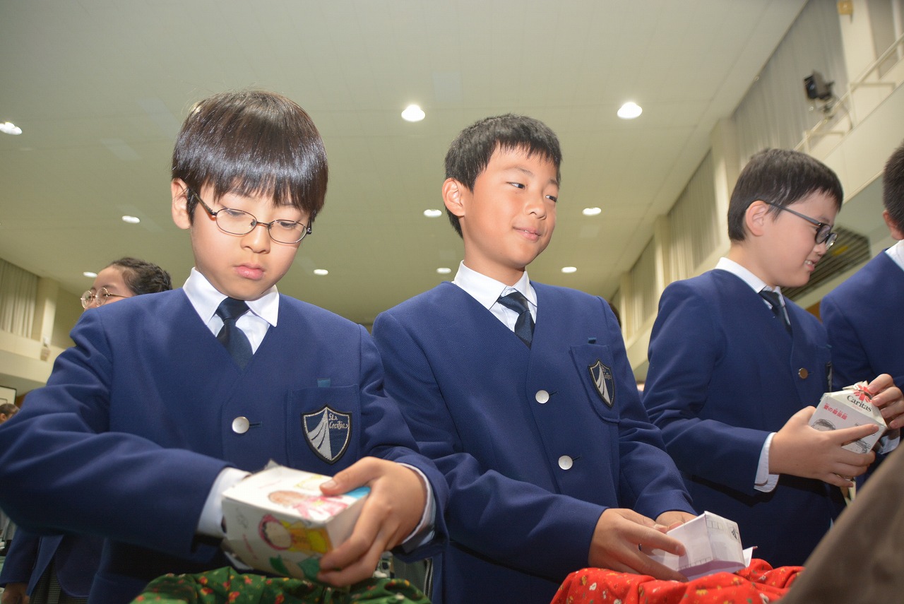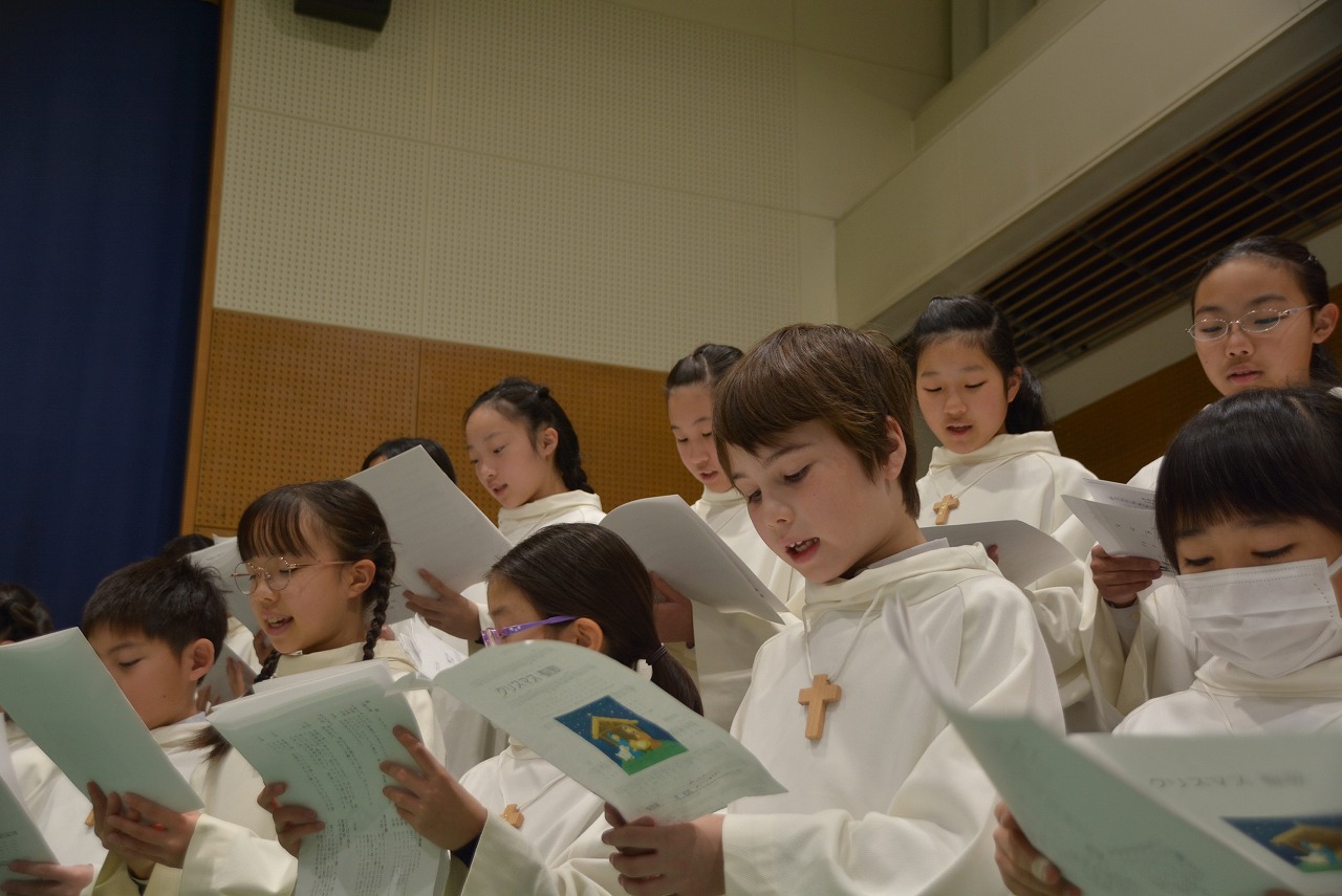 全校児童が一堂に会し、クリスマスミサに与りました。待降節の間、お手伝いをするなどして少しずつ貯めてきたお金を心を込めて献金するとともに、思いやりの心を大切にし、毎日の自分の行いを振り返りながら記してきた待降節カードを捧げました。ミサを通してイエス・キリストの誕生を喜び祝うとともに、よいクリスマスが迎えられるようにお祈りしました。