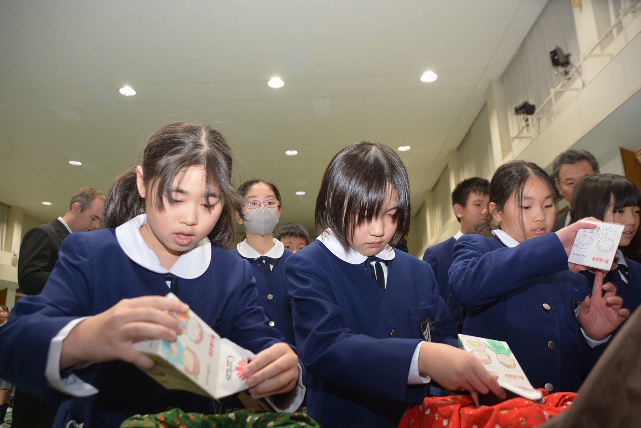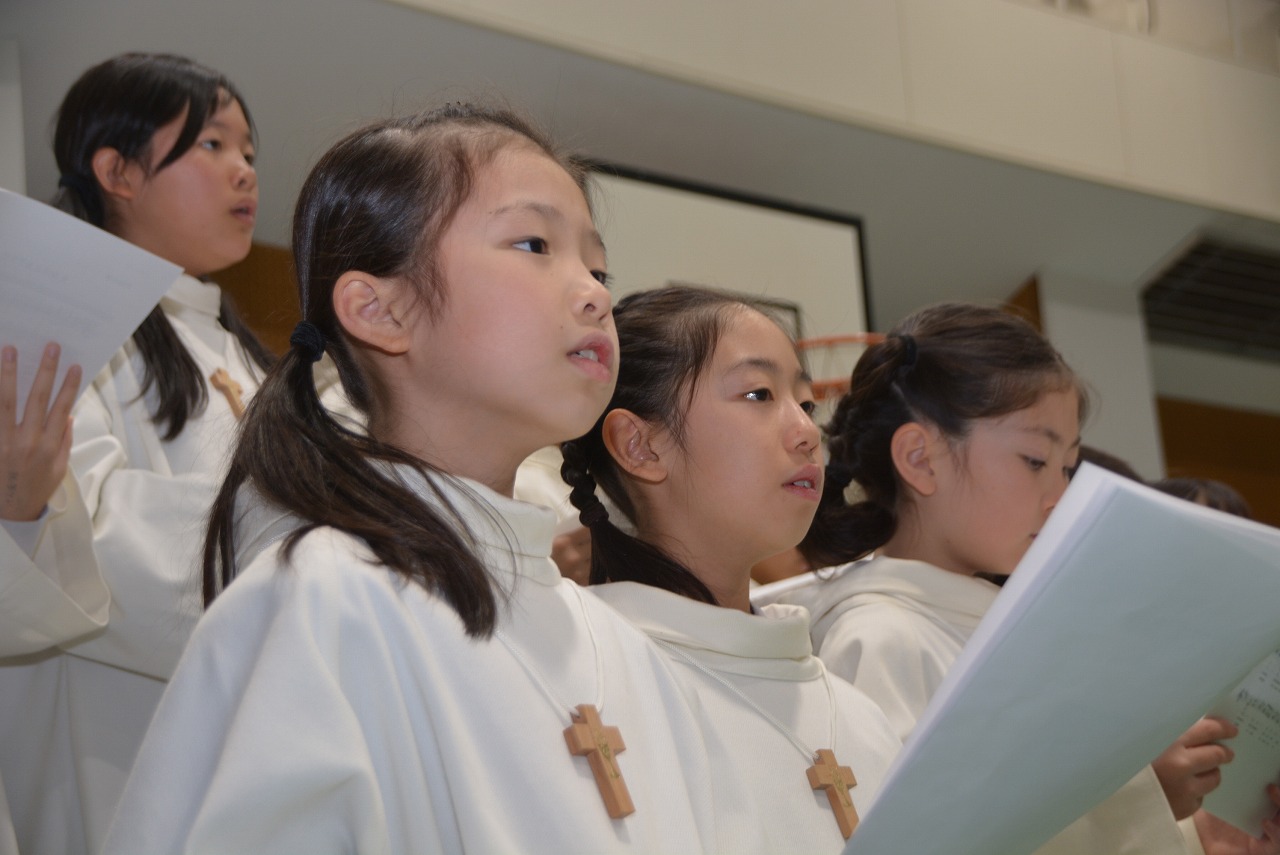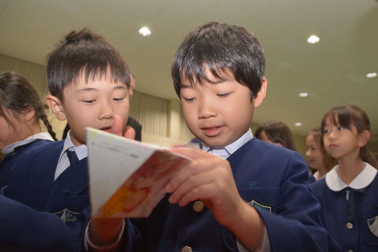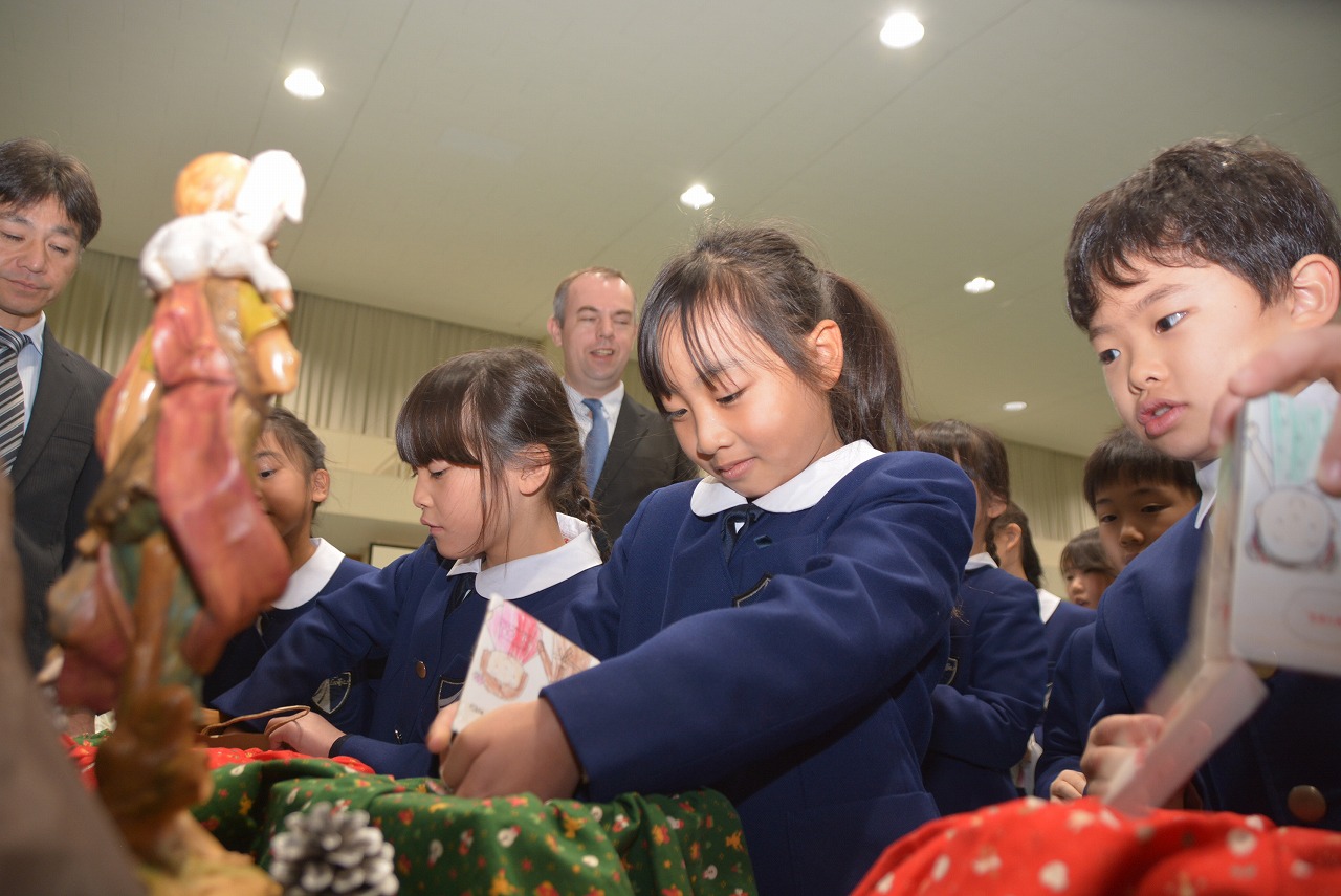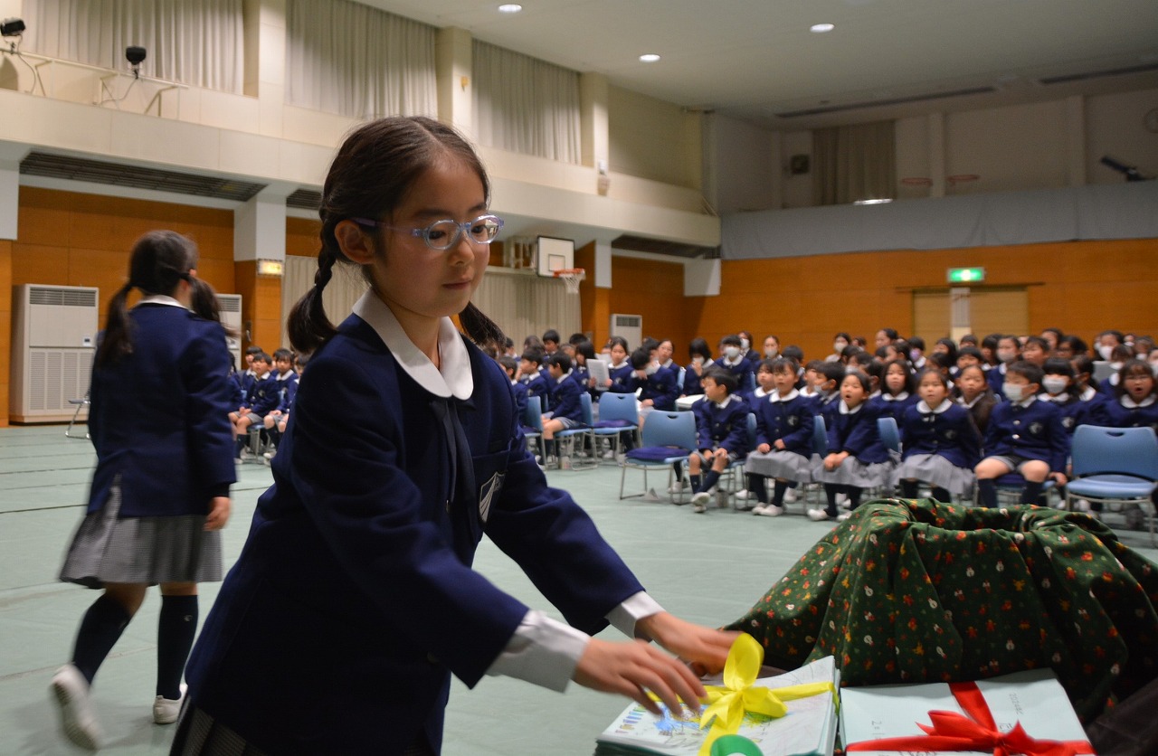 全校児童が一堂に会し、クリスマスミサに与りました。待降節の間、お手伝いをするなどして少しずつ貯めてきたお金を心を込めて献金するとともに、思いやりの心を大切にし、毎日の自分の行いを振り返りながら記してきた待降節カードを捧げました。ミサを通してイエス・キリストの誕生を喜び祝うとともに、よいクリスマスが迎えられるようにお祈りしました。