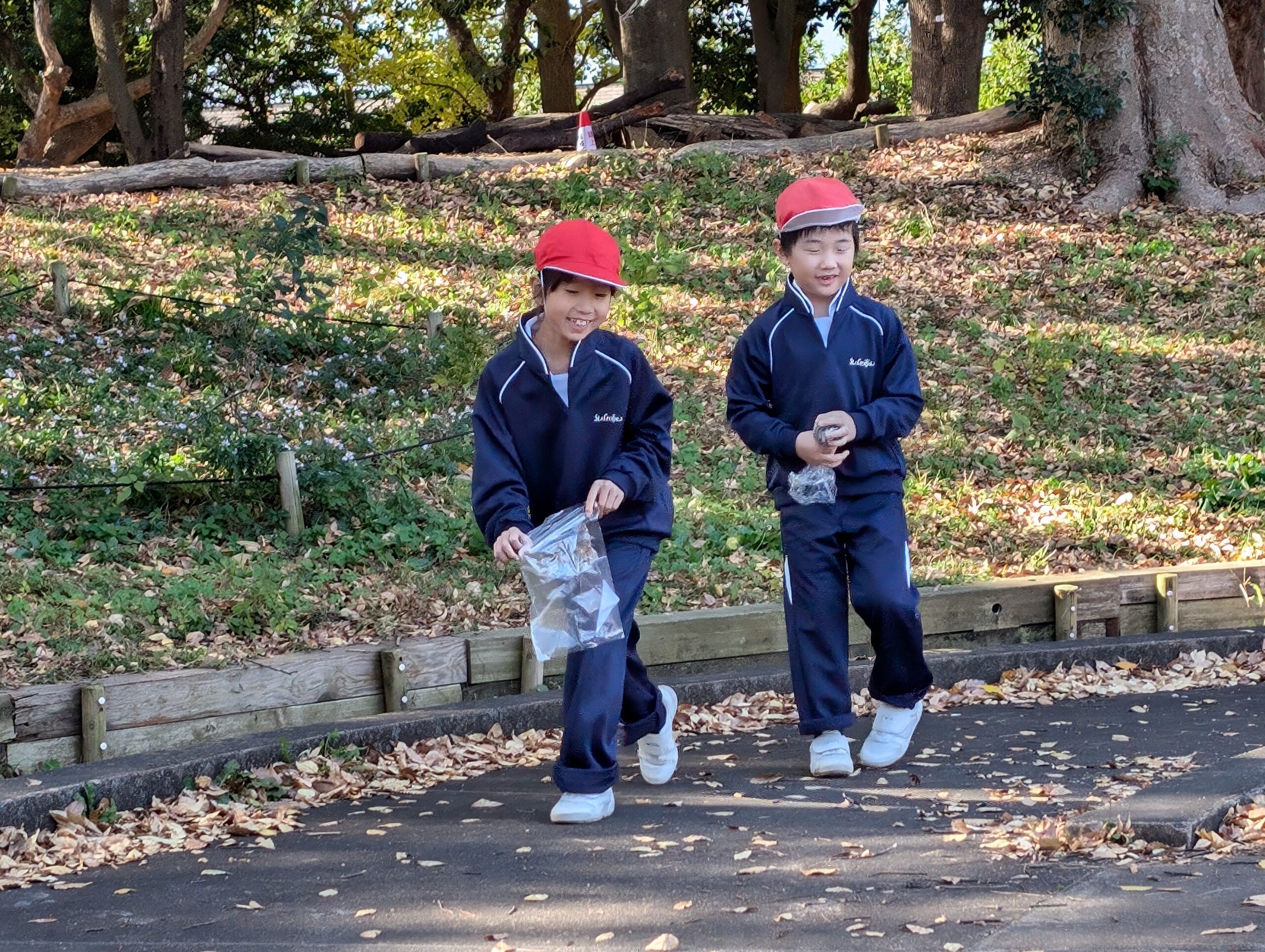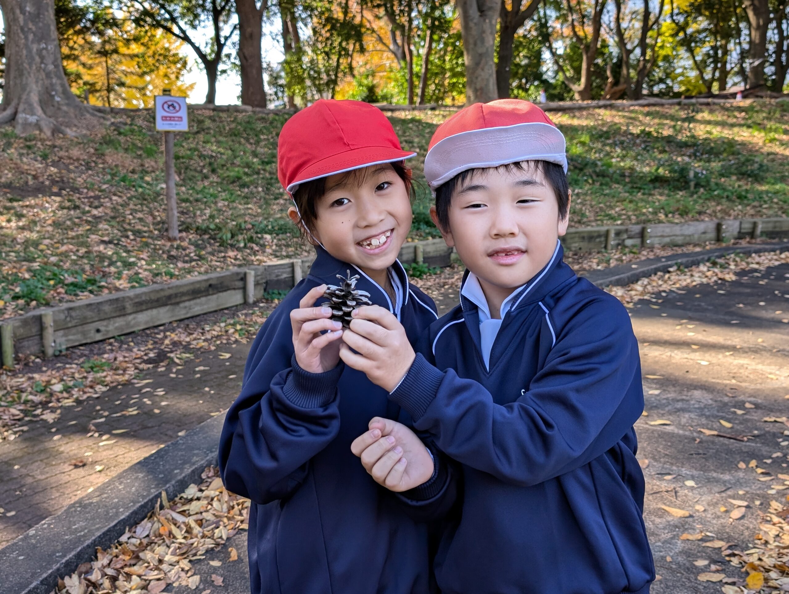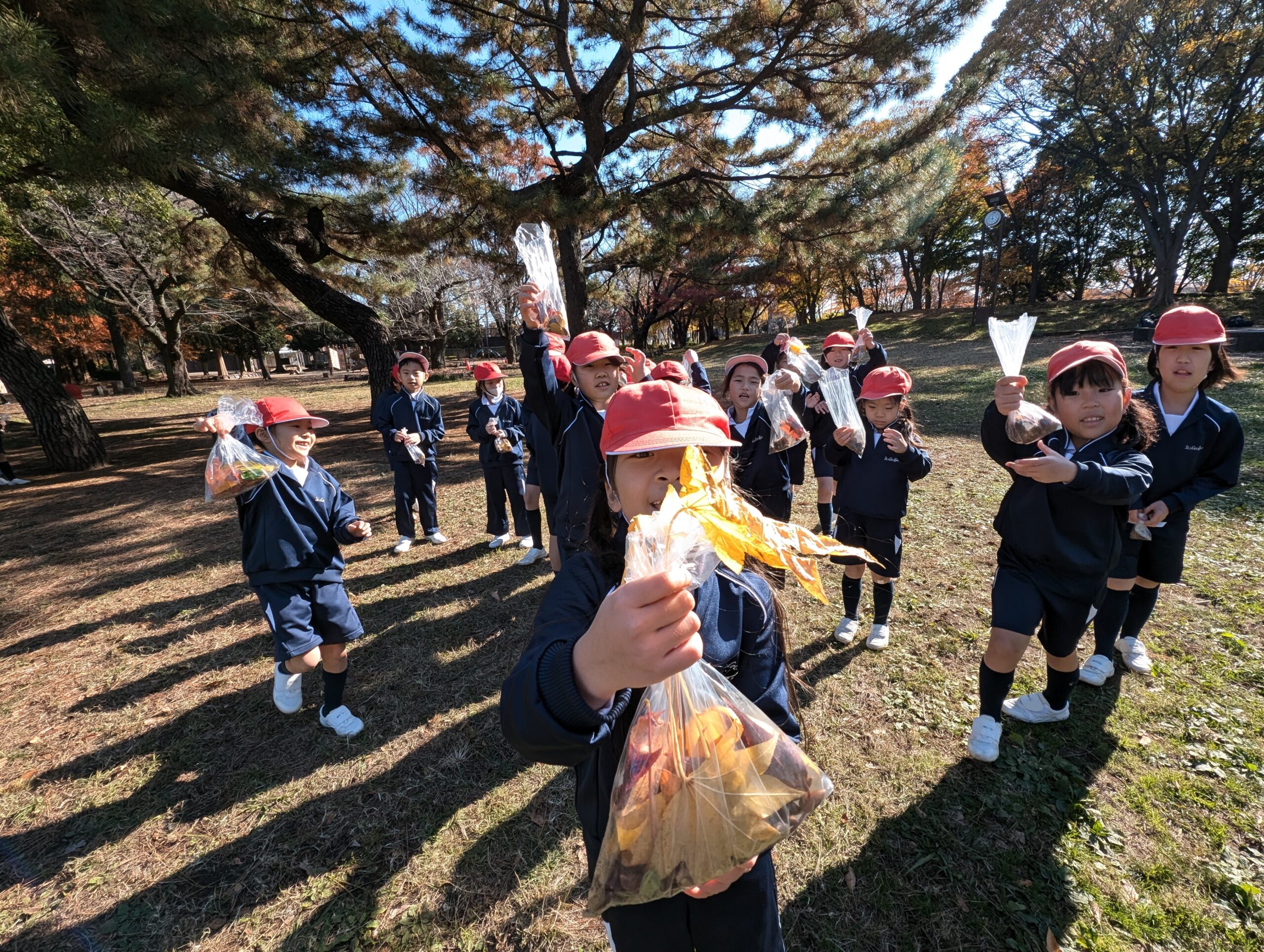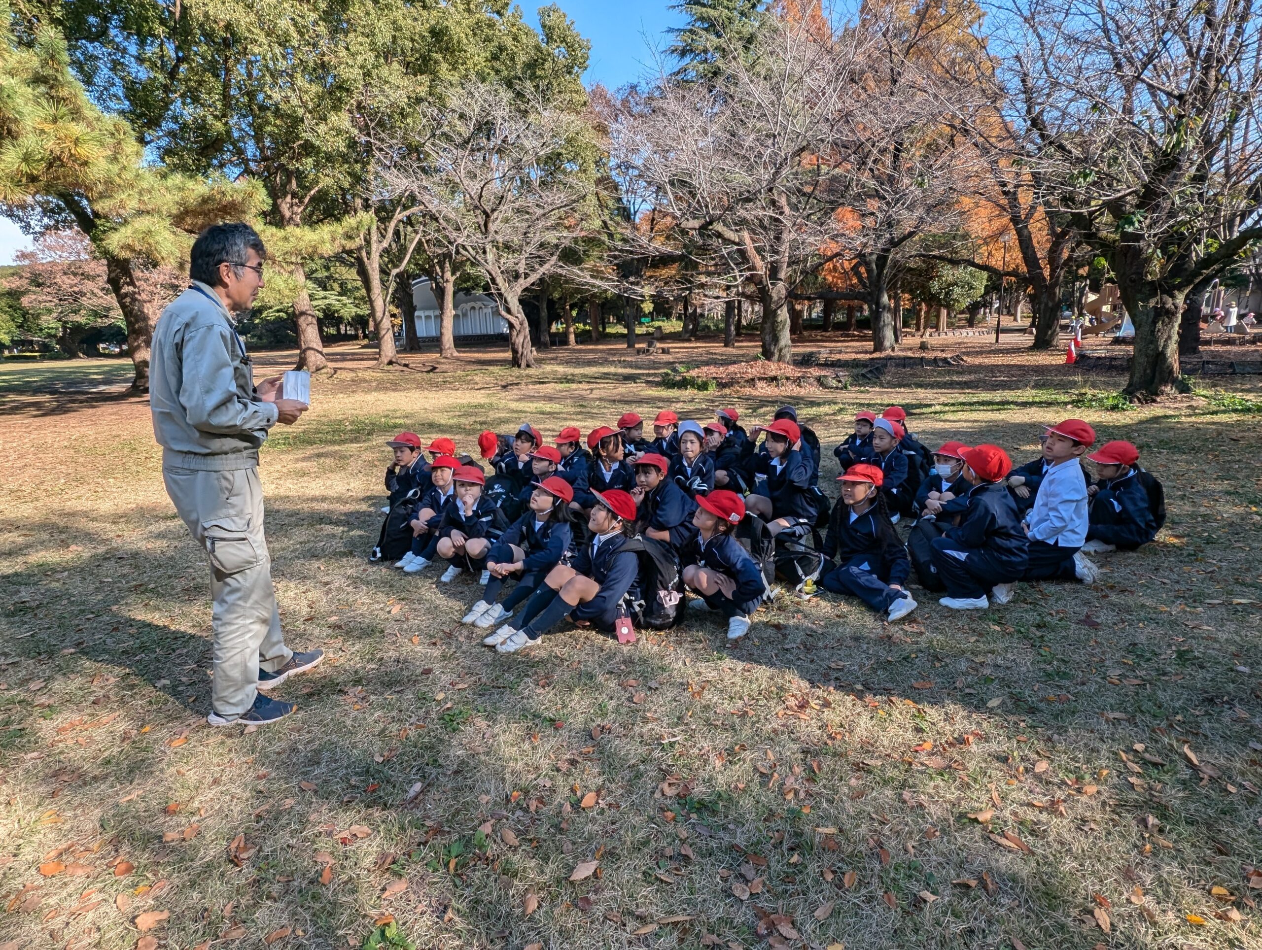 1~2年生が生活科の学習で引地台公園に行きました。1年生は公園で秋探し。公園は自然豊かで、どんぐりの実や黄色く色づいた葉など、多くのものを発見しました。2年生は引地台公園管理事務所の所長さんにインタビュー。引地台公園のことや、公園でのルール、公園で働く方々についてお話をしていただきました。