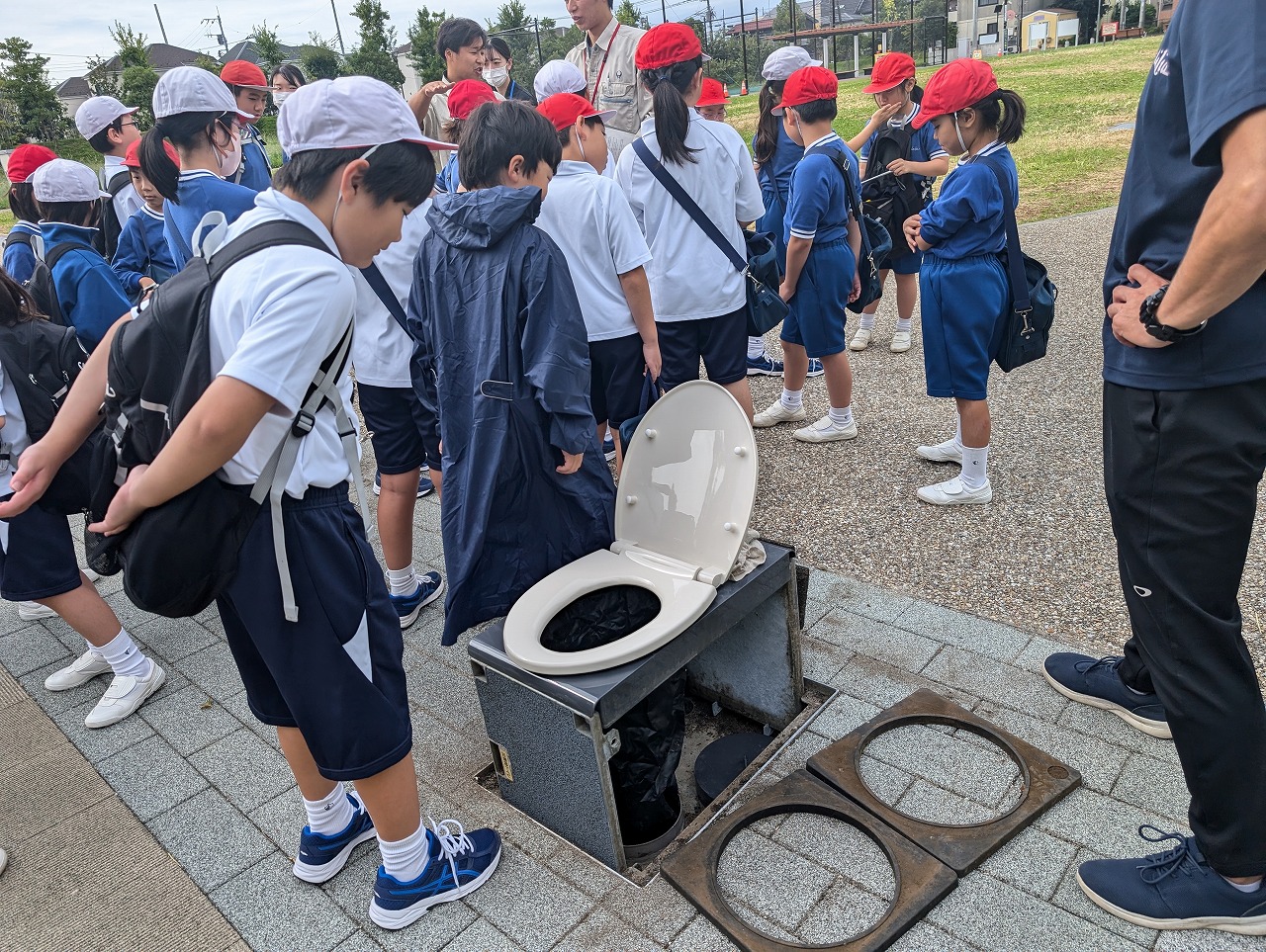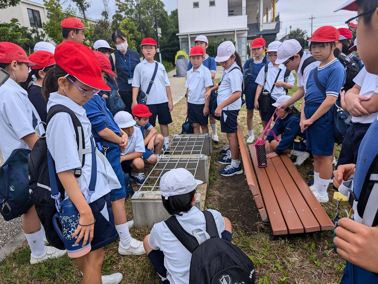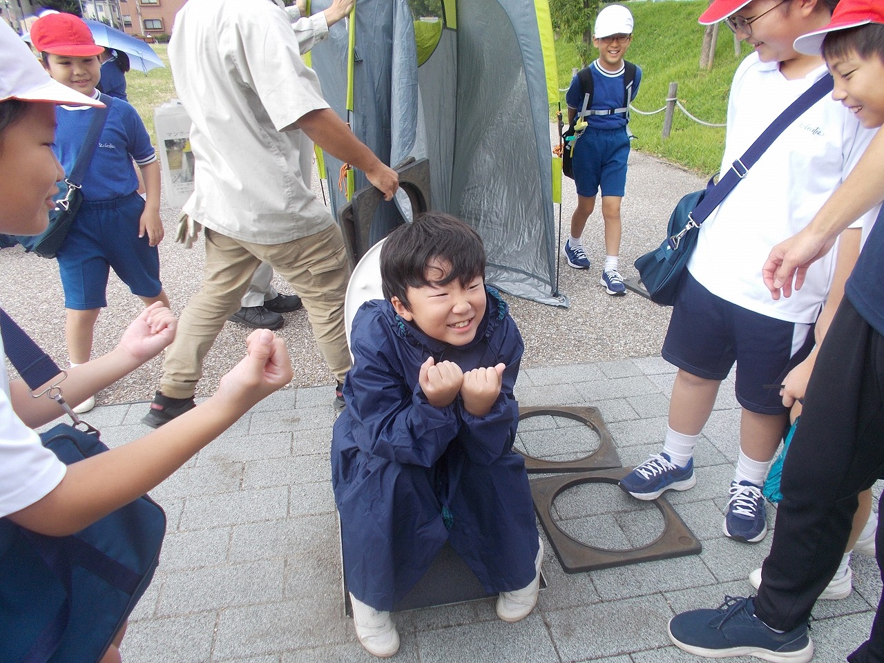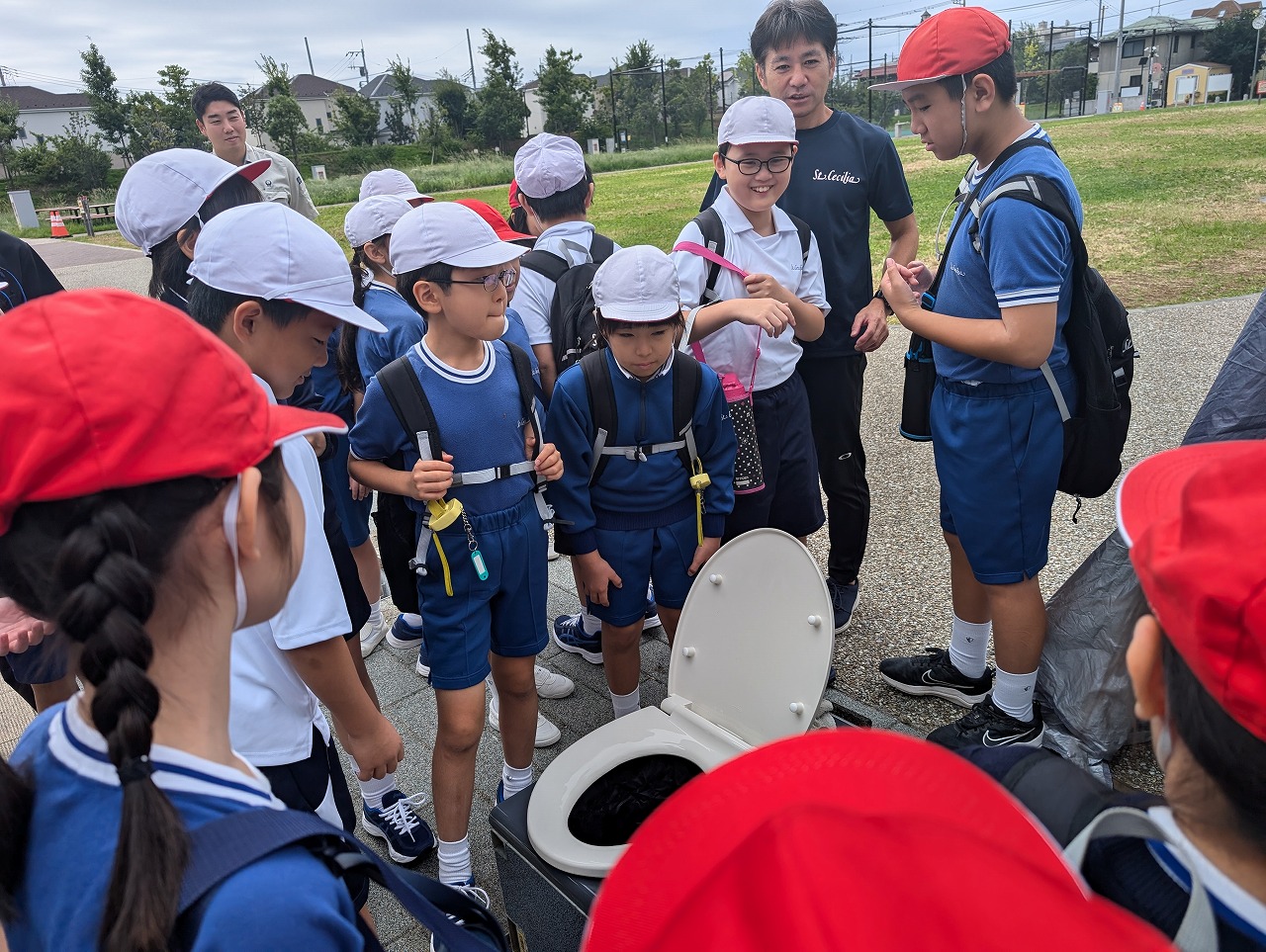 4年生は、社会科の学習で、大和市防災パークに行きました。大和市役所の方々から、普段は遊具として使っている公園の様々な工夫のお話を聞き、ベンチが災害時にかまどに変化する工夫に驚いたり、災害時用のトイレを体験したり、防災倉庫の備蓄品を見せていただいたりして、災害への備えについて考えました。