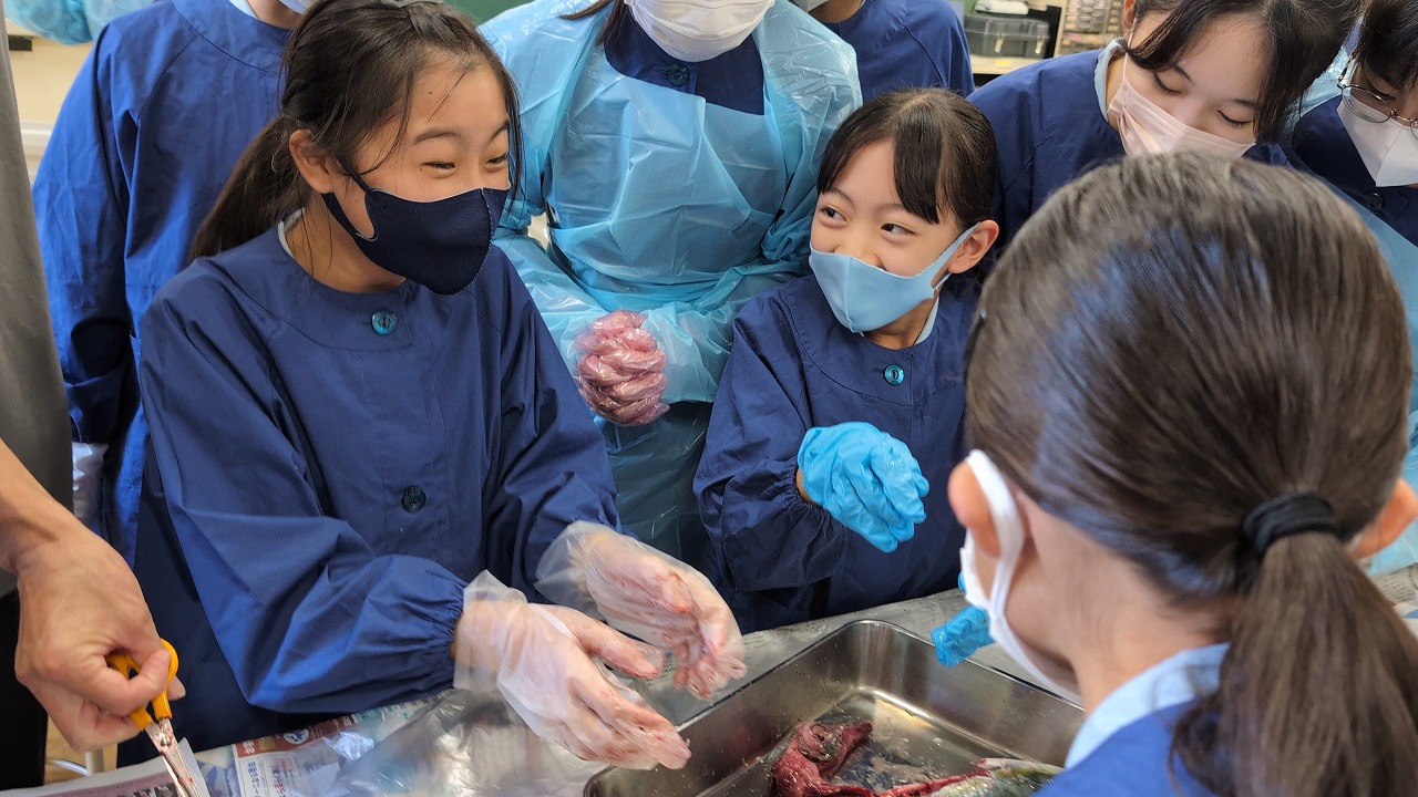 授業では、始めに魚と人の歯の役割の違いや、魚が音を感じる場所、エラ呼吸の仕組み、心臓の位置などを実際に魚を触りながら観察しました。次に、魚にはさみを入れ、胃を取り出しました。開いてみると、中からは少し消化されたイワシやアジなど出てきて、子どもたちは大盛り上がり。消化と吸収の仕組みとともに、イナダは他の魚を食べて生きているのだということを実感することができました。最初はおそるおそる魚を触っていた子どもたちも興味の気持ちがどんどん上回り、いつの間にか堂々と魚を扱うことができていました。中には、魚の眼から水晶体を取り出すことに成功した子どももいました。子どもたちにとって、とてもよい体験になったようです。