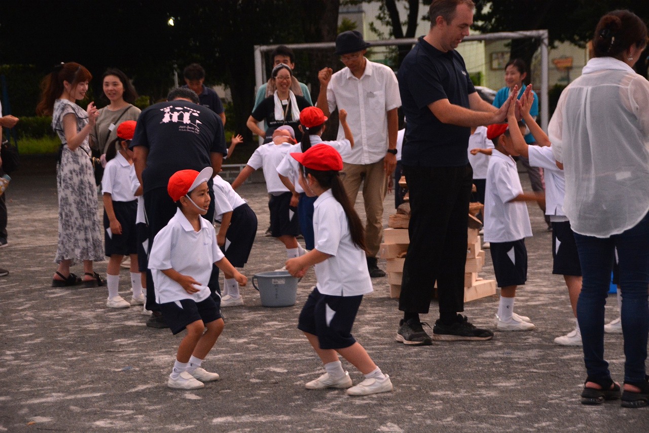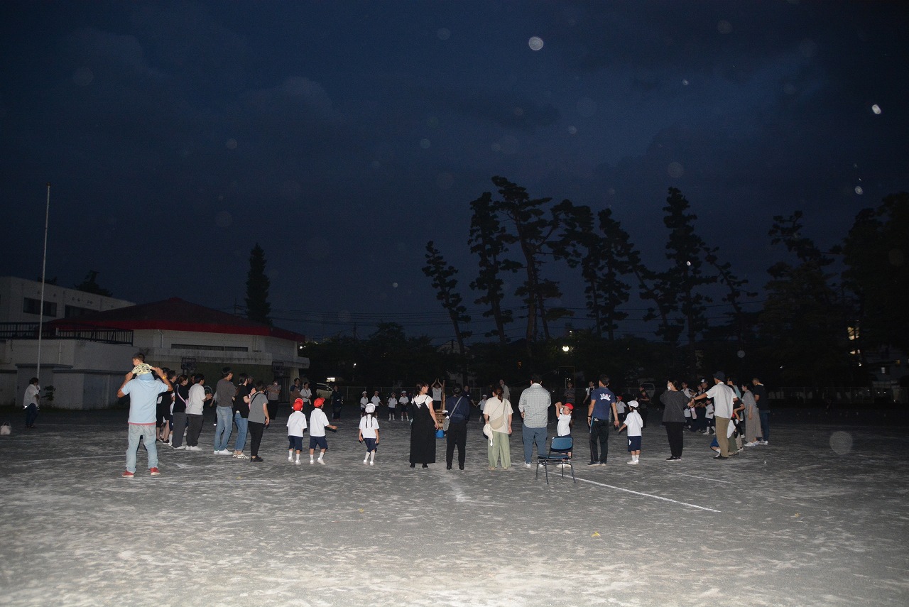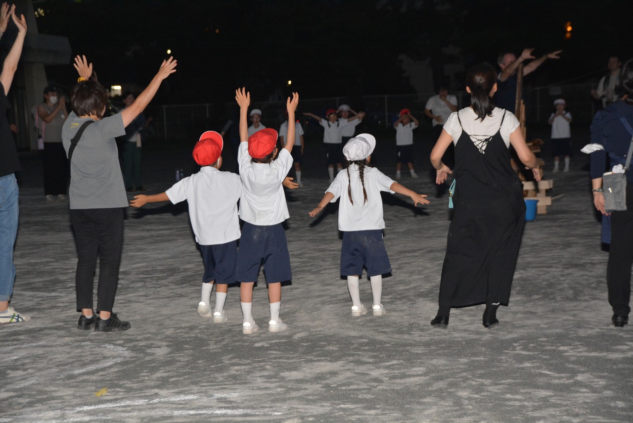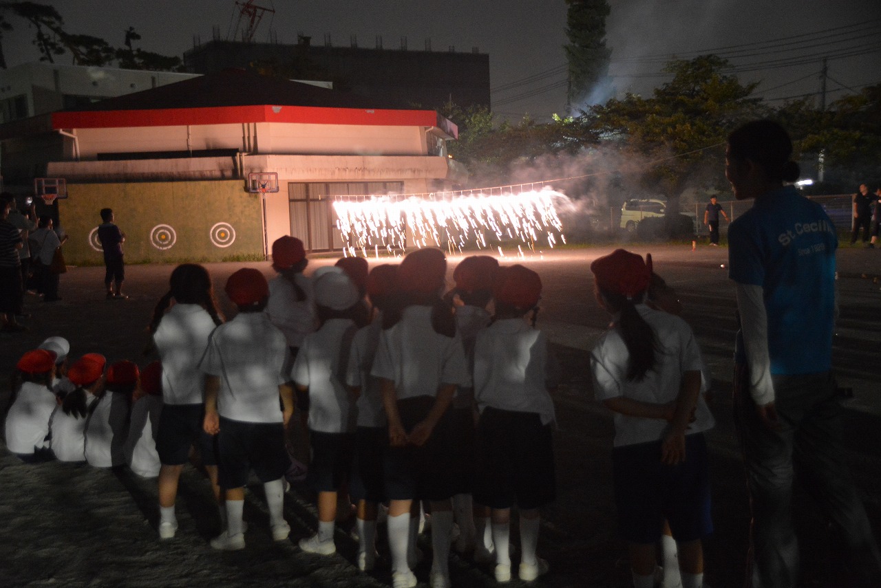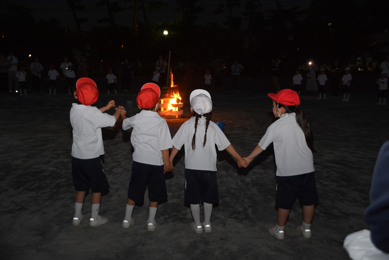 日が暮れてきた頃、1年生は歌の発表をしました。そのあと、大きなキャンプファイアーを囲んで、みんなでゲームをしたり、フォークダンスを踊ったりしました。たくさん踊ってたくさん笑って、最後はみんなで花火を見て大歓声をあげました。みんなで楽しく夏の1日を過ごすことができました。