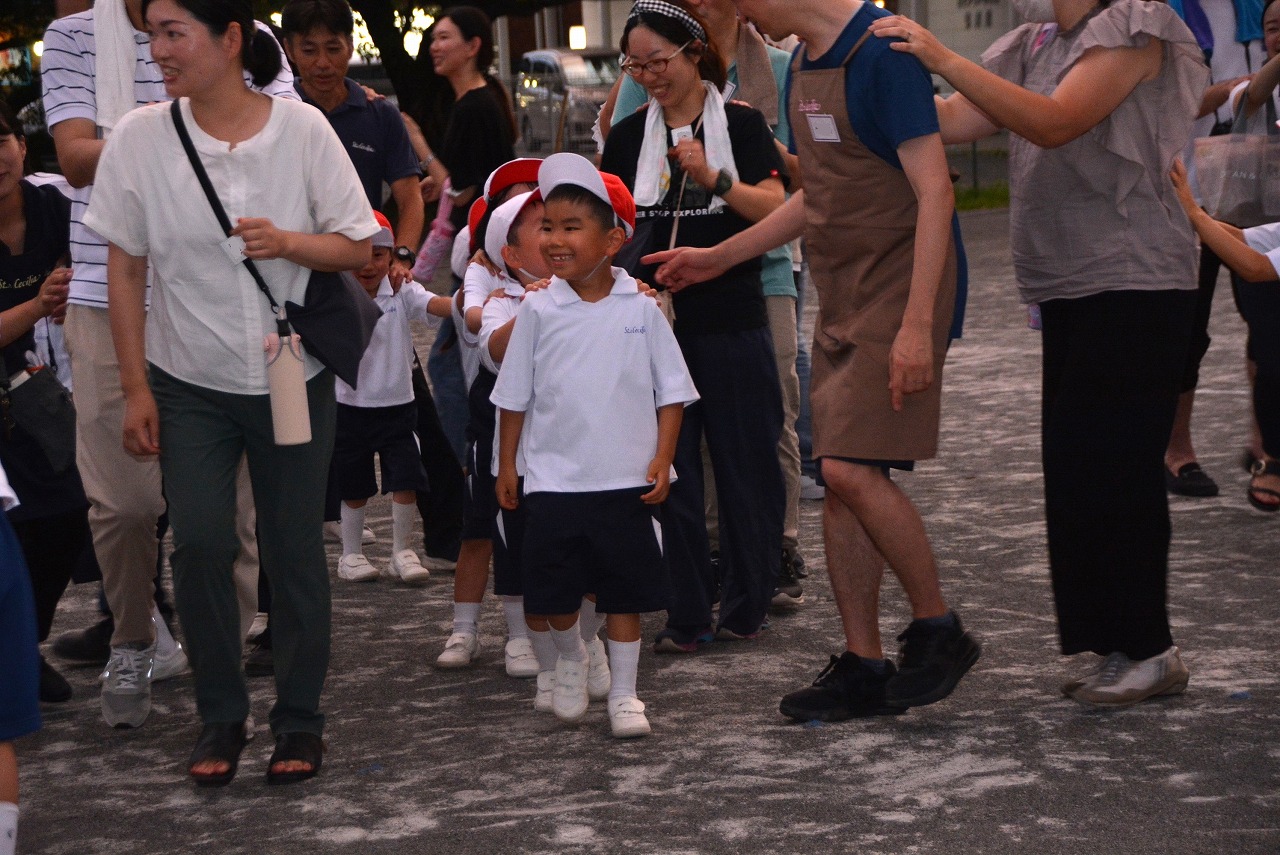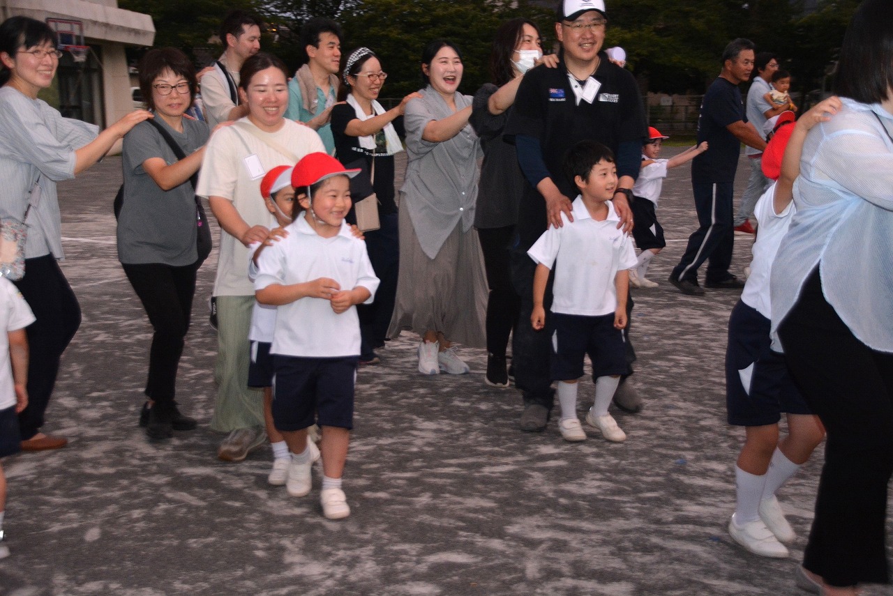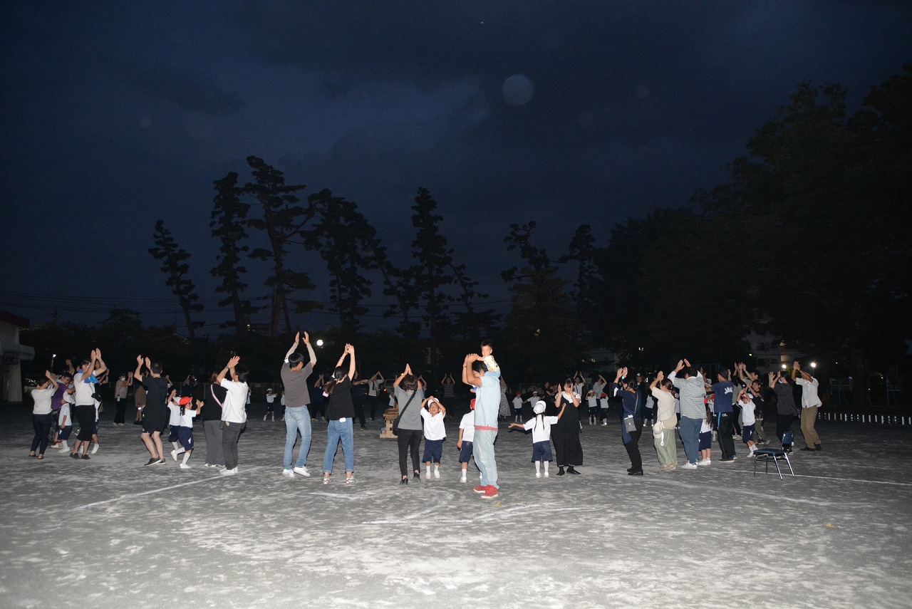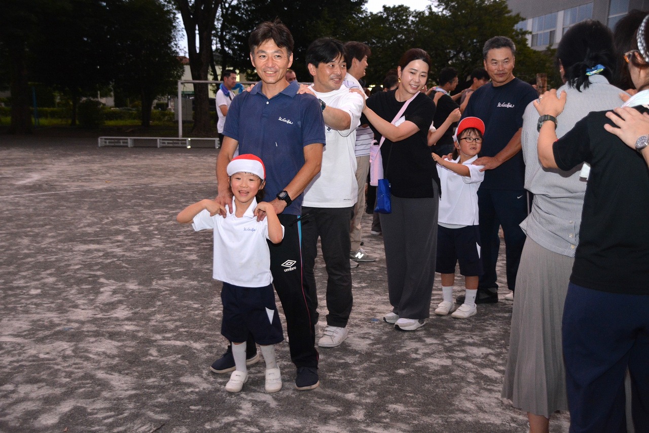 日が暮れてきた頃、1年生は歌の発表をしました。そのあと、大きなキャンプファイアーを囲んで、みんなでゲームをしたり、フォークダンスを踊ったりしました。たくさん踊ってたくさん笑って、最後はみんなで花火を見て大歓声をあげました。みんなで楽しく夏の1日を過ごすことができました。