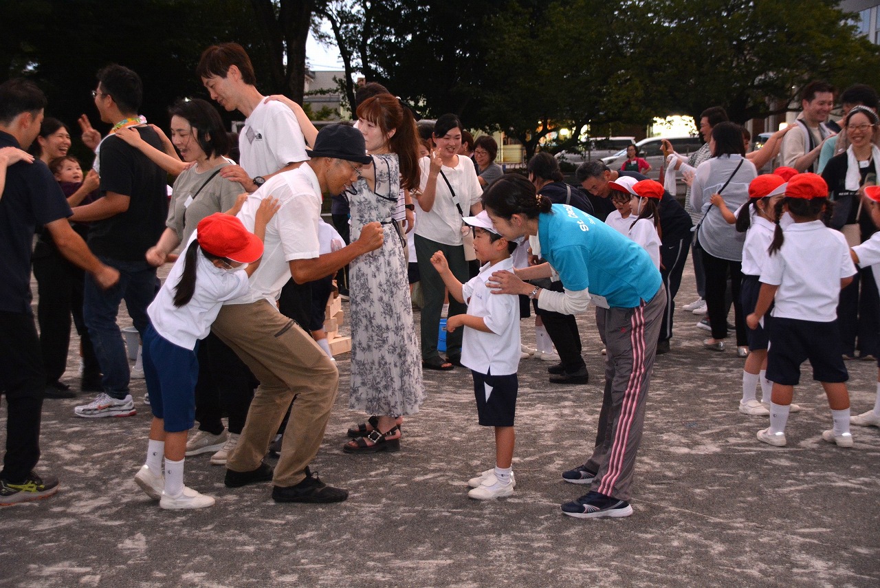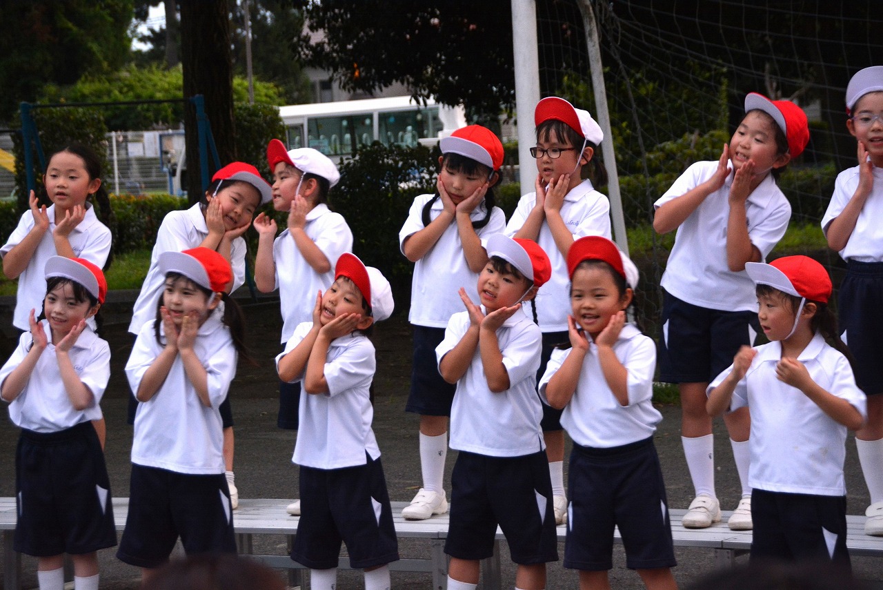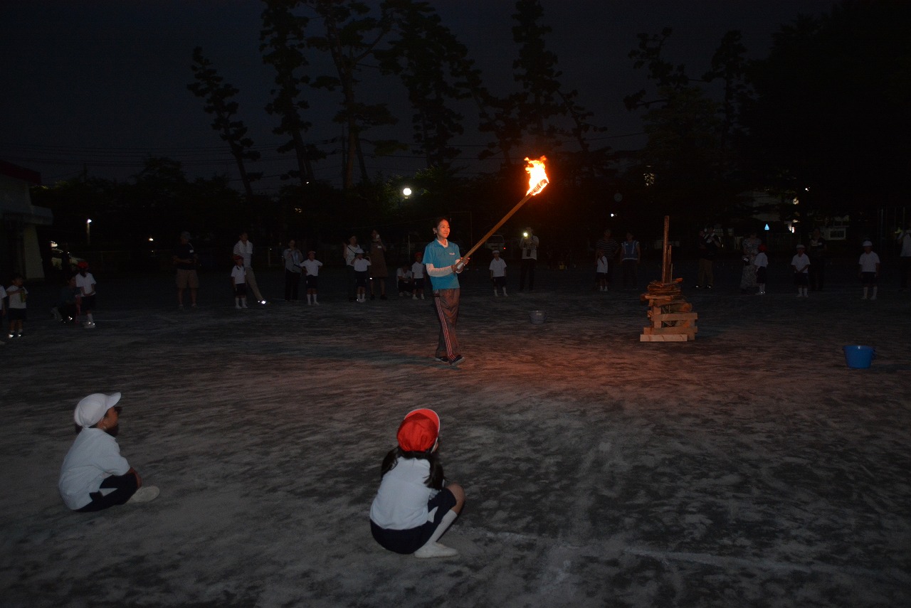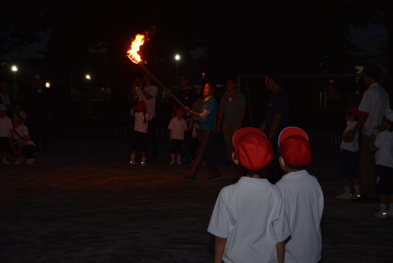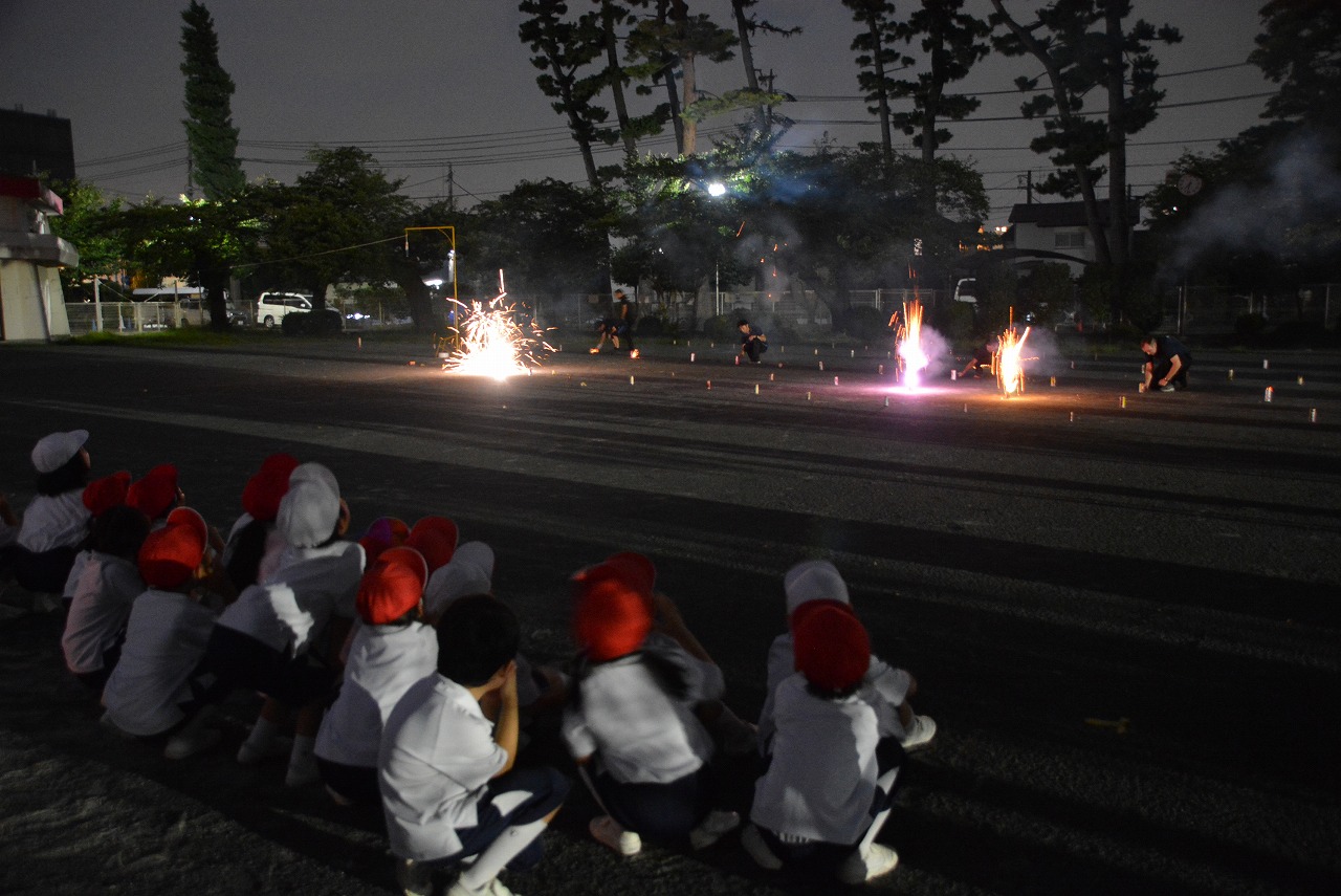 日が暮れてきた頃、1年生は歌の発表をしました。そのあと、大きなキャンプファイアーを囲んで、みんなでゲームをしたり、フォークダンスを踊ったりしました。たくさん踊ってたくさん笑って、最後はみんなで花火を見て大歓声をあげました。みんなで楽しく夏の1日を過ごすことができました。