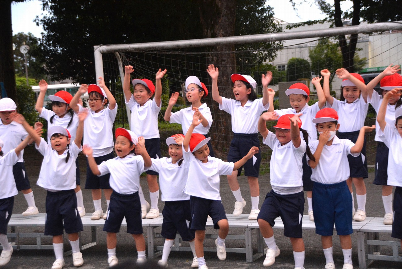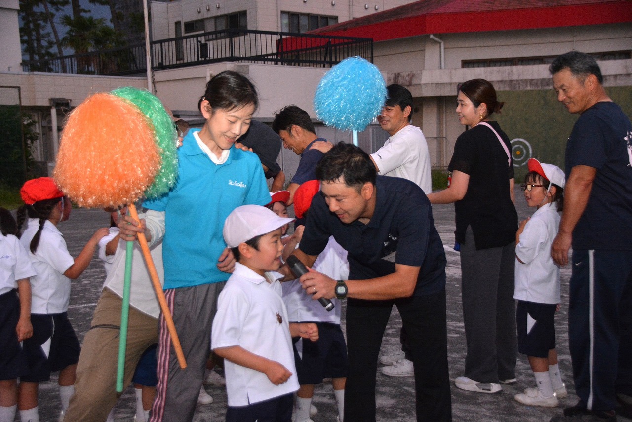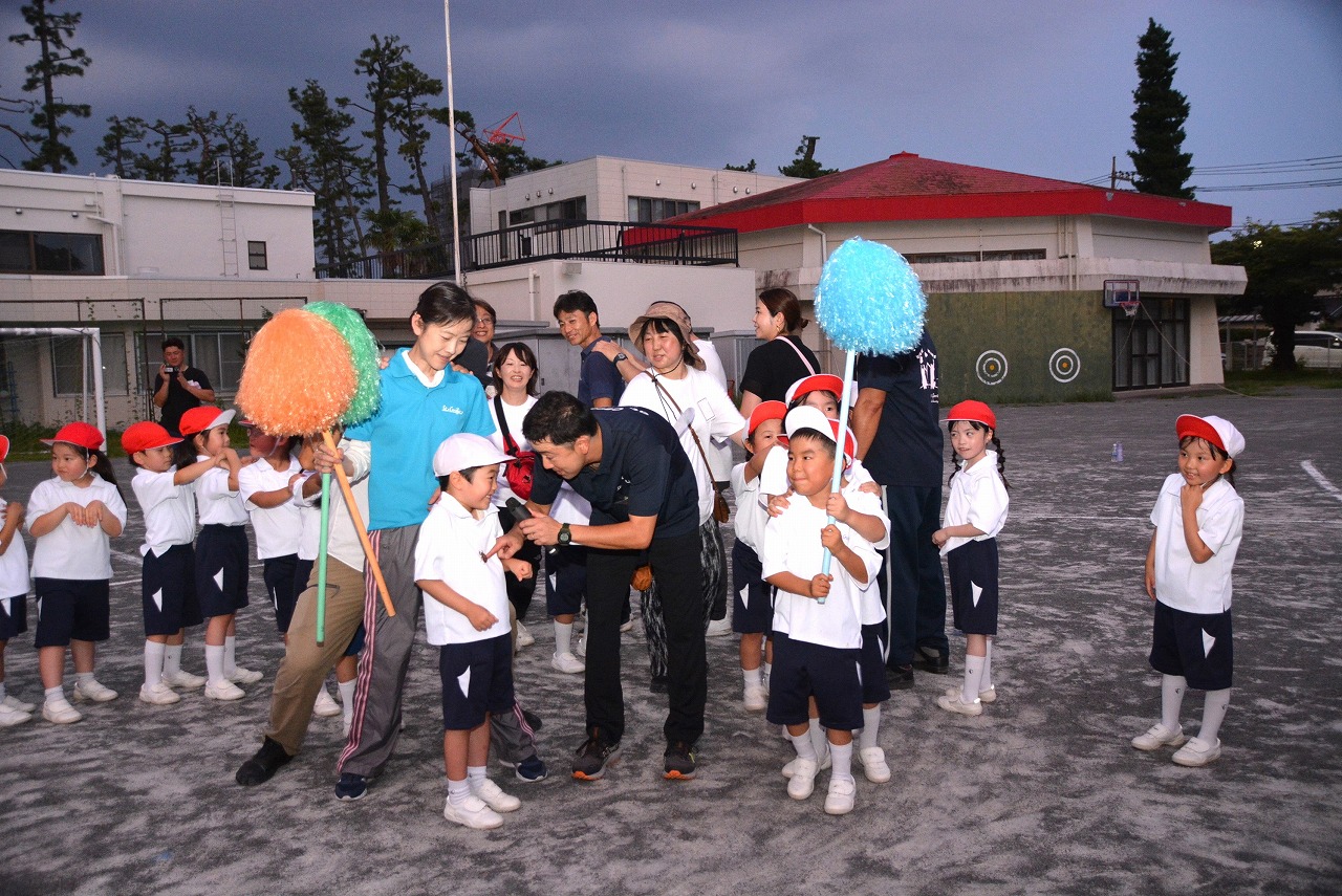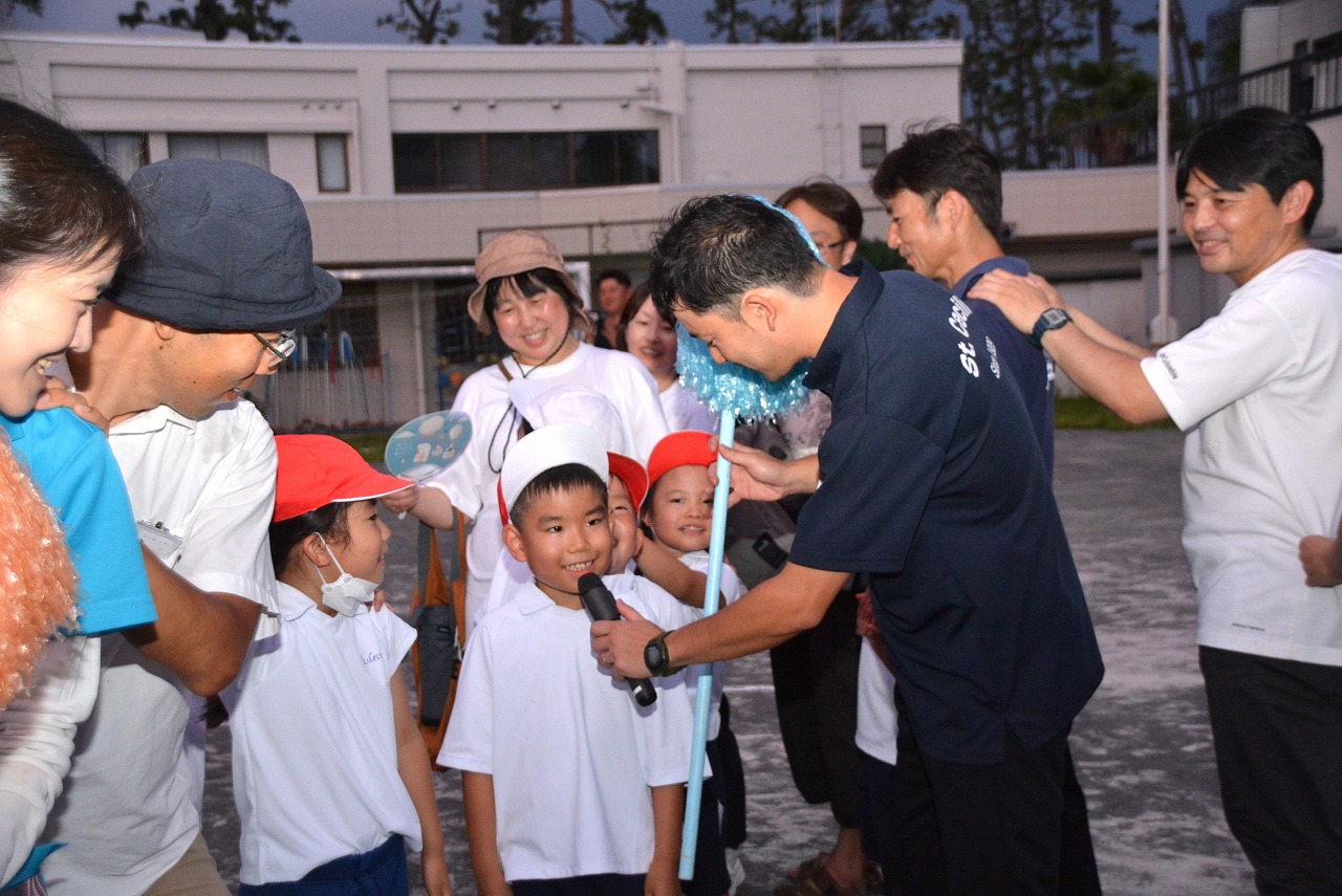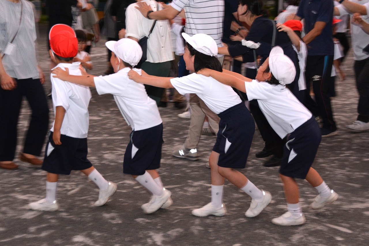 日が暮れてきた頃、1年生は歌の発表をしました。そのあと、大きなキャンプファイアーを囲んで、みんなでゲームをしたり、フォークダンスを踊ったりしました。たくさん踊ってたくさん笑って、最後はみんなで花火を見て大歓声をあげました。みんなで楽しく夏の1日を過ごすことができました。