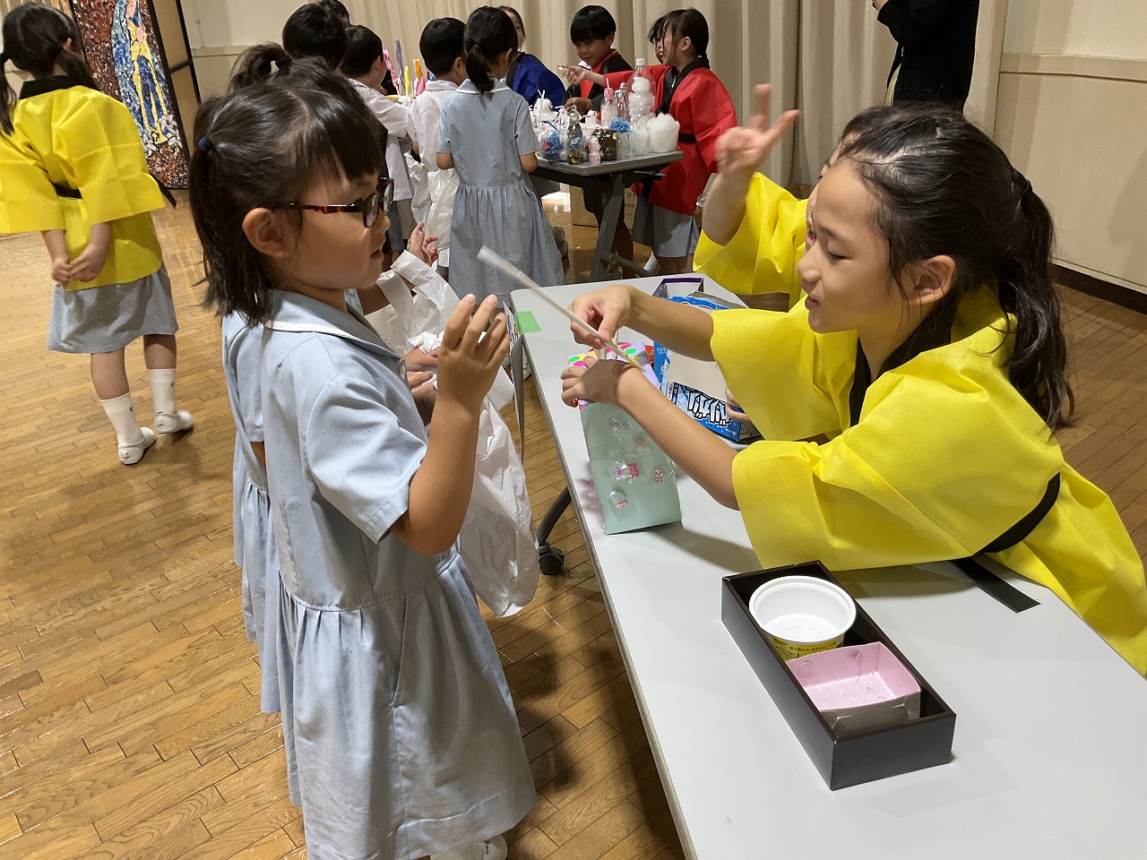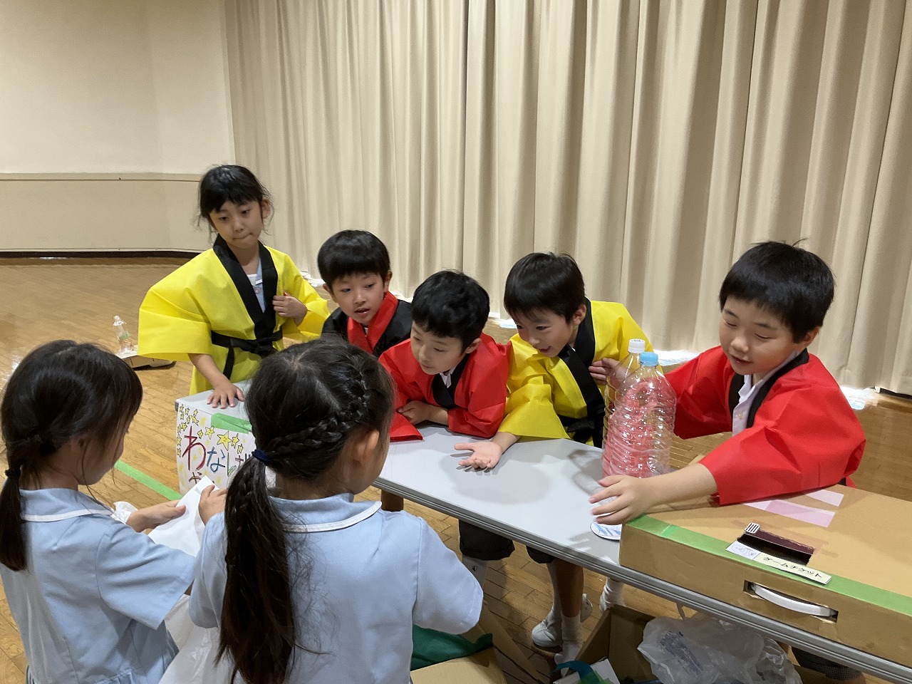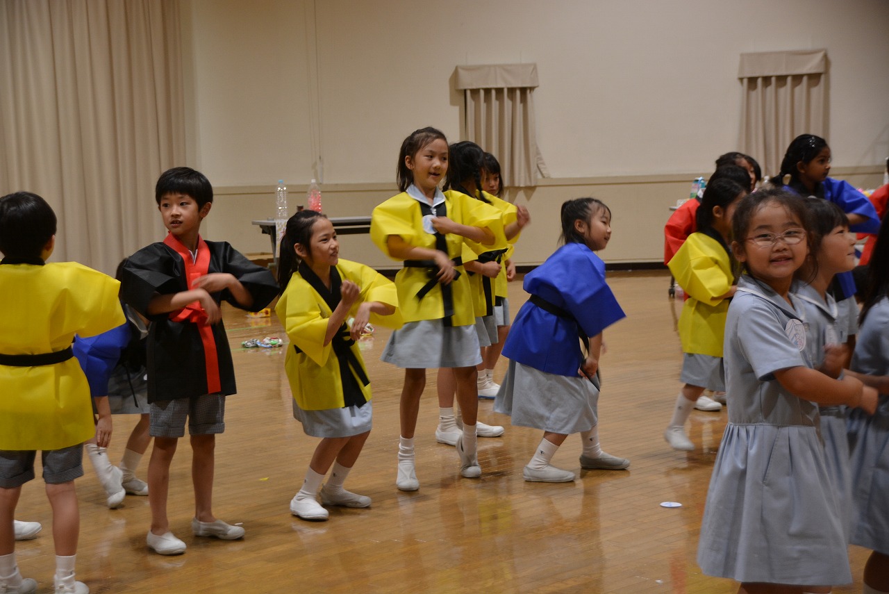 2年生が1年生に楽しんでもらうことを目的に「夏まつり」を計画しました。当日は、みんなで一緒にソーラン節を踊ったり、2年生が準備したゲーム屋さんで楽しく遊んだりしました。計画は大成功。1年生はみんなとても楽しそうでした。