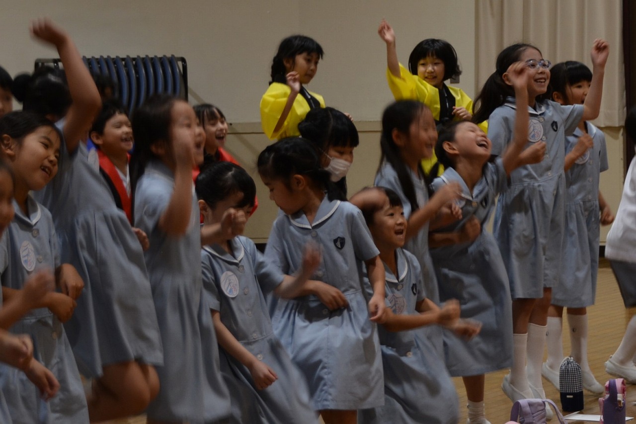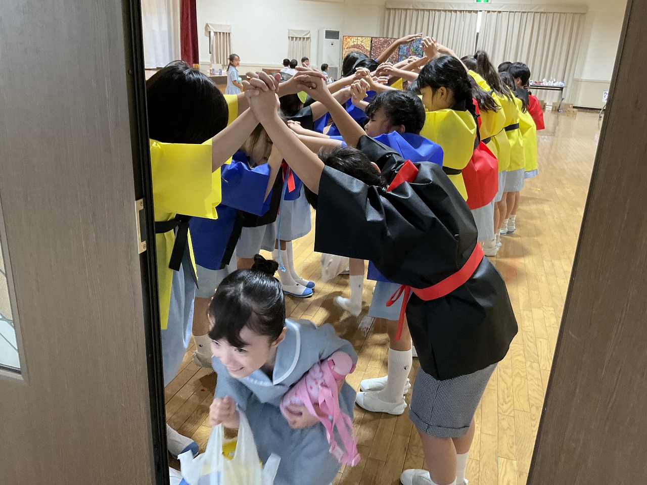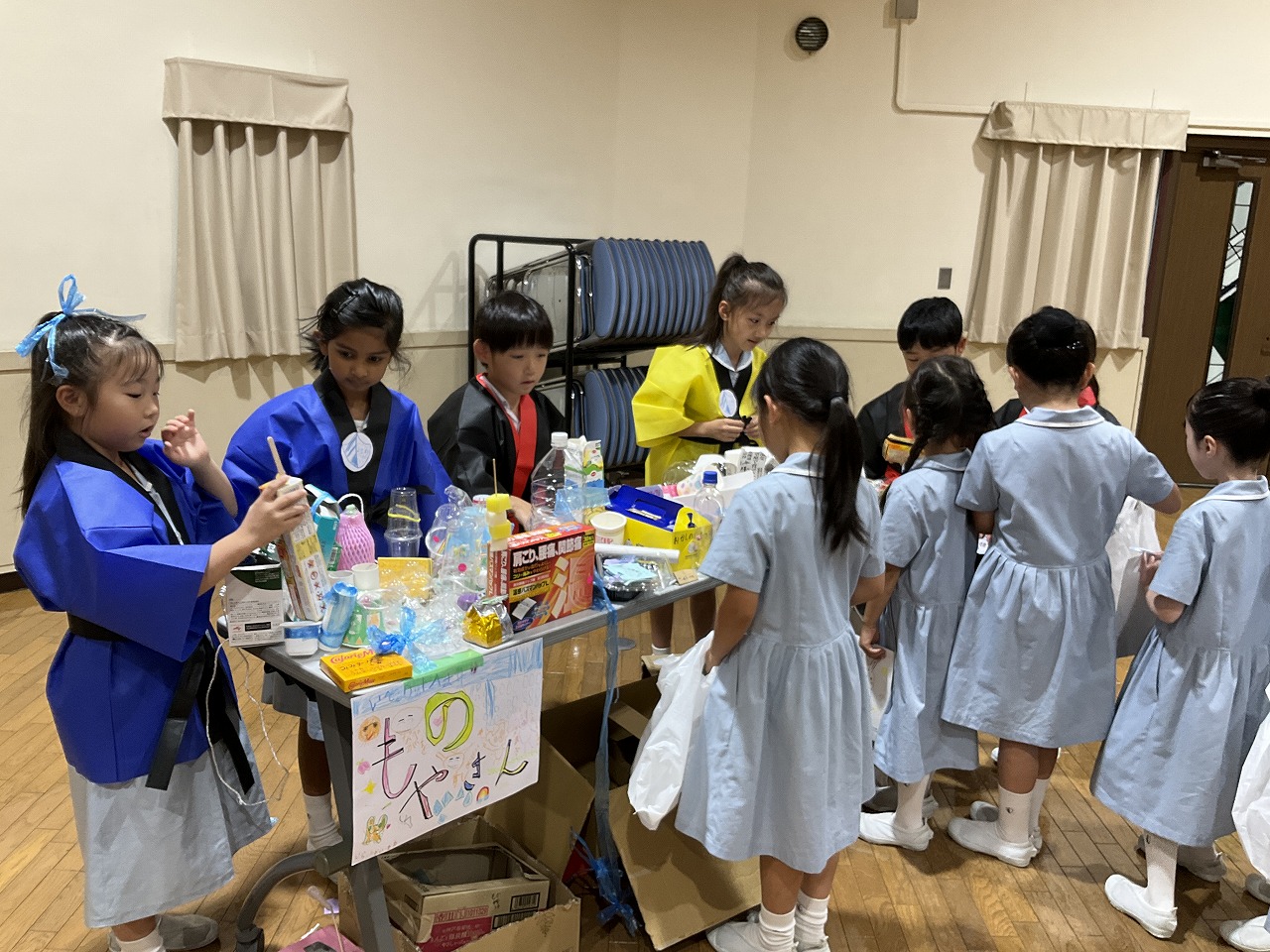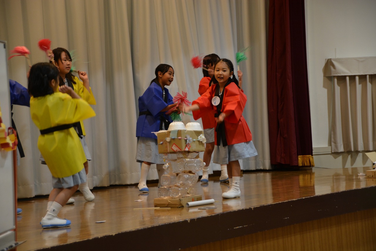 2年生が1年生に楽しんでもらうことを目的に「夏まつり」を計画しました。当日は、みんなで一緒にソーラン節を踊ったり、2年生が準備したゲーム屋さんで楽しく遊んだりしました。計画は大成功。1年生はみんなとても楽しそうでした。