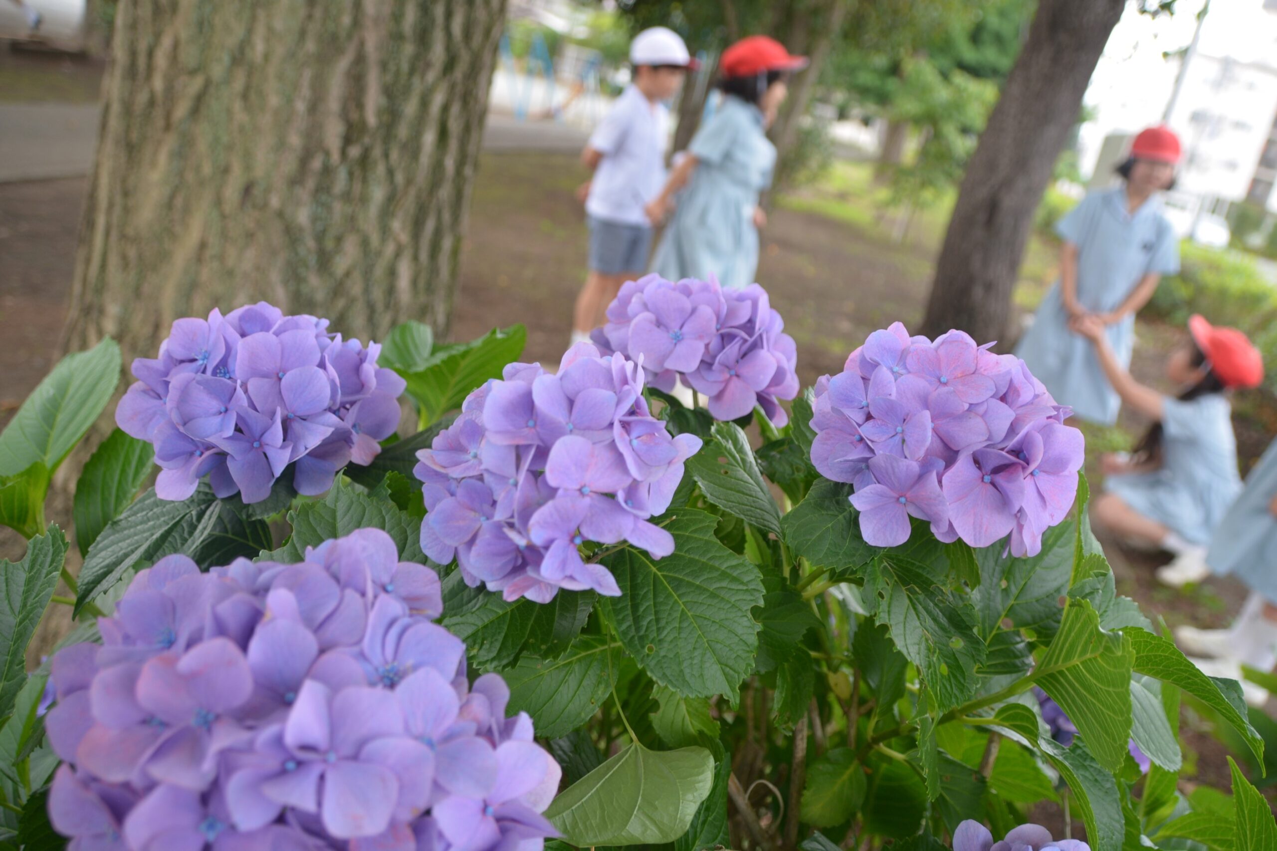 気候的には憂鬱な季節ですが、梅雨の季節にしかない魅力が聖セシリア小学校にはたくさんあります。校庭の横には熟したウメの実がたくさん落ちていて、辺り一面、甘い香りが漂っています。ビオトープでは、孵化したばかりの小さなメダカの赤ちゃんを観察することができます。校庭のユリやアジサイなどの植物はきれいな花を咲かせ、私たちの目を楽しませてくれています。