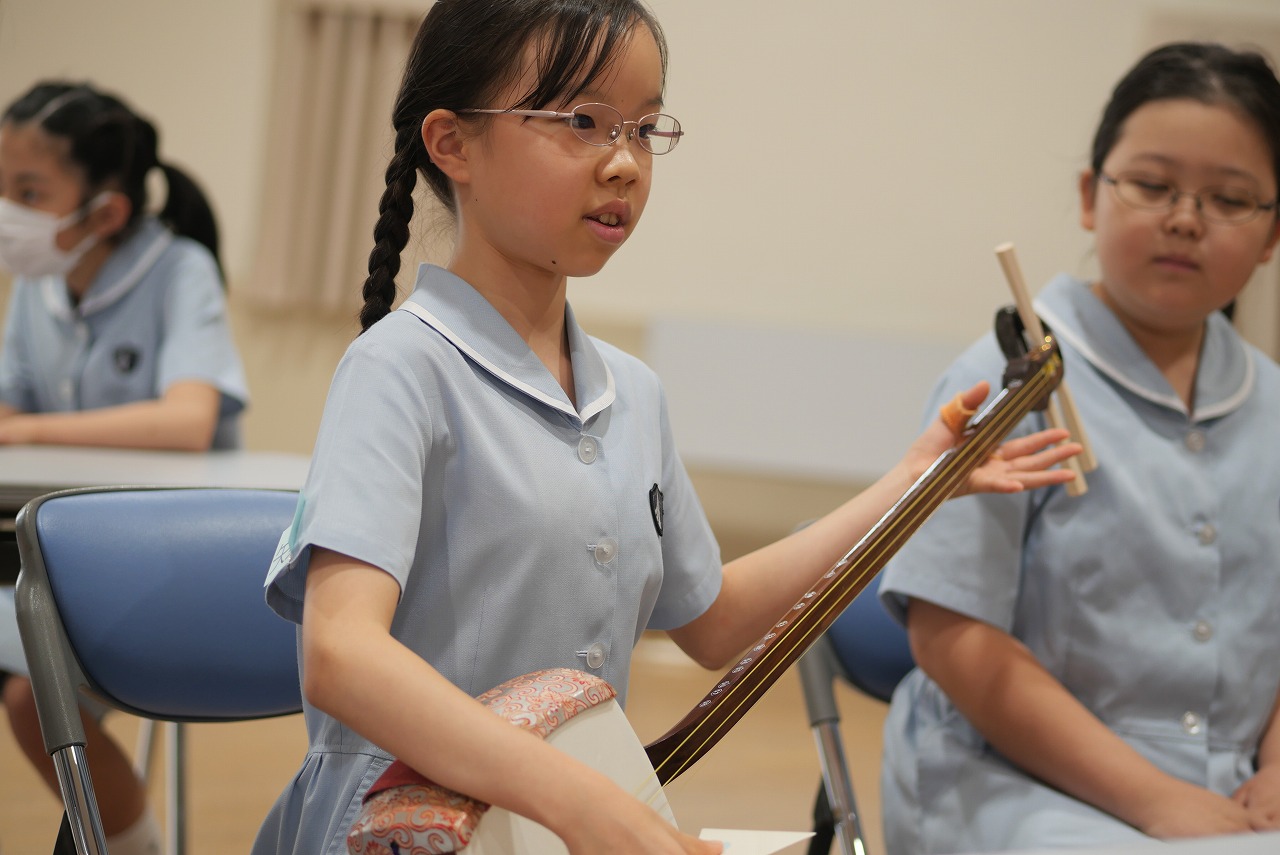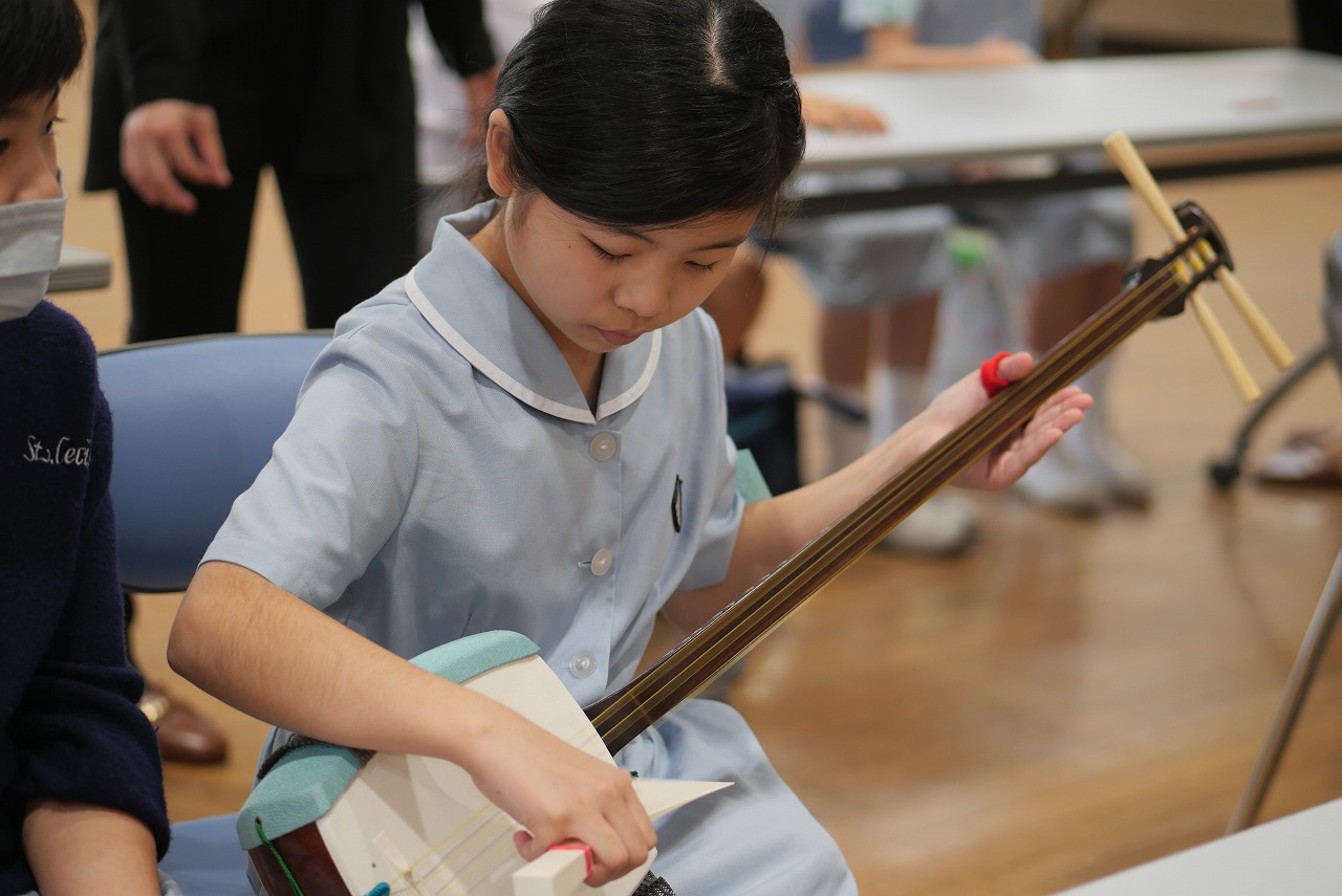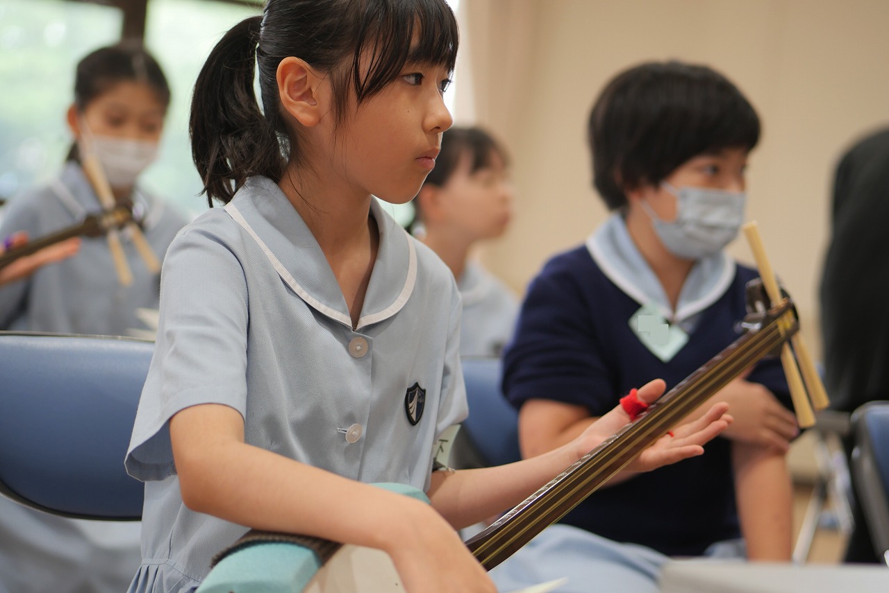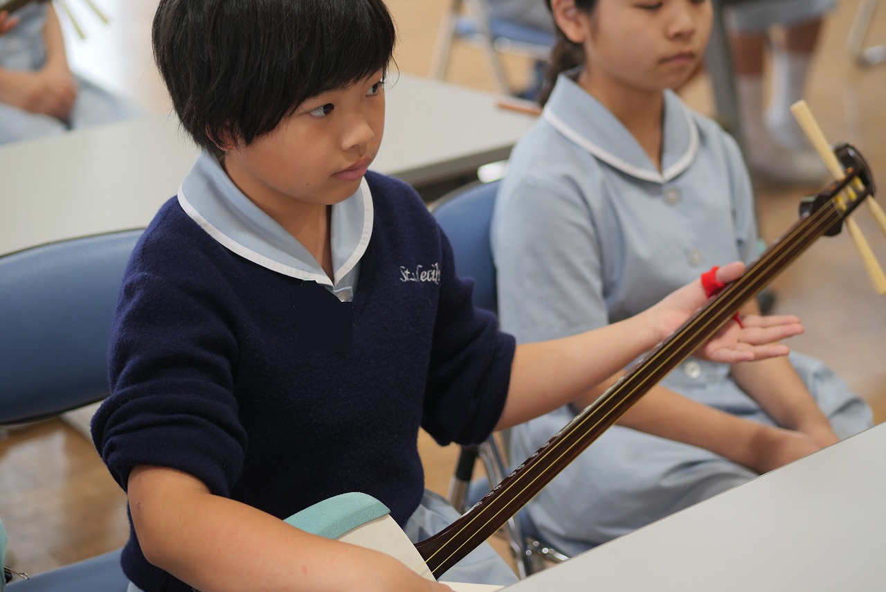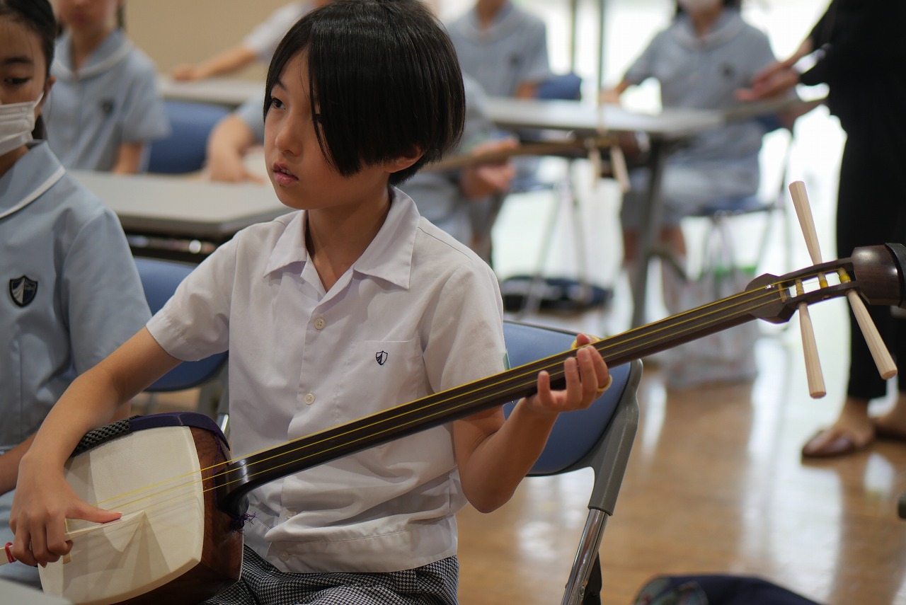 5年生が、文化庁の後援による「三味線体験」を行いました。三味線の体験だけでなく、日本の伝統芸能の歴史などについても3週間に渡って教わりました。最終日には発表会を行い「かごめかごめ」「名探偵コナン」「学園歌」の三曲を、三味線やヴィオラのプロの演奏家の方と一緒に演奏しました。