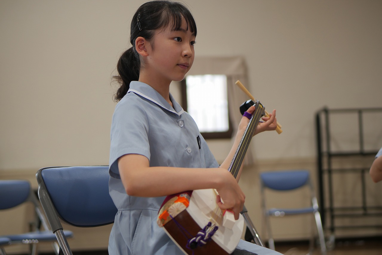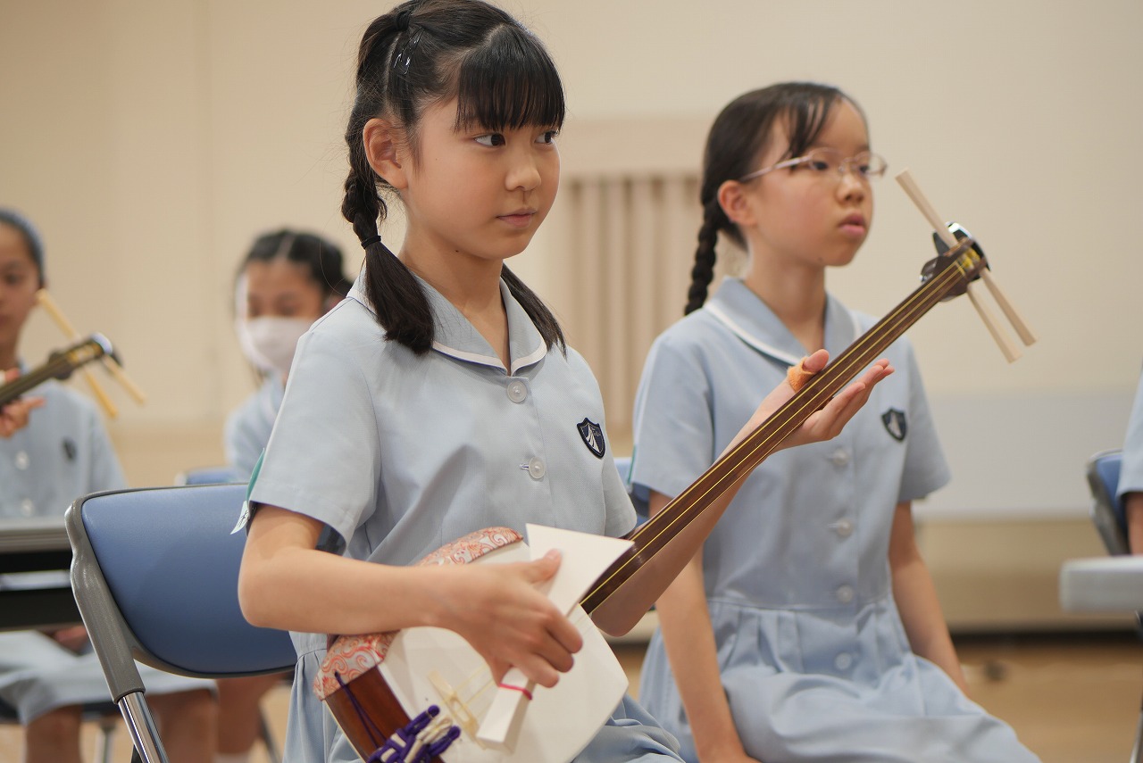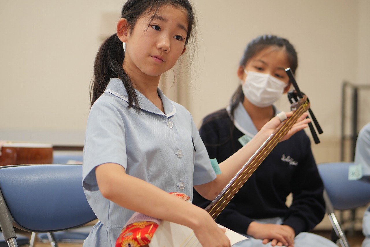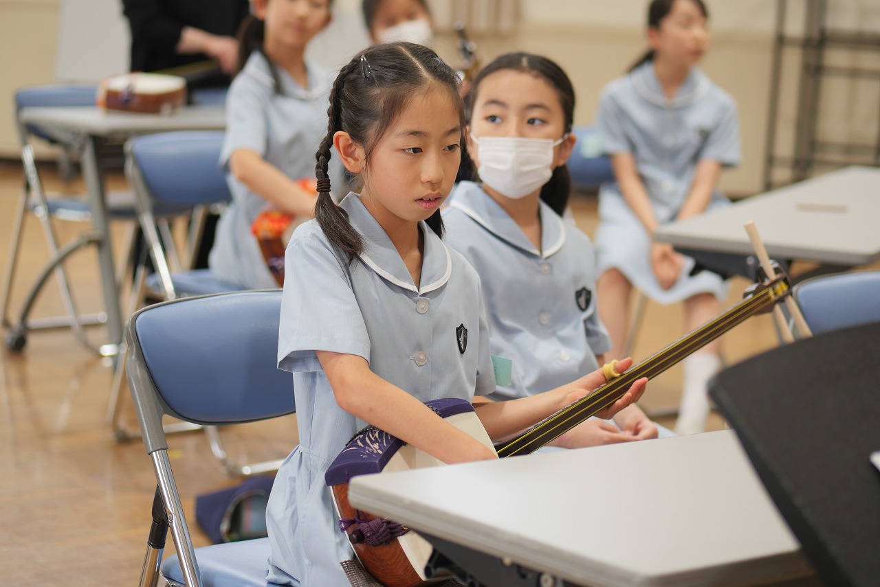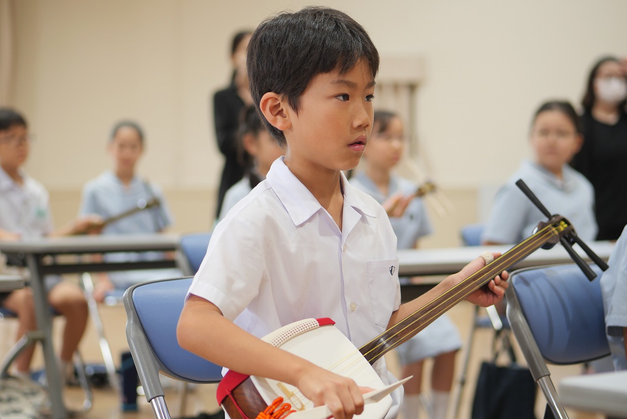 5年生が、文化庁の後援による「三味線体験」を行いました。三味線の体験だけでなく、日本の伝統芸能の歴史などについても3週間に渡って教わりました。最終日には発表会を行い「かごめかごめ」「名探偵コナン」「学園歌」の三曲を、三味線やヴィオラのプロの演奏家の方と一緒に演奏しました。