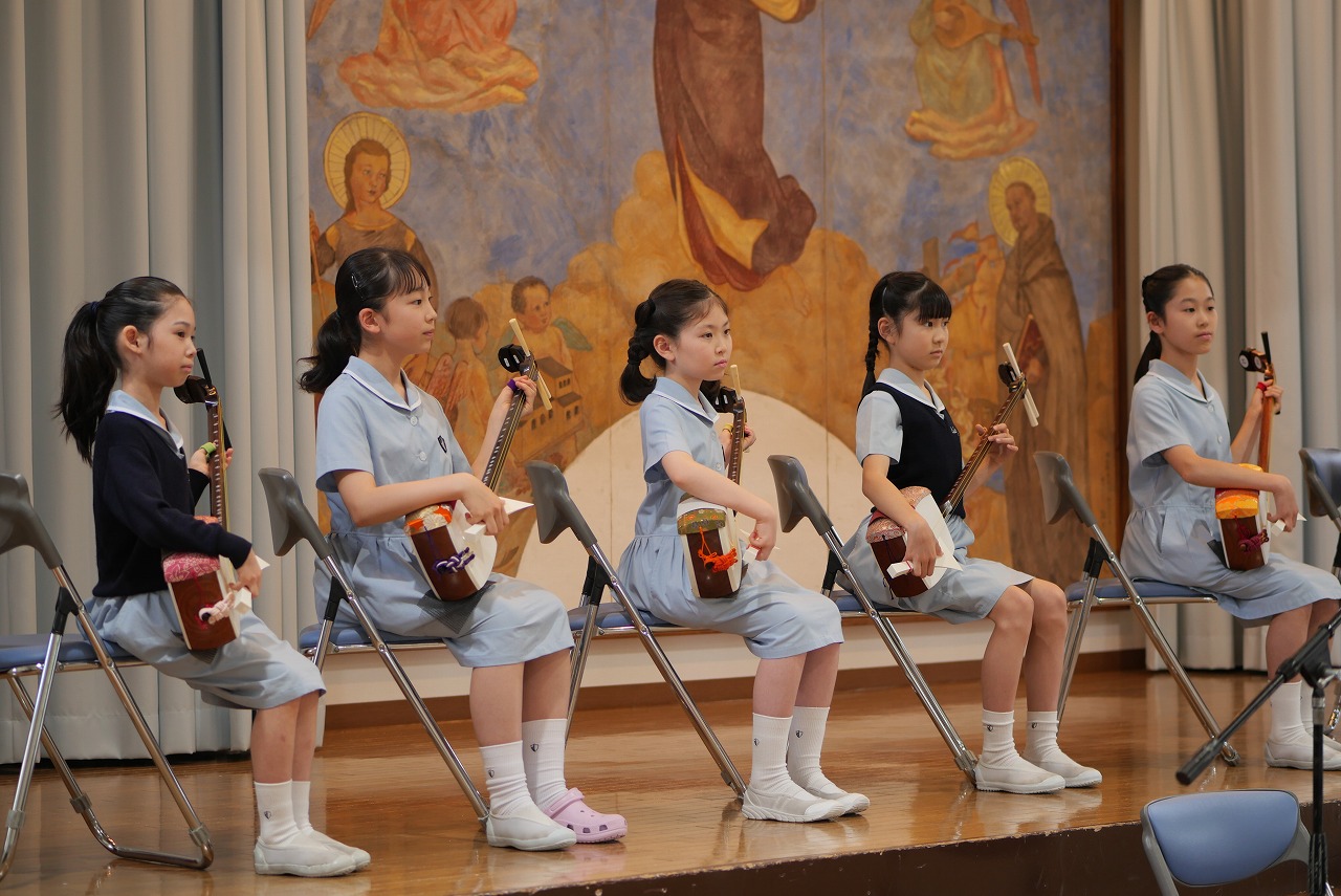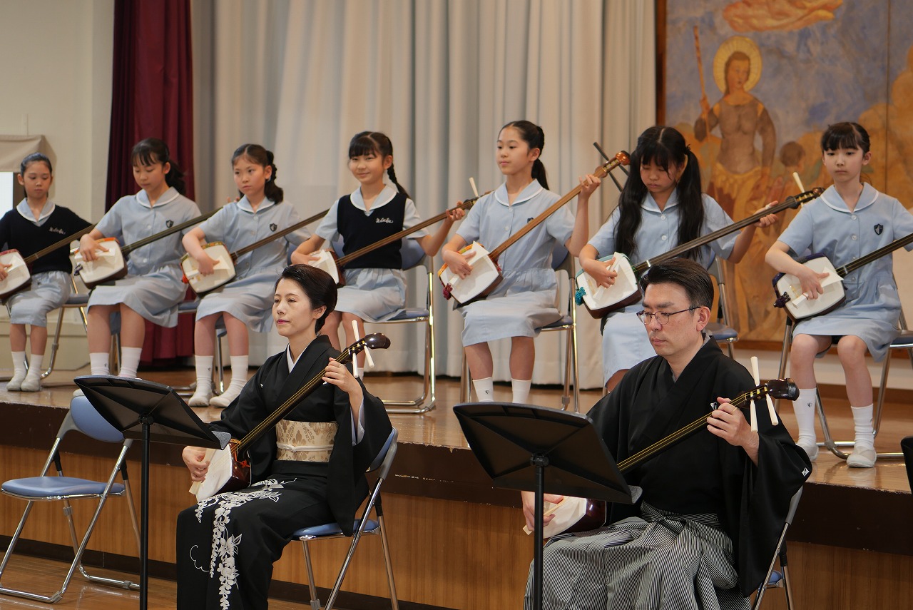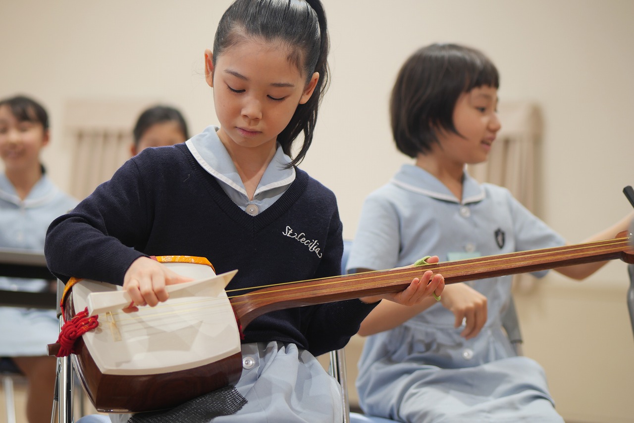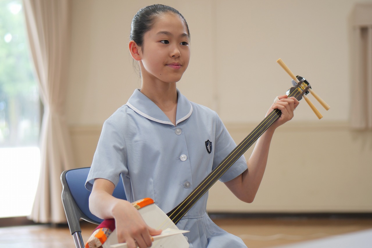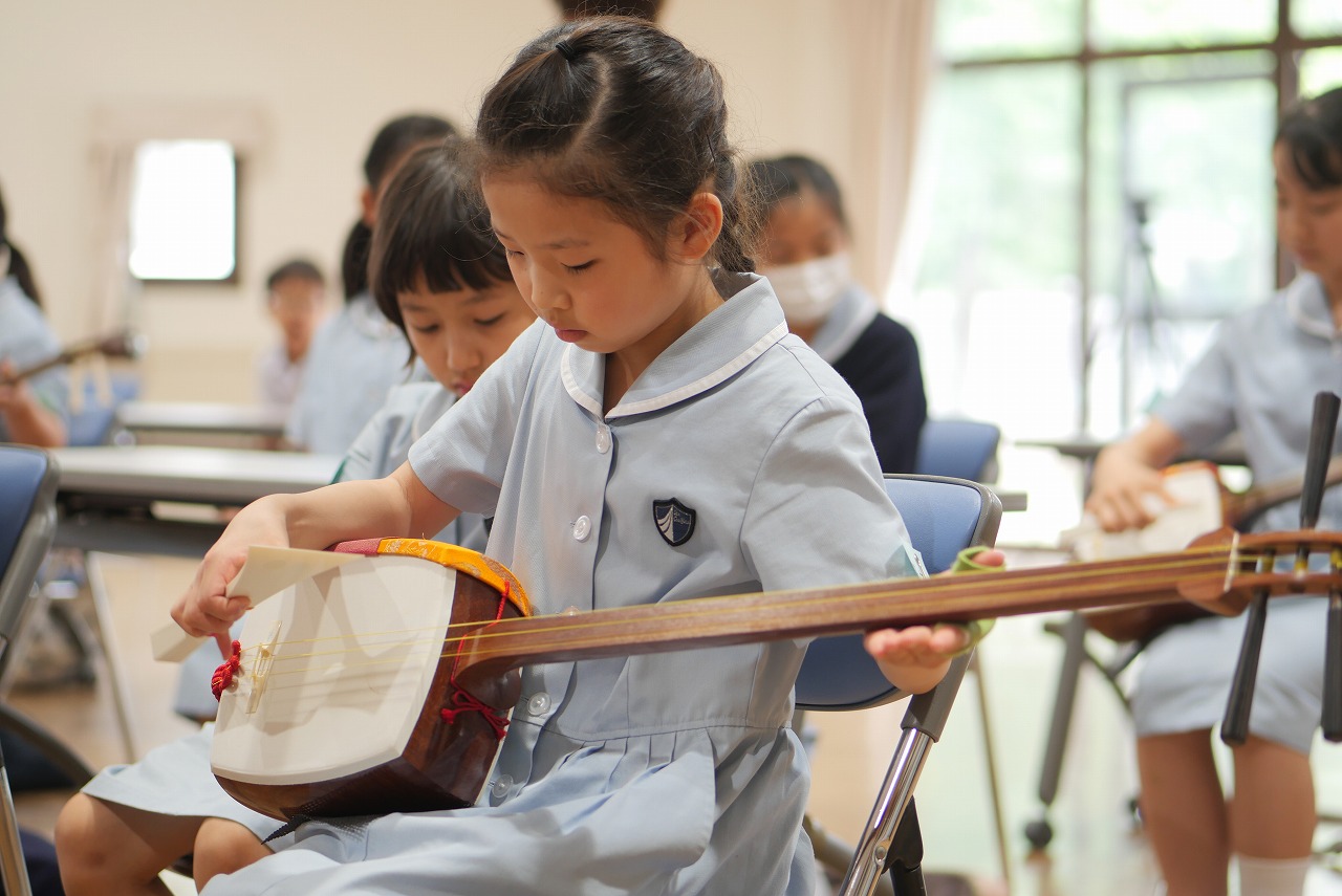 5年生が、文化庁の後援による「三味線体験」を行いました。三味線の体験だけでなく、日本の伝統芸能の歴史などについても3週間に渡って教わりました。最終日には発表会を行い「かごめかごめ」「名探偵コナン」「学園歌」の三曲を、三味線やヴィオラのプロの演奏家の方と一緒に演奏しました。