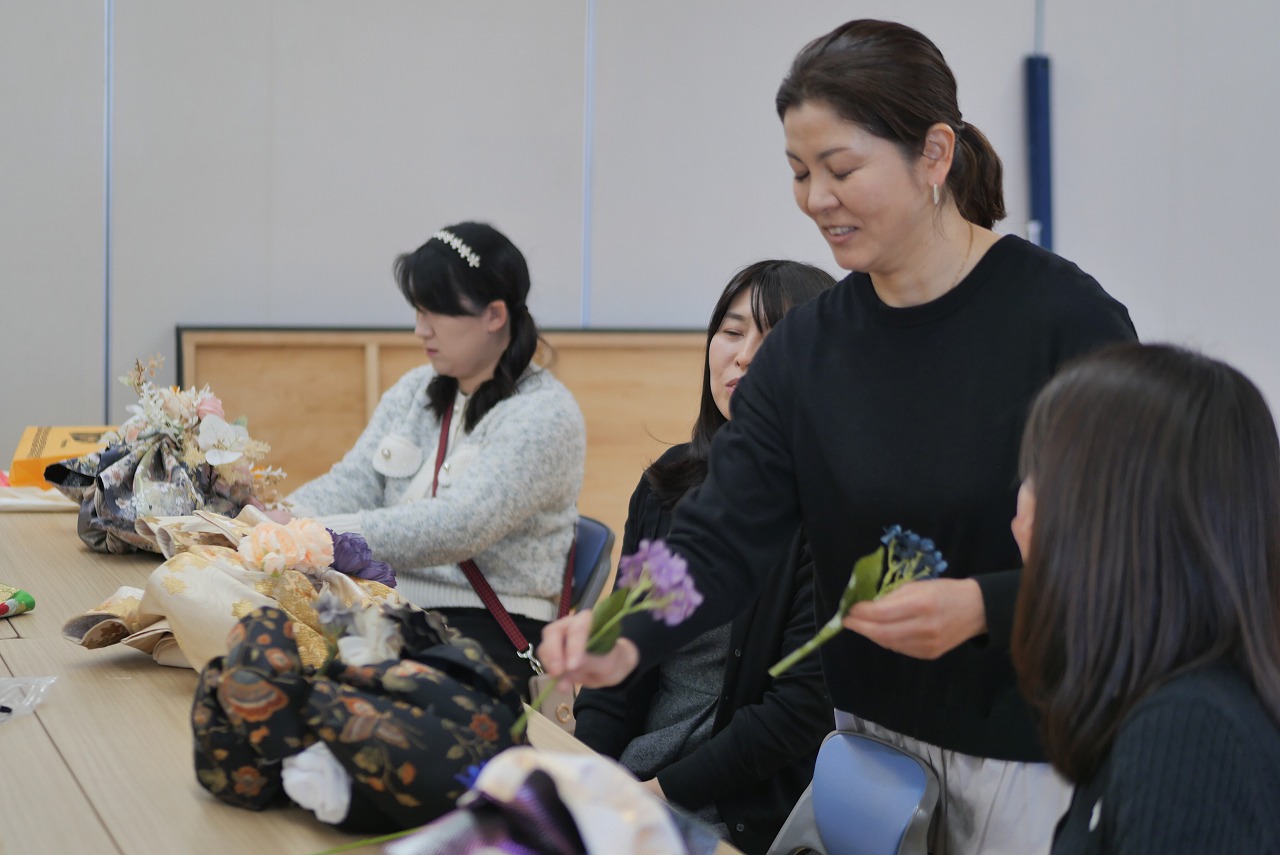 保護者を対象とした帯フラワー講座を実施しました。講師は、本校の卒業生で、1級着付け技能士の資格をもっている先生です。家庭で眠っている帯を使って、美しい作品を作りました。日本の伝統美の新たな表現となりました。現在、校内のギャラリーに展示中です。来校の際はぜひご覧になってください。