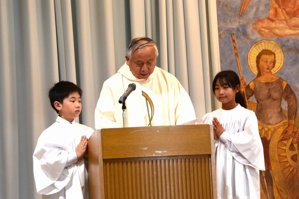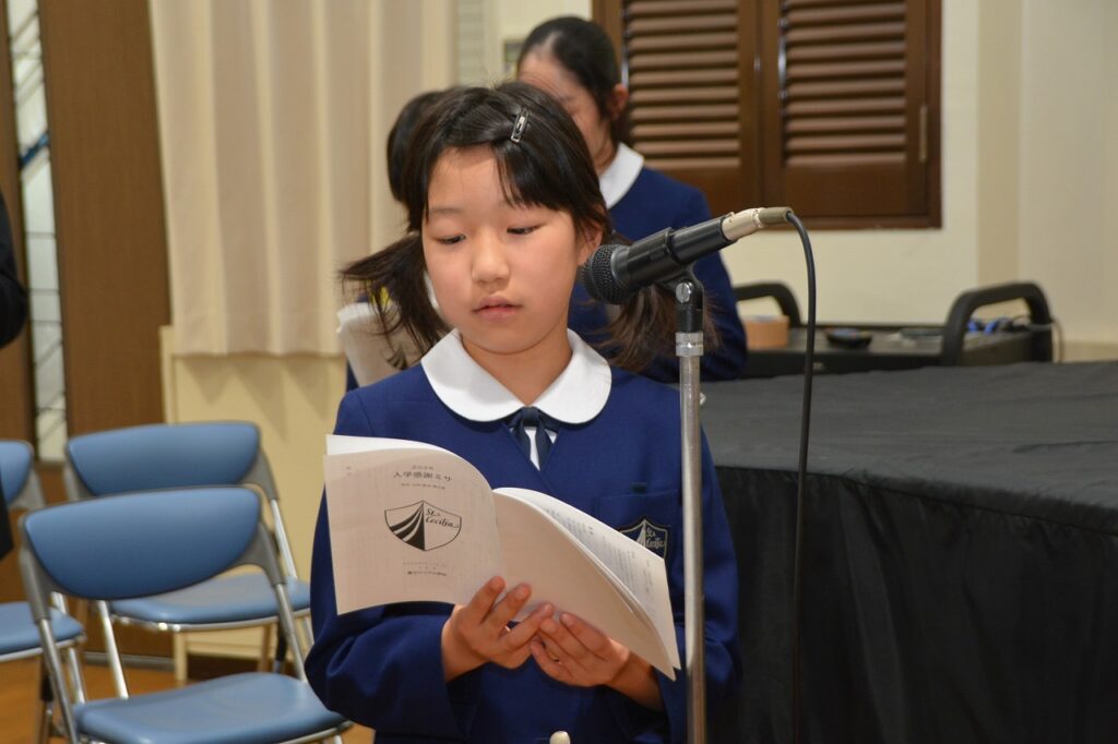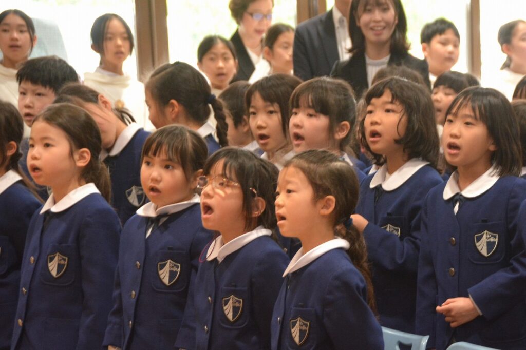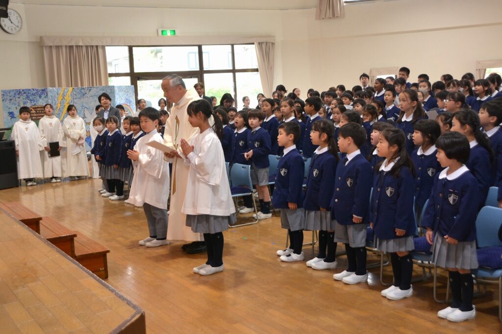 新1年生の入学をお祝いする入学感謝ミサに与りました。2~6年生たちは、新入生を迎えたことに感謝してお祈りをしました。1年生は、しっかり手を合わせて、新しいお友だちがたくさんできたことに感謝しました。新1年生と保護者の方々は、神父様からひとりひとりご祝福もいただきました。