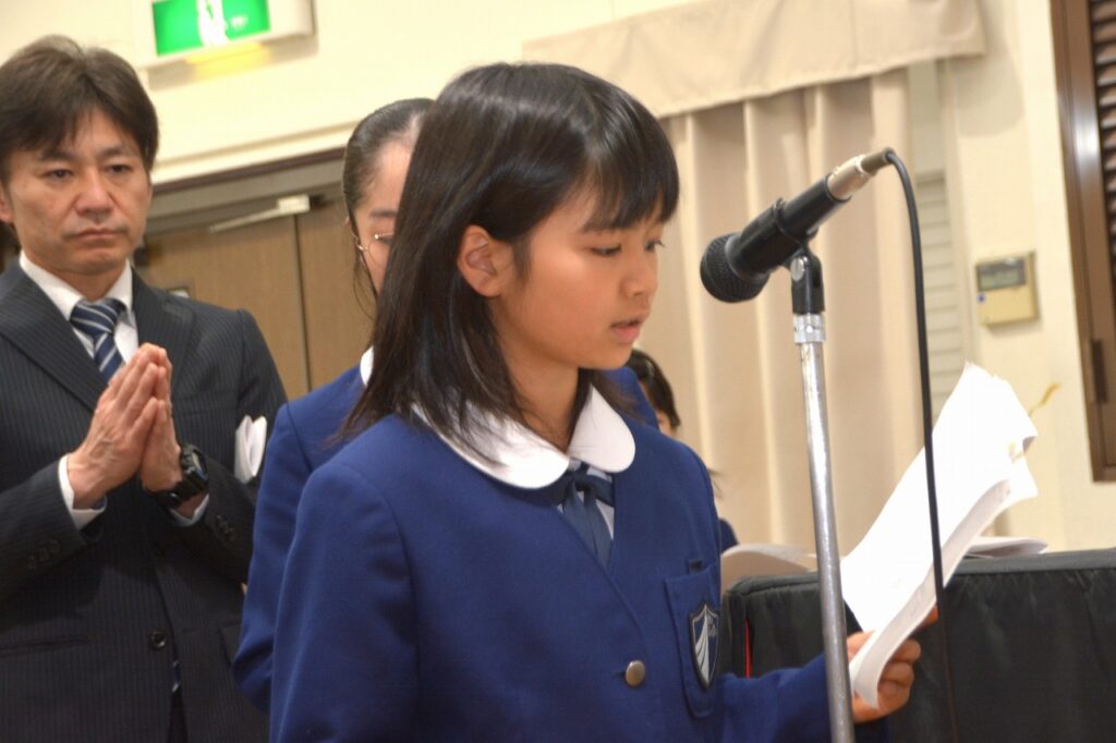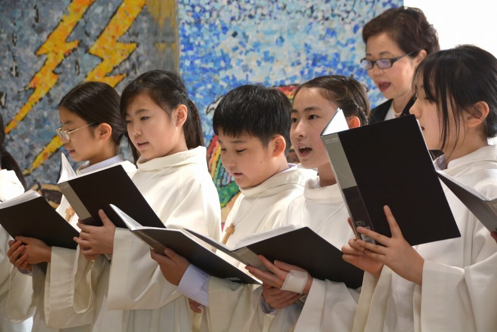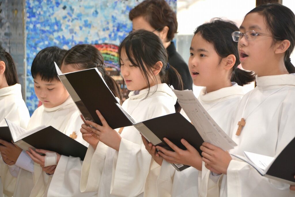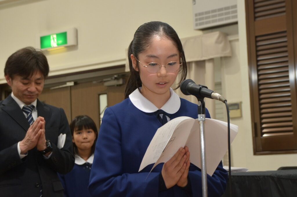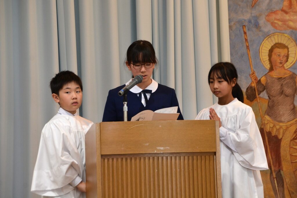 新1年生の入学をお祝いする入学感謝ミサに与りました。2~6年生たちは、新入生を迎えたことに感謝してお祈りをしました。1年生は、しっかり手を合わせて、新しいお友だちがたくさんできたことに感謝しました。新1年生と保護者の方々は、神父様からひとりひとりご祝福もいただきました。