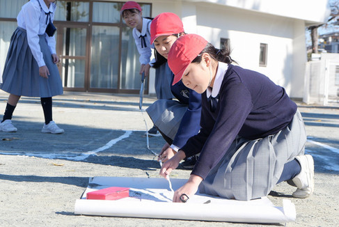 6年生が校庭で「相似」の学習をしました。教室でプリントに描いたクリスマスツリーの絵を、50倍にするとどうなるかをグループごと話し合い、計算しながら長さを求め、ラインカーや巻き尺などを使って実際に校庭に描きました。休み時間には、校舎の2階から他学年の児童が、大きなクリスマスツリーの絵を楽しそうに眺めていました。